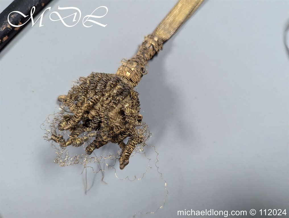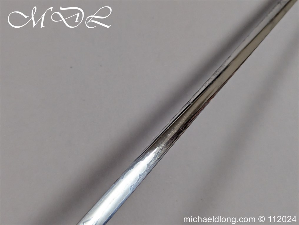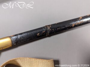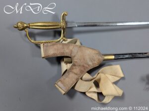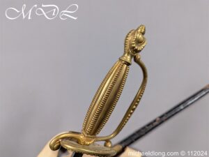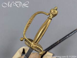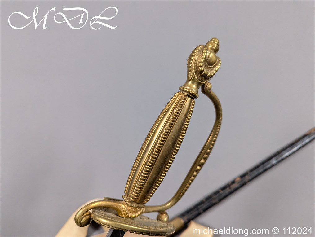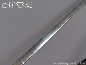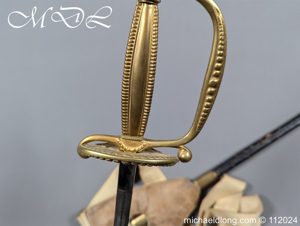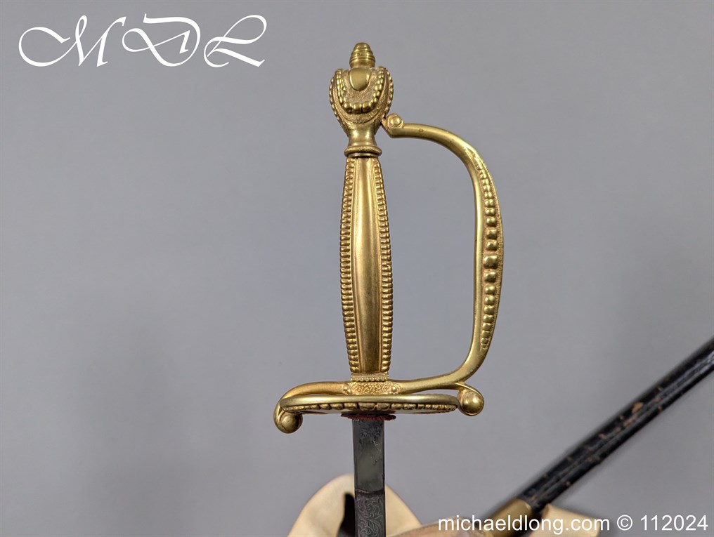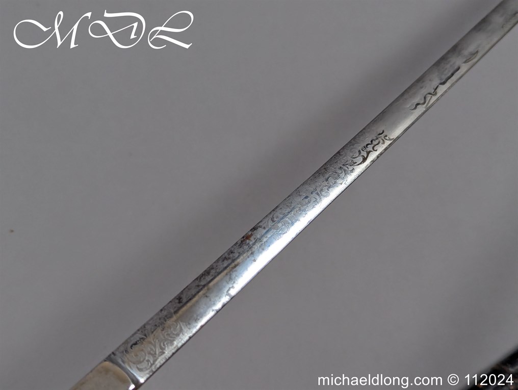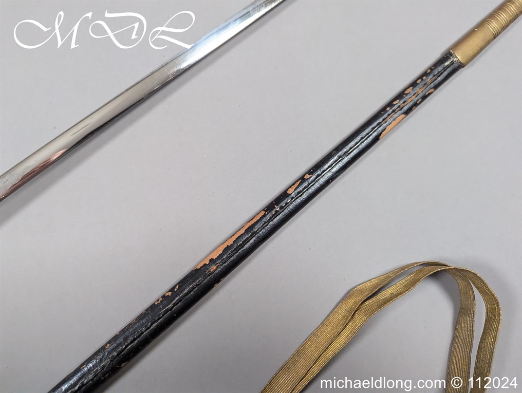Edwardian British Court Sword retailed by Henry Poole and Co London , gilt brass hilt with shell guard and dress knot. The blade in super condition etched with crossed lancers, floral decoration and retailers name. It is complete with black leather scabbard with matching mounts one crease near top mount please see image plus frog belt