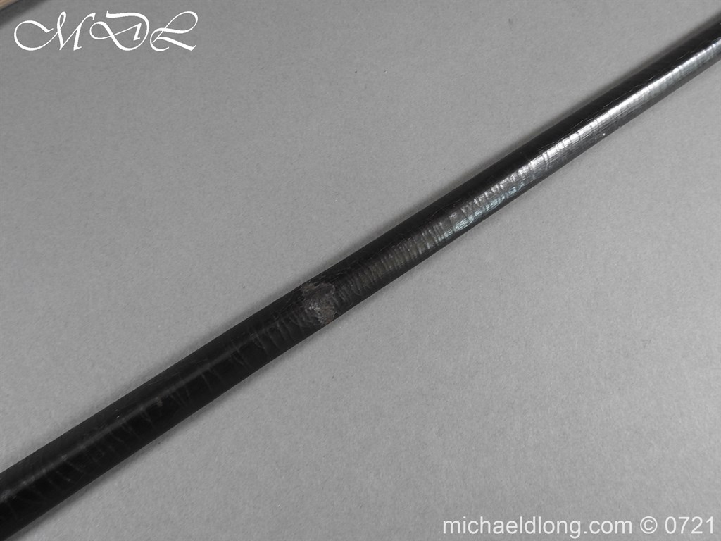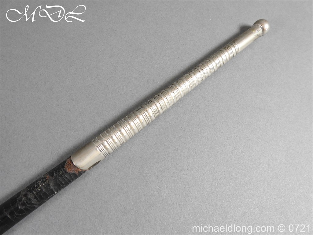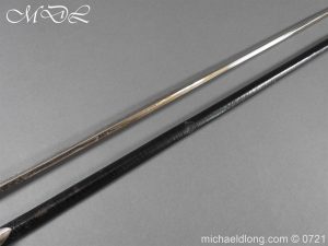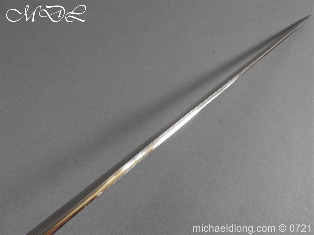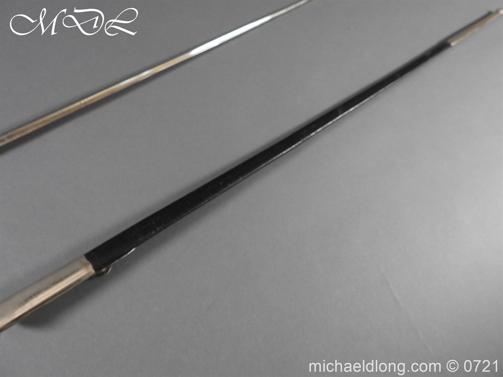 British Cut Steel Small Sword Edwardian period in very good condition. Plated steel hilt with facetted pommel grip and shell guard. Slim triangular section blade etched with floral decoration and retails details J B Adams & Co London. Complete with wood covered black leather scabbard with reded steel mounts.