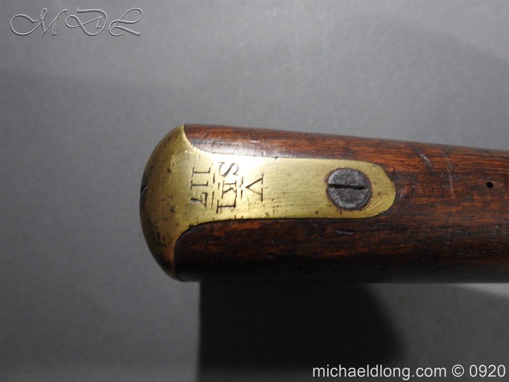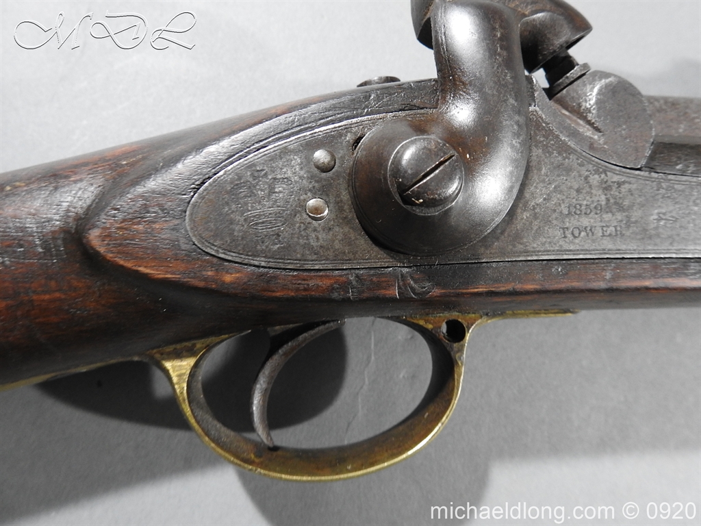 Enfield 3 Band Rifle Dated 1859 showing age wear but in full working order. Lock plated engraved with VR crown 1859 Tower and inspection mark. Full stocked with issue mark the butt plate engraved V S K I 117 complete with brass trigger guard and ram rod UK delivery address only
