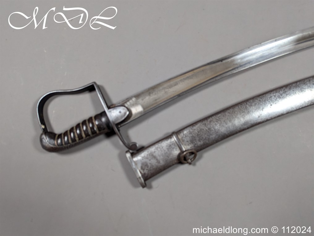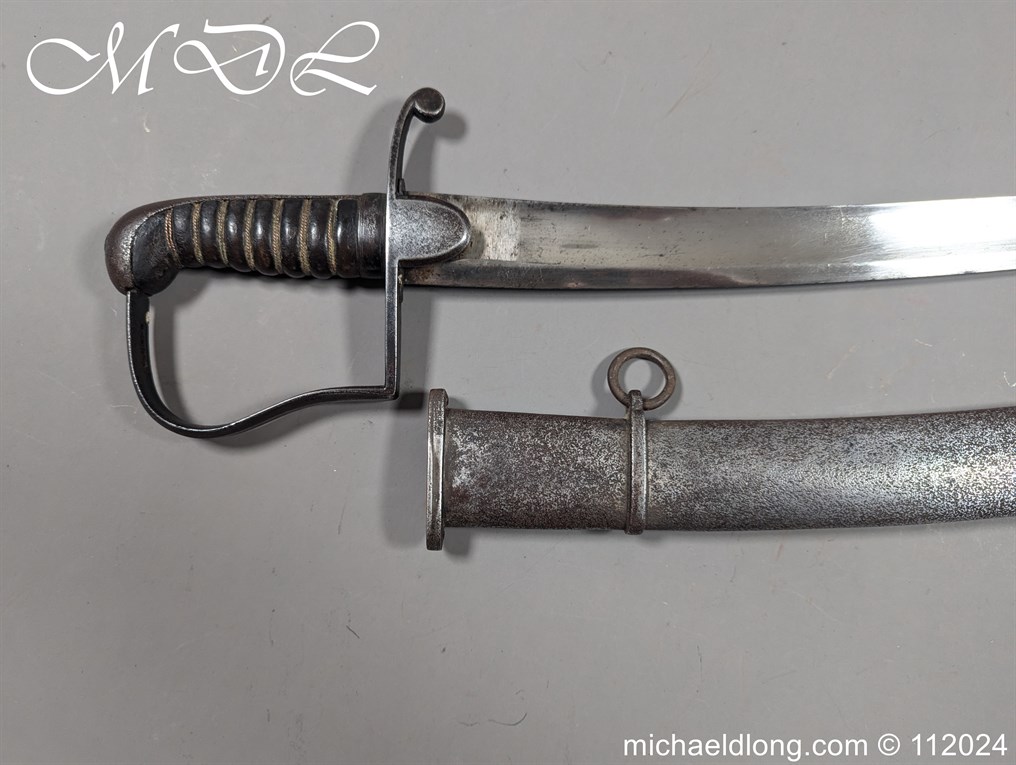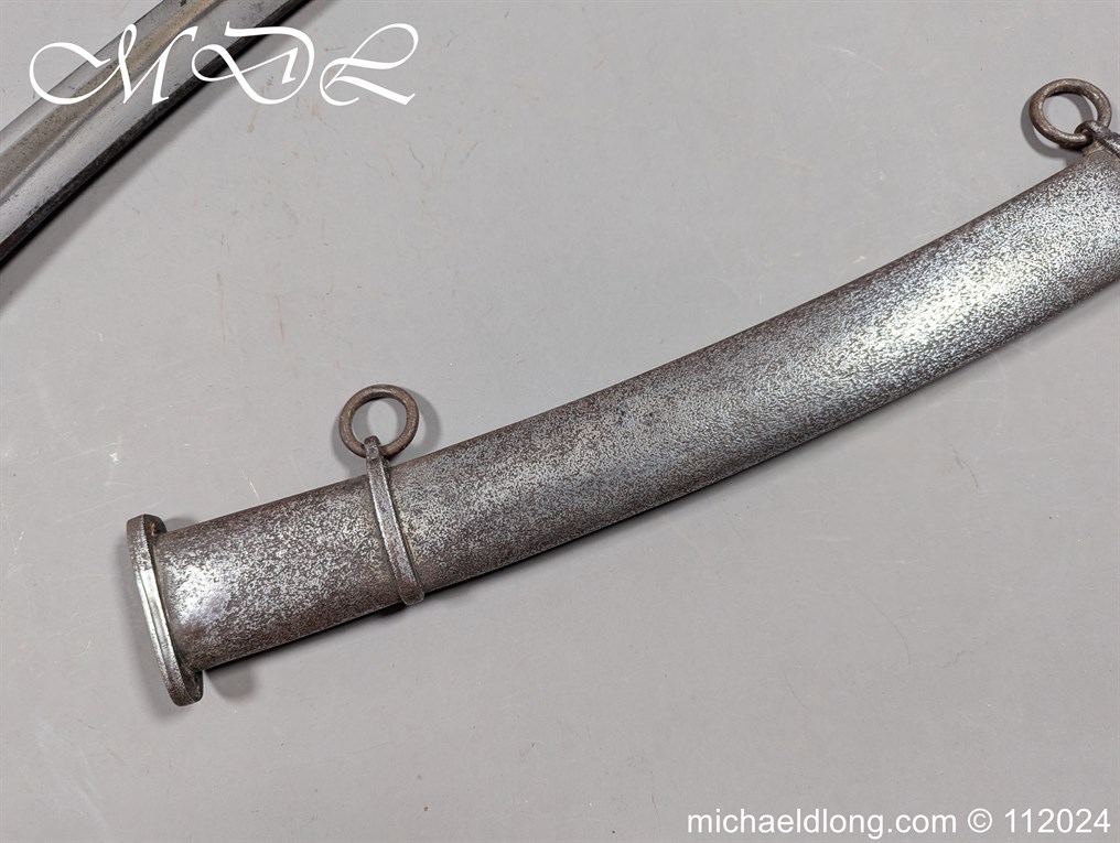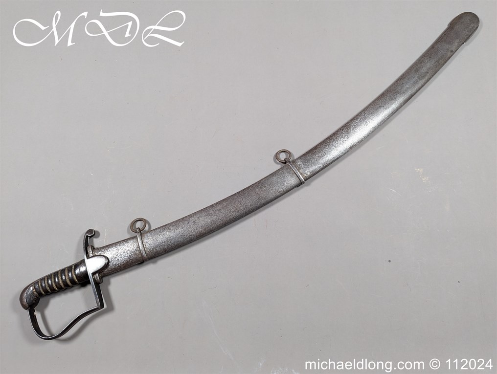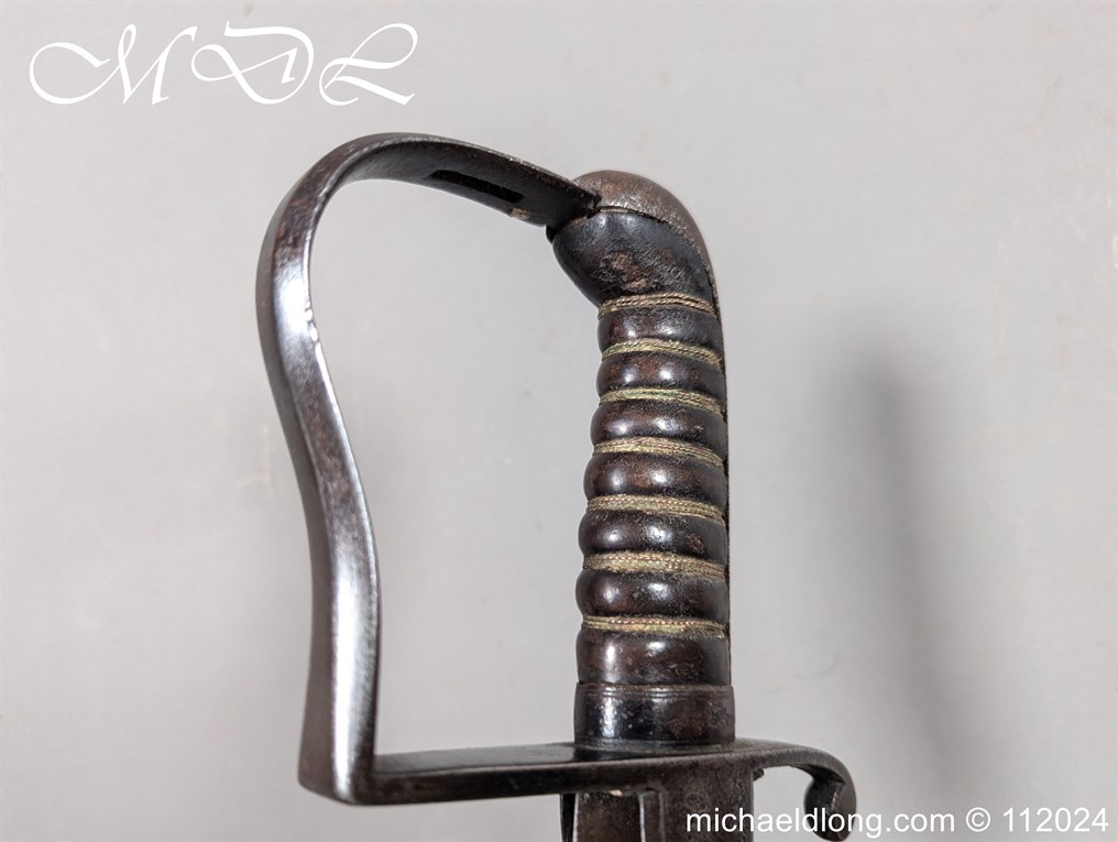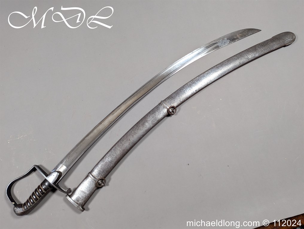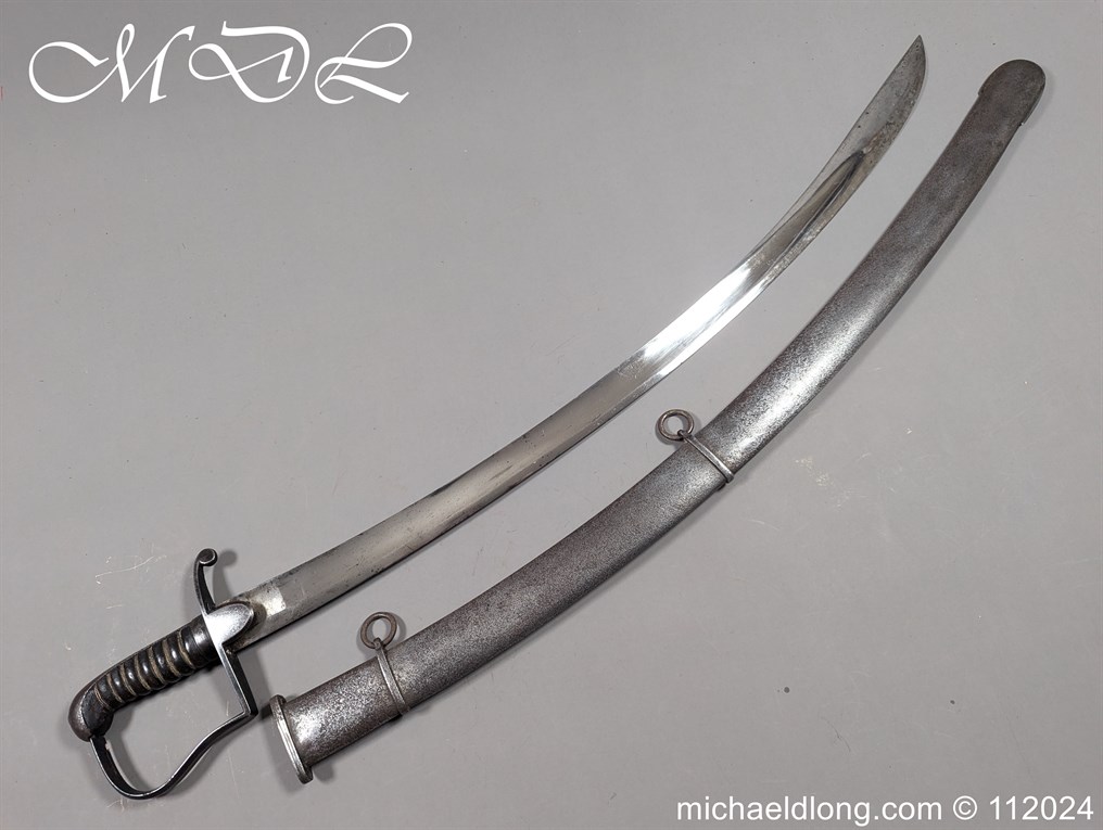 English 1796 Officers Light Cavalry Sword, regulation sword with steel hilt and leather bound grip secured by twisted wire. The blade slightly curved and in very good condition no makers mark and complete with matching steel scabbard. Overall length 92cm the blade 79.5cm