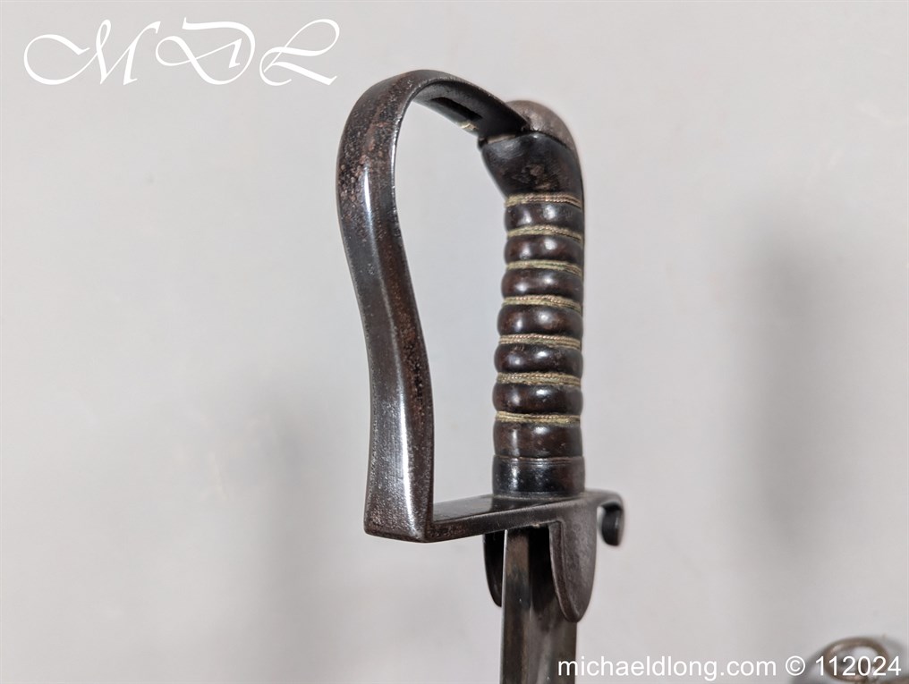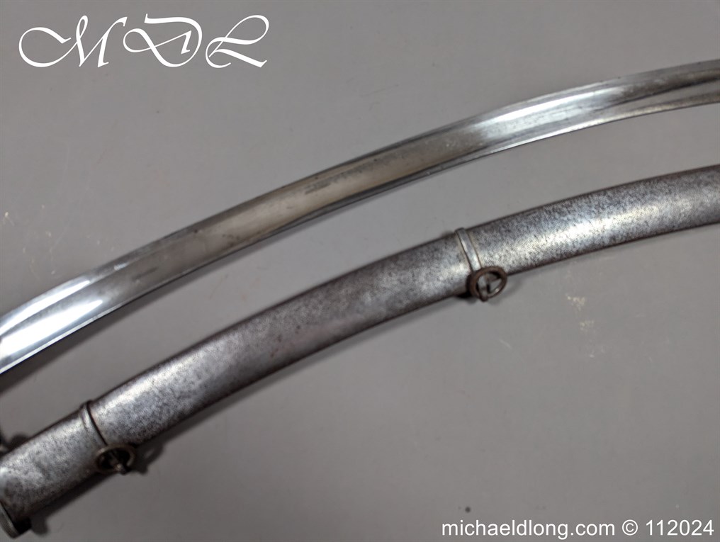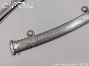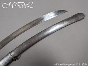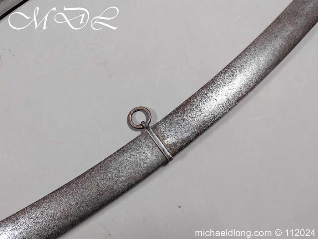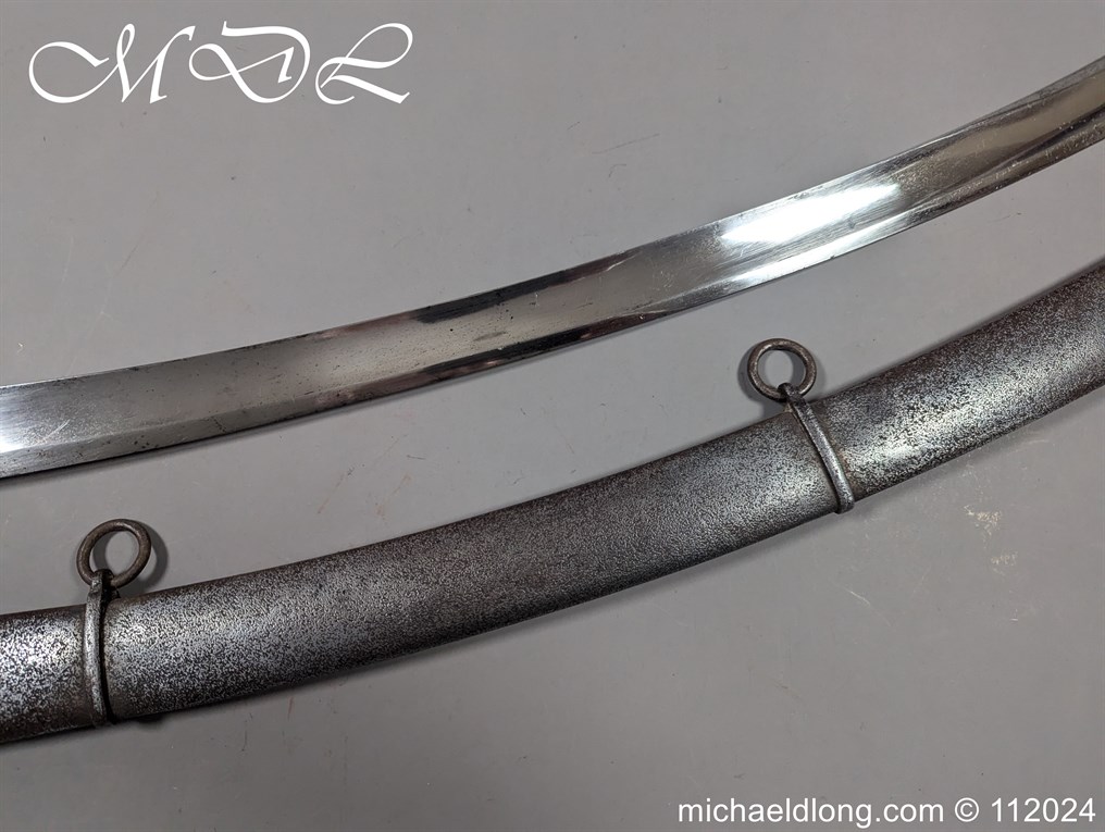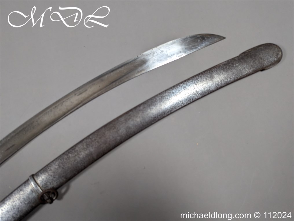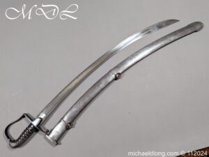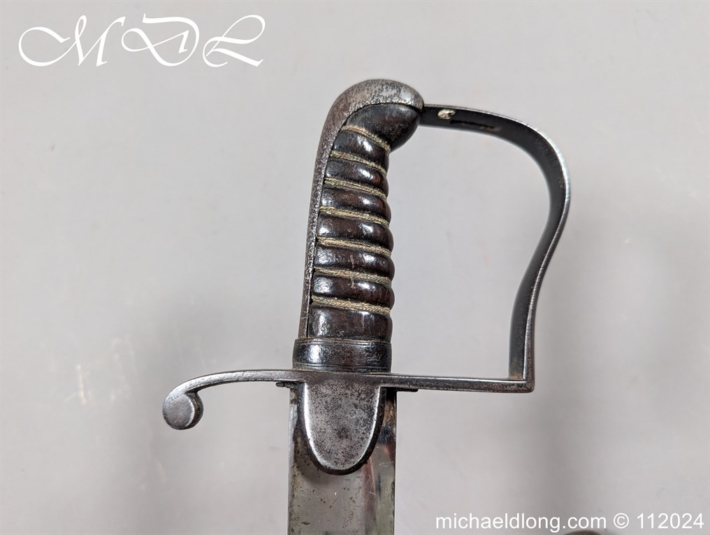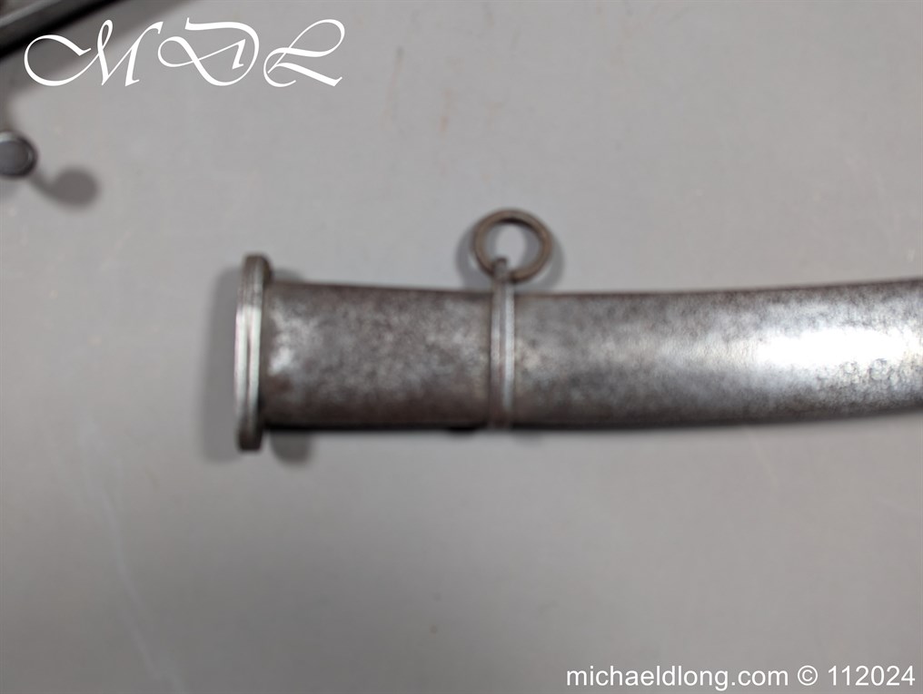 English 1796 Officers Light Cavalry Sword, regulation sword with steel hilt and leather bound grip secured by twisted wire. The blade slightly curved and in very good condition no makers mark and complete with matching steel scabbard. Overall length 92cm the blade 79.5cm