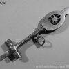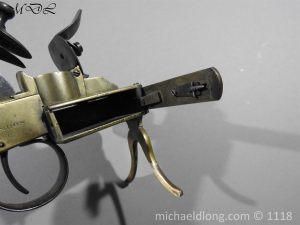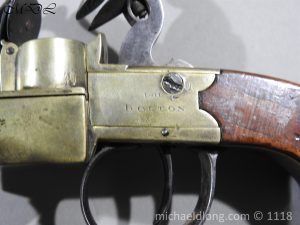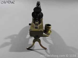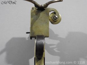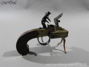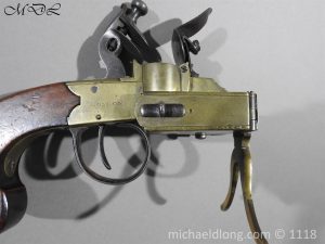 Large box-lock type mechanism, with iron rear hammer, wide brass pan provided with iron batterie, under that a wide, parallelepiped-shaped compartment for the tinders, provided with lateral opening with iron button. At the front a candle holder and a brass fork. Iron trigger guard and trigger, smooth wooden grip. Brass frame maker marked Bolton – Height: 15cm – Length: 17cm Width: 7cm