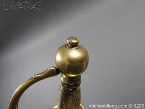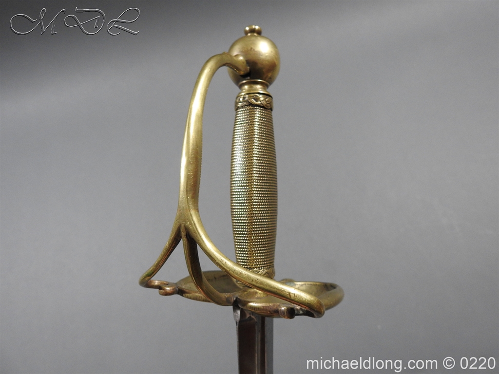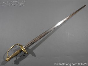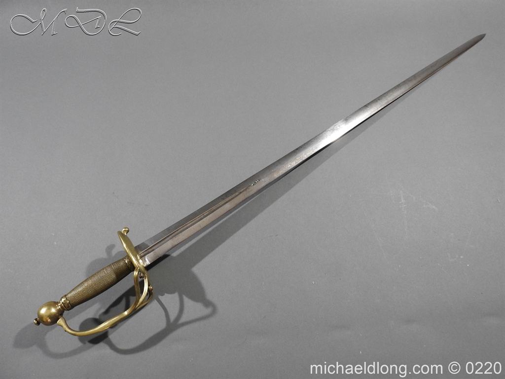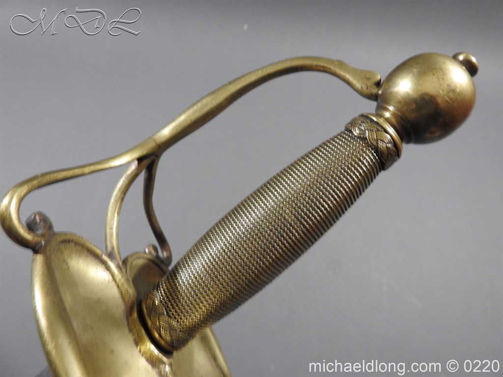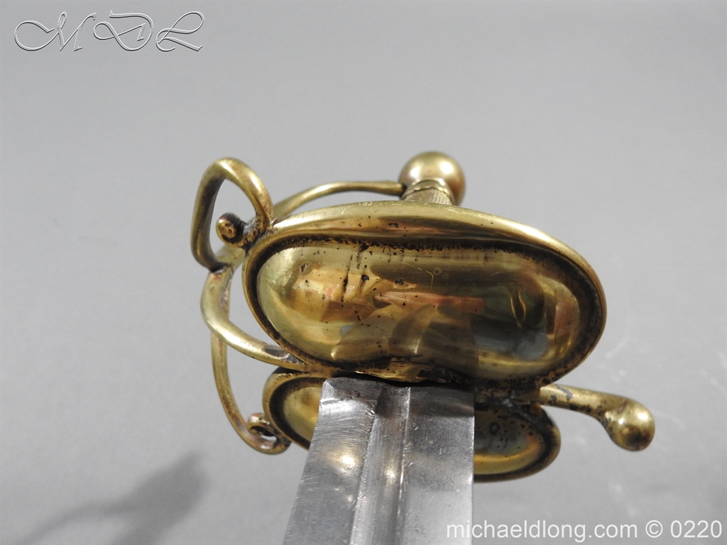 English Cavalry Sword late 17th century in excellent condition with tapering blade stamped with a series of marks within a short fuller and stamped with the armour’s mark, on each face, brass hilt comprising moulded quillon, a pair of moulded ring-guards each filled with a shallow plate, knuckle-guard joined by a pair of scrolling bars to the ring-guards, globular pommel, and wooden grip bound with plaited copper wire and a ‘Turks’ head top and bottom 82cm; 32 1/4in blade This sword is part of a large series formerly preserved in the 17th Century armoury at Shirburn Castle by the Gage family. Overall length 39 inches 100cm blade 32 inches 82cm