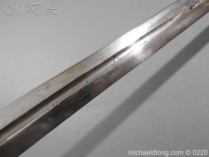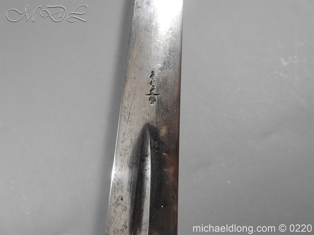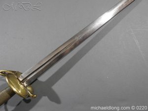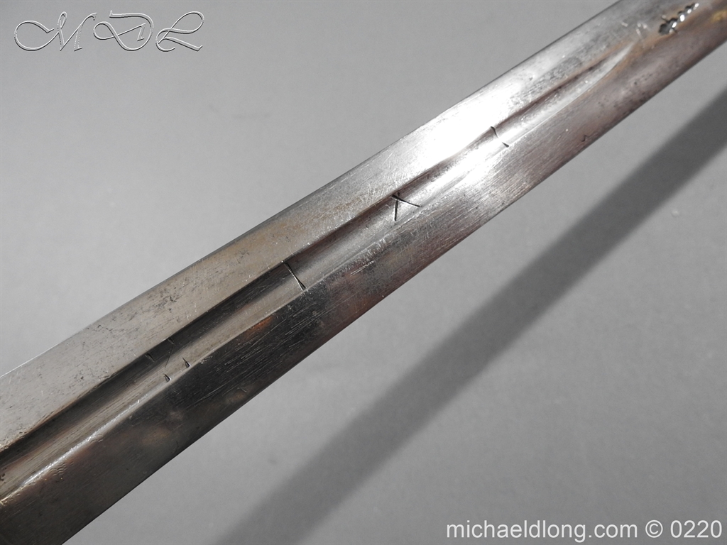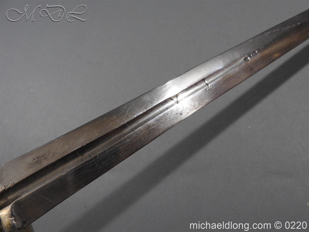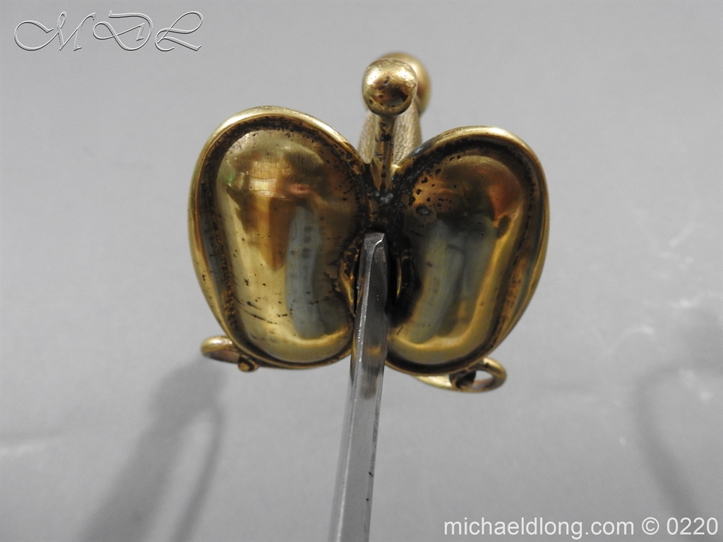 English Cavalry Sword late 17th century in excellent condition with tapering blade stamped with a series of marks within a short fuller and stamped with the armour’s mark, on each face, brass hilt comprising moulded quillon, a pair of moulded ring-guards each filled with a shallow plate, knuckle-guard joined by a pair of scrolling bars to the ring-guards, globular pommel, and wooden grip bound with plaited copper wire and a ‘Turks’ head top and bottom 82cm; 32 1/4in blade This sword is part of a large series formerly preserved in the 17th Century armoury at Shirburn Castle by the Gage family. Overall length 39 inches 100cm blade 32 inches 82cm
