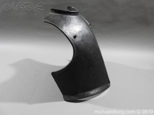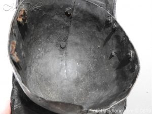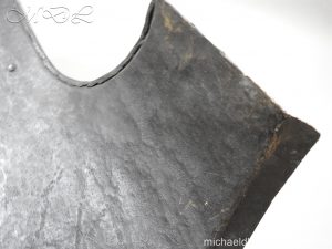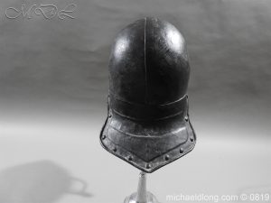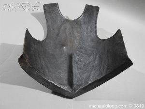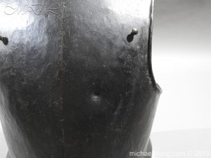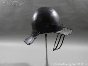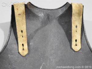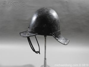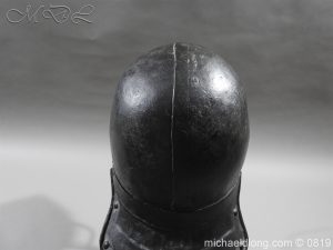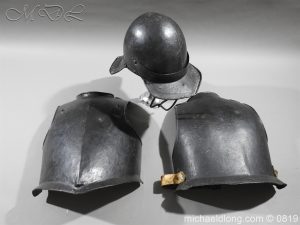 The helmet of classic form, with a two piece skull, with a single-piece neck-guard embossed with three simulated lames, a pivoted peak fitted with three face bars and struck with armours stamp please see images.The breastplate made of a single plate, forged into the typical form with low medial ridge drawn out to a small point on the base, plain turned edges at the neck and armpits. It is fitted with a pair of studs for the shoulder straps, and has a short flared skirt. Musket ball proof and marked M W The backplate forged from a single plate, plain turned edges at the neck and armpits. The backplate is connected to the breastplates by two buff leather shoulder straps and a waist belt