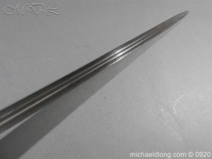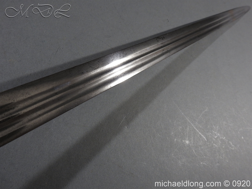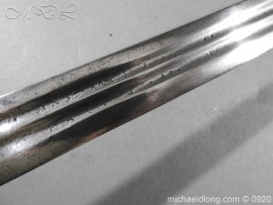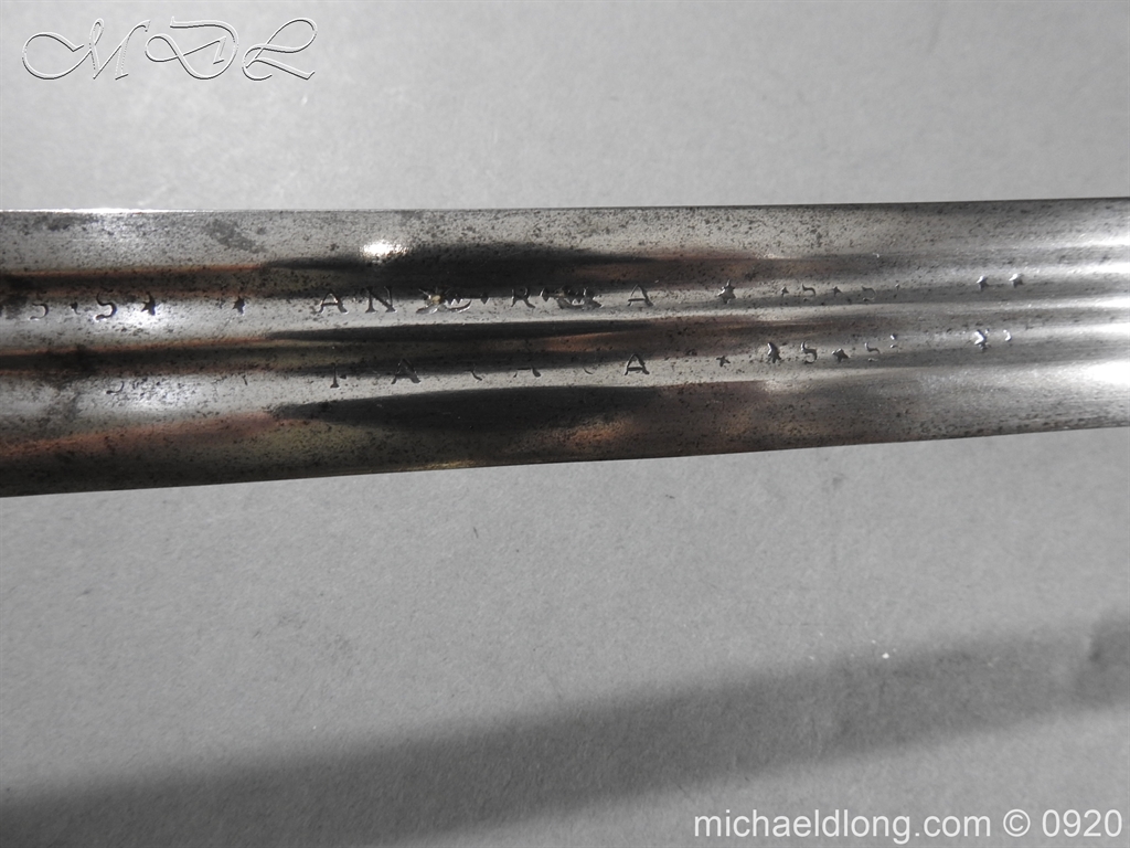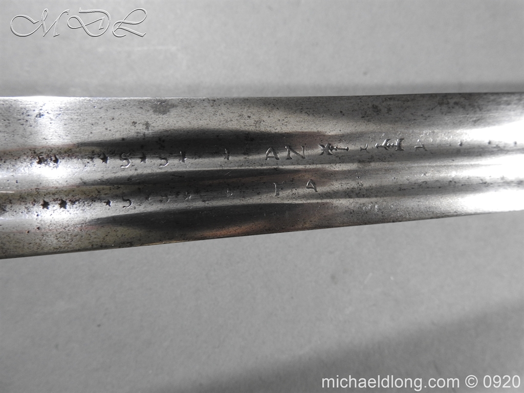 English Dragoon Officer’s Sword c 1740 solid iron basket with horseman’s oval ring original fish skin grip bound with silver wire and dome pommel with button. Single edged blade which could near be classed as a broadsword blade with 2 central fullers marked with ANDREIA FARARA plus S X S and other armorers marks please see images overall length 40.5 inches the blade 33.75 inches please see for reference page 282 of Swords and Sword Makers of England and Scotland by Bezdek