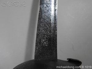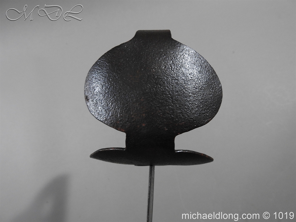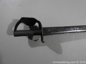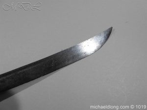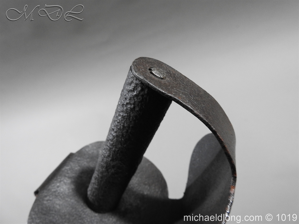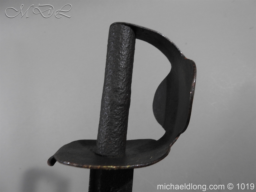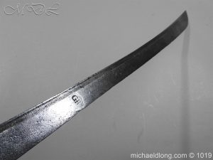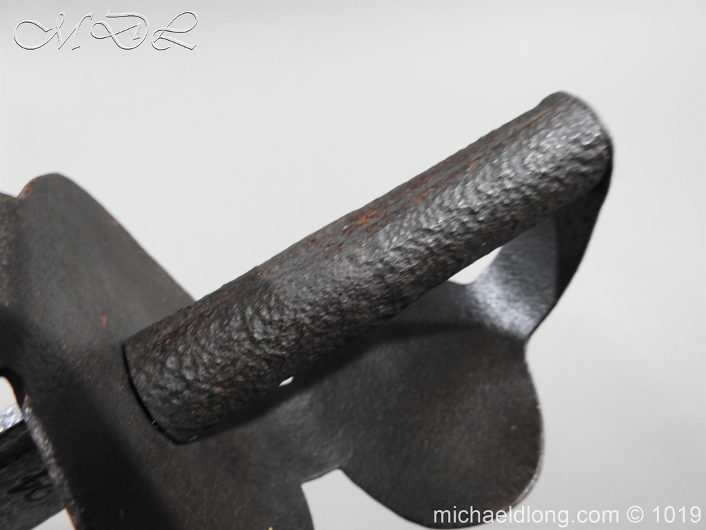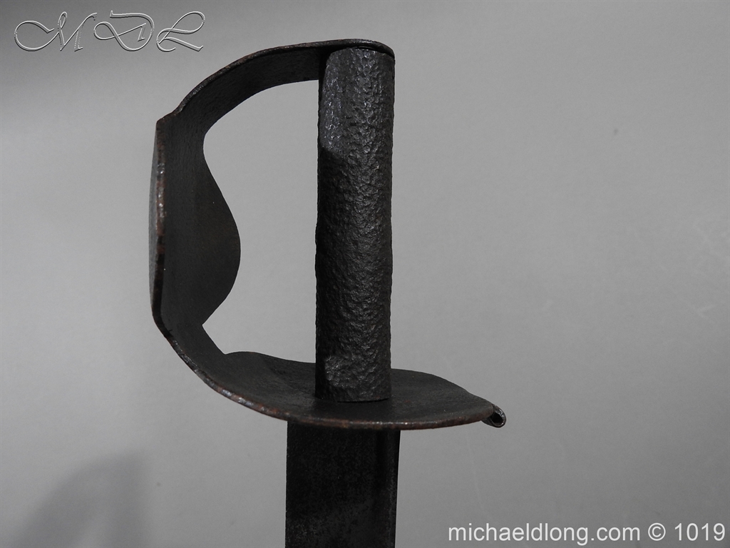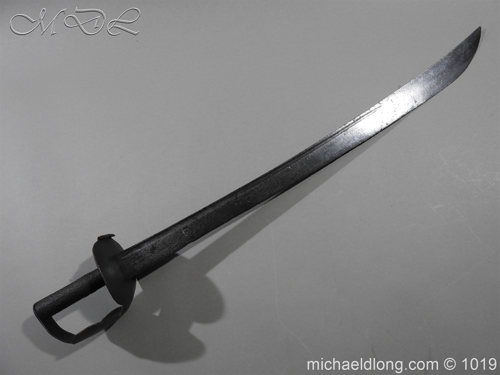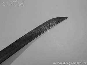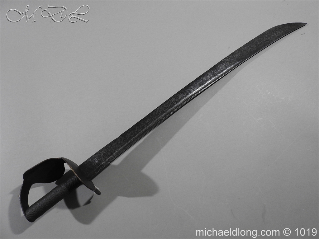 English naval cutlass late 18th century iron figure of eight hilt with iron cylindrical grip. The slightly curved blade with top fuller and stamped GR the reverse with the number 24. Overall length 28 inches – 71cm the blade 24 inches – 61cm For reference please see Swords for Sea Service plates 65/66/67