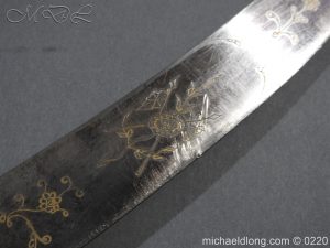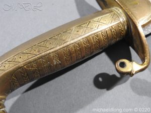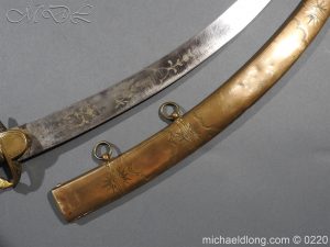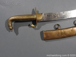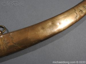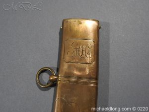 English Georgian period Naval Officer’s Dirk with highly decorative gilt brass hilt engraved and influenced in it’s design by the Egyptian Campaign. The cross guard and langets with matching engraving plus owner family crest to rear – an armoured arm embowed holding an arrow. Please note flight damage. The curved blade with faded blue and gilt decoration including trophies of arms and floral patterns. It is contained within matching brass scabbard which is heavily engraved with blank panels to define scabbard fittings plus the reverse with initials H M Overall length 20 inches-51cm the blade 16 inches-41cm
