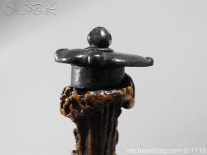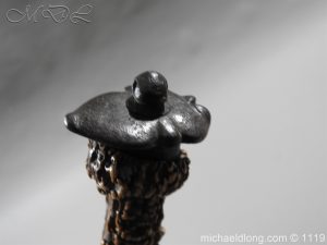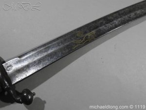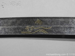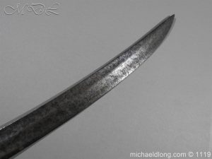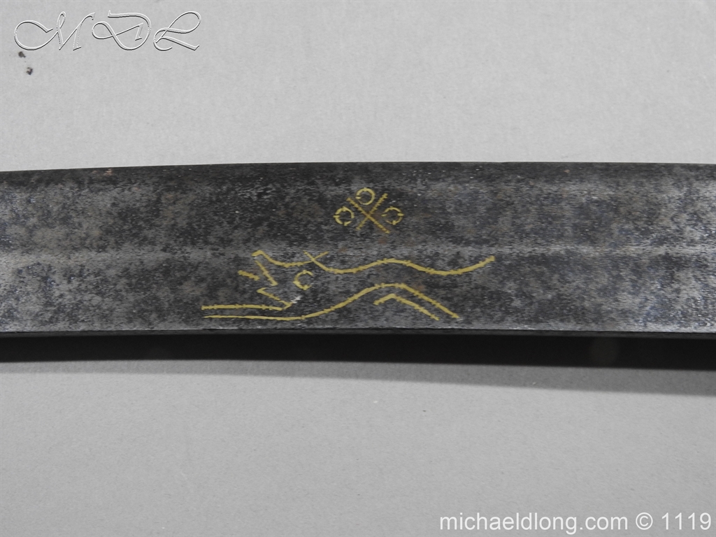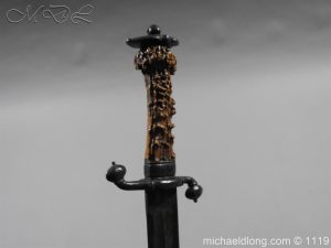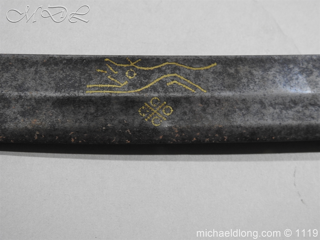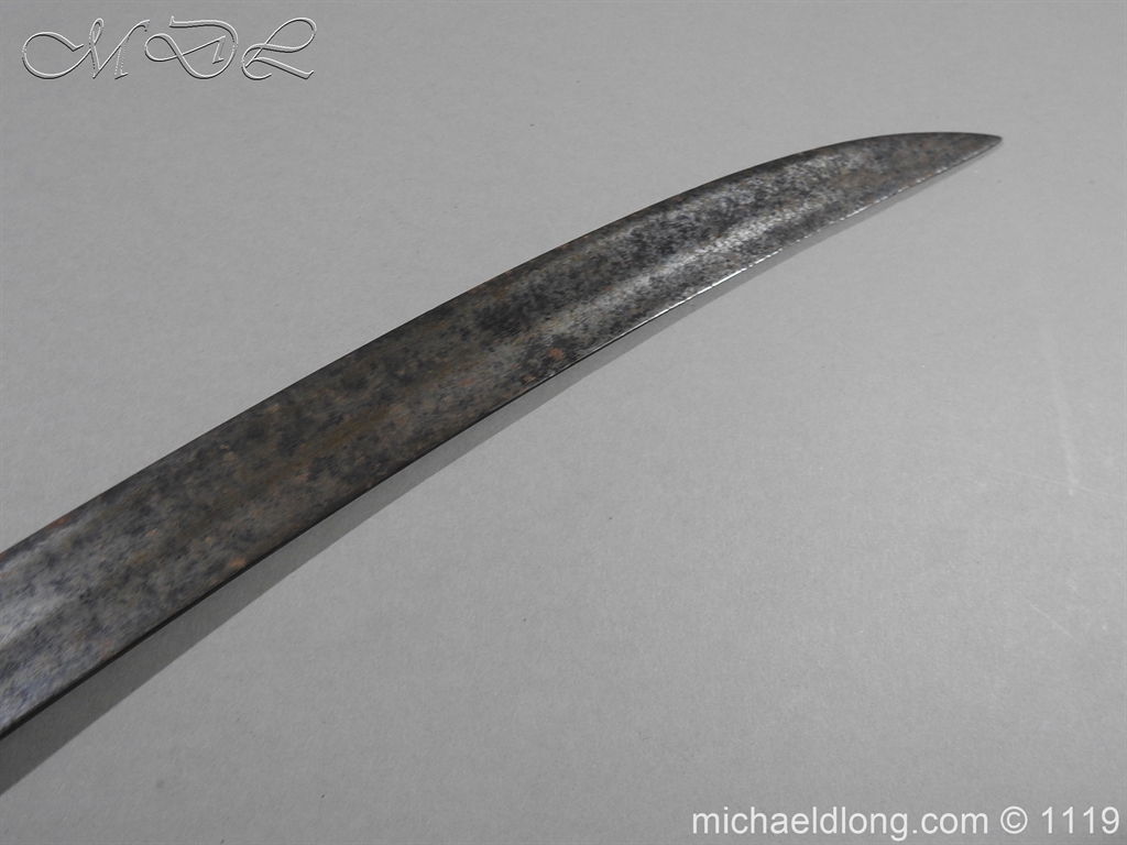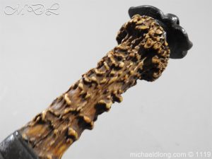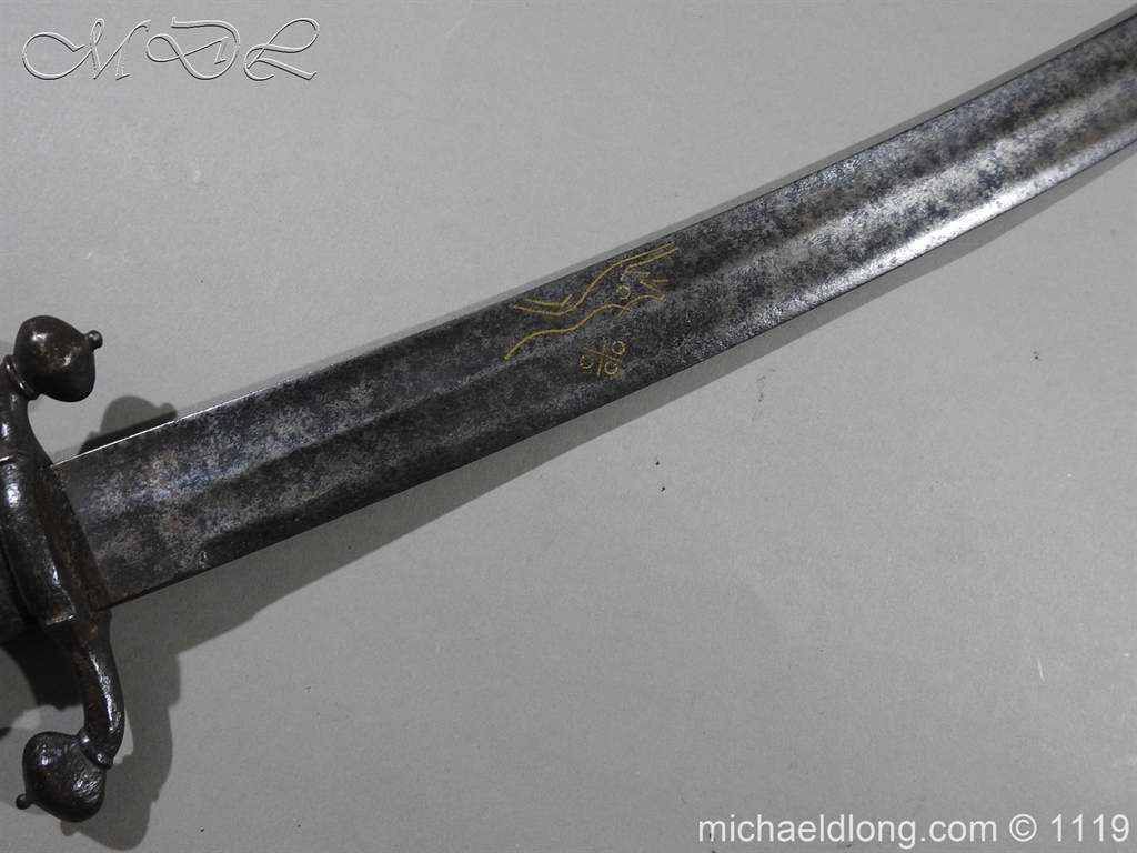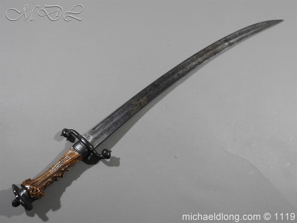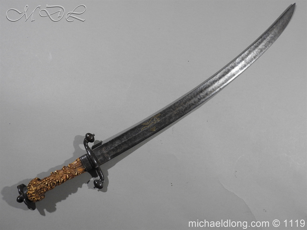 A very fine English Hounslow Hanger with curved single edged German blade. The iron hilt with has darkened nicely with age. The stag horn grip has nicely worn to fit the hand and decorative flat pommel cap. The curved blade is excellent with armourer’s stamp plus Passau Wolf make with gold inlay. – blade 55cm overall 70cm