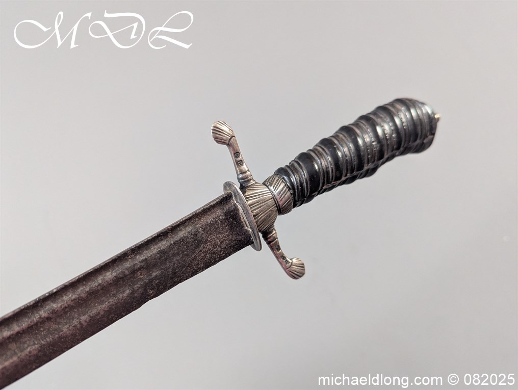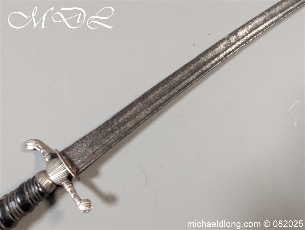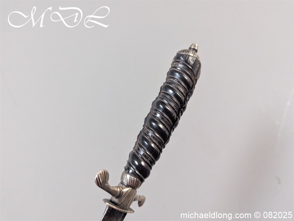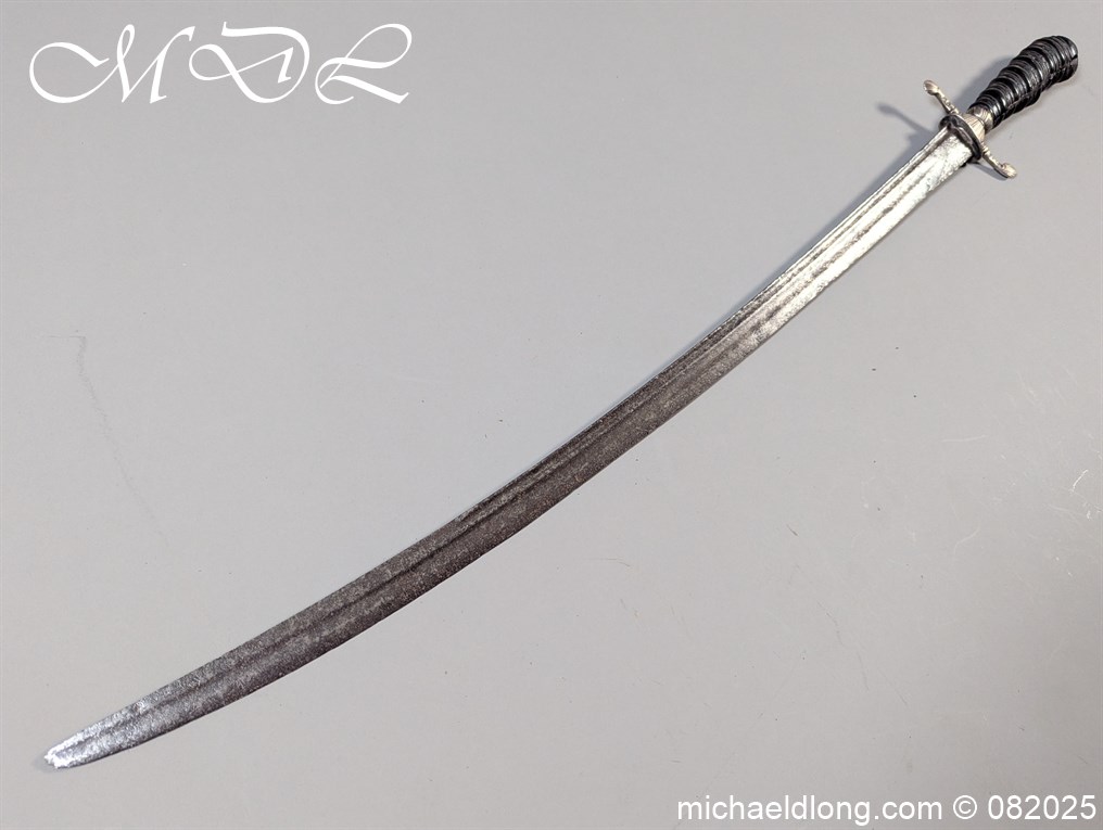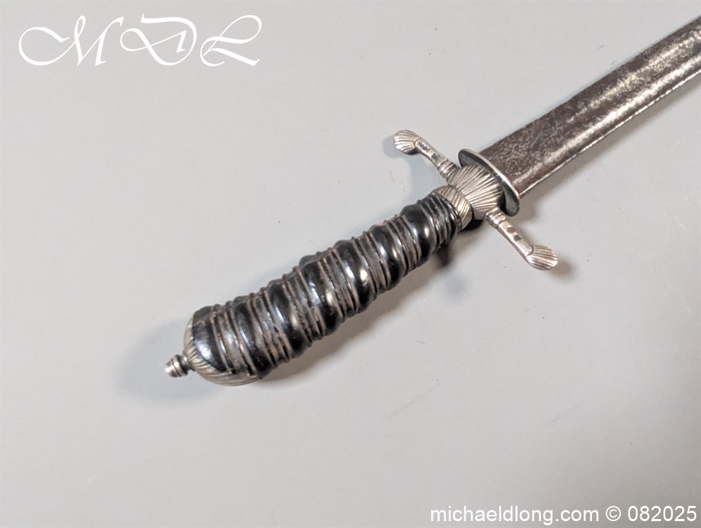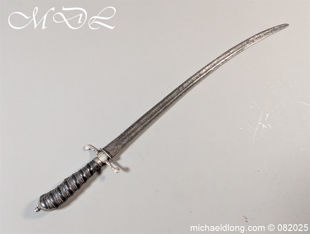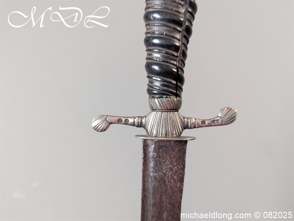 English Hunting Sword Hallmarked 1782 ribbed ebony grip please note cracks but solid. The silver hallmarked fitting indicate a date of 1782 and makers mark W. K Slightly curved blade 23.5 inch in length with narrow and wide fuller overall length 29 inch