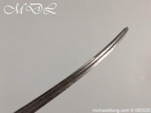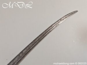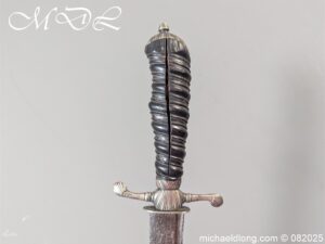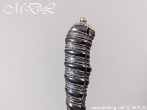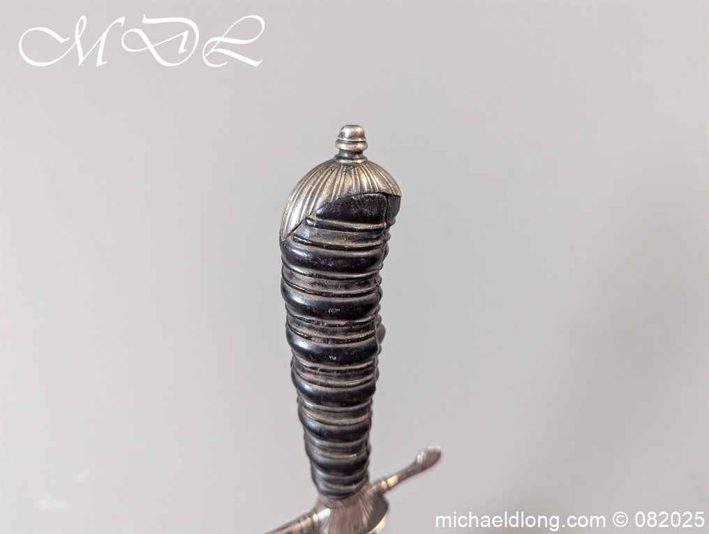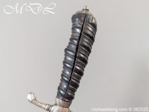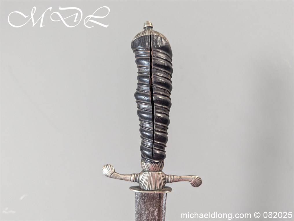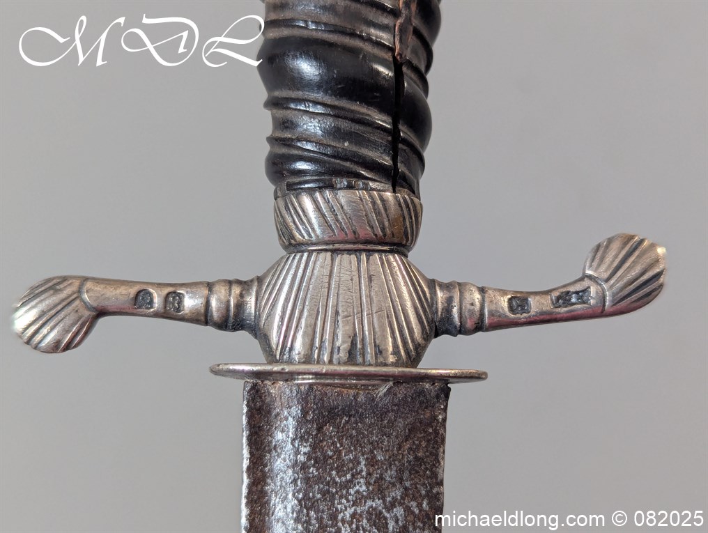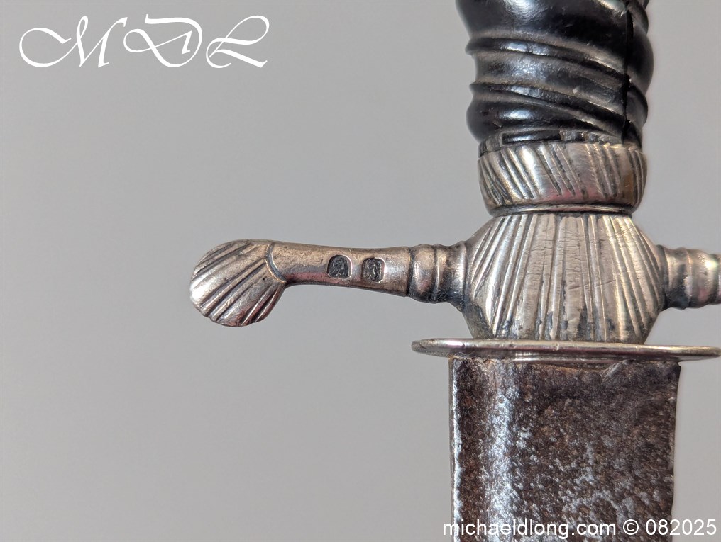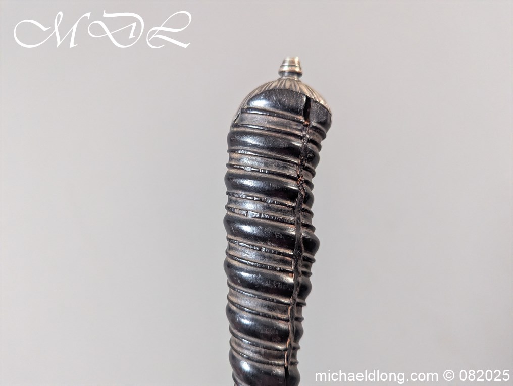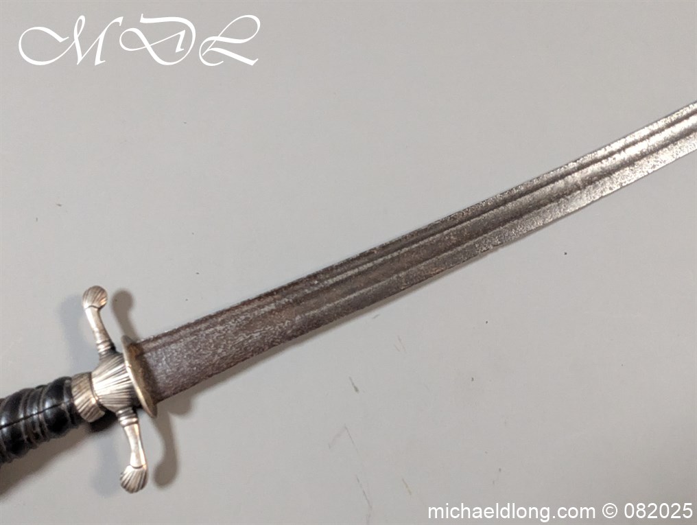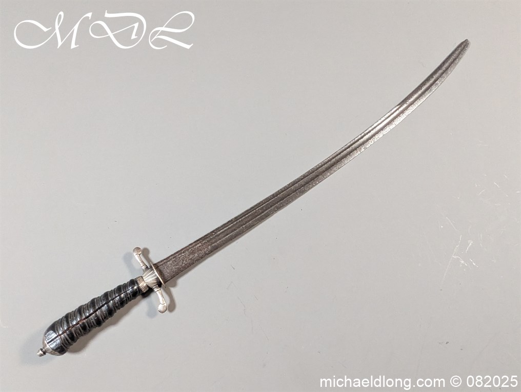 English Hunting Sword Hallmarked 1782 ribbed ebony grip please note cracks but solid. The silver hallmarked fitting indicate a date of 1782 and makers mark W. K Slightly curved blade 23.5 inch in length with narrow and wide fuller overall length 29 inch