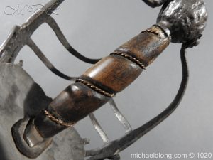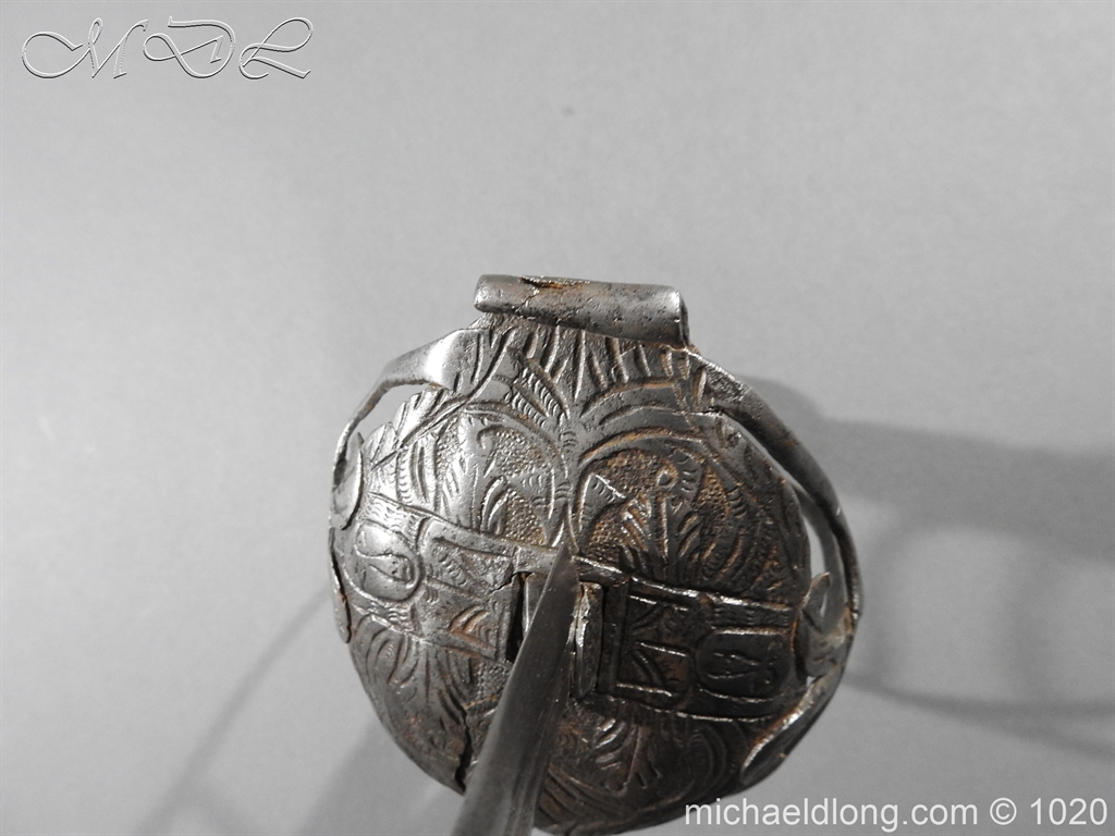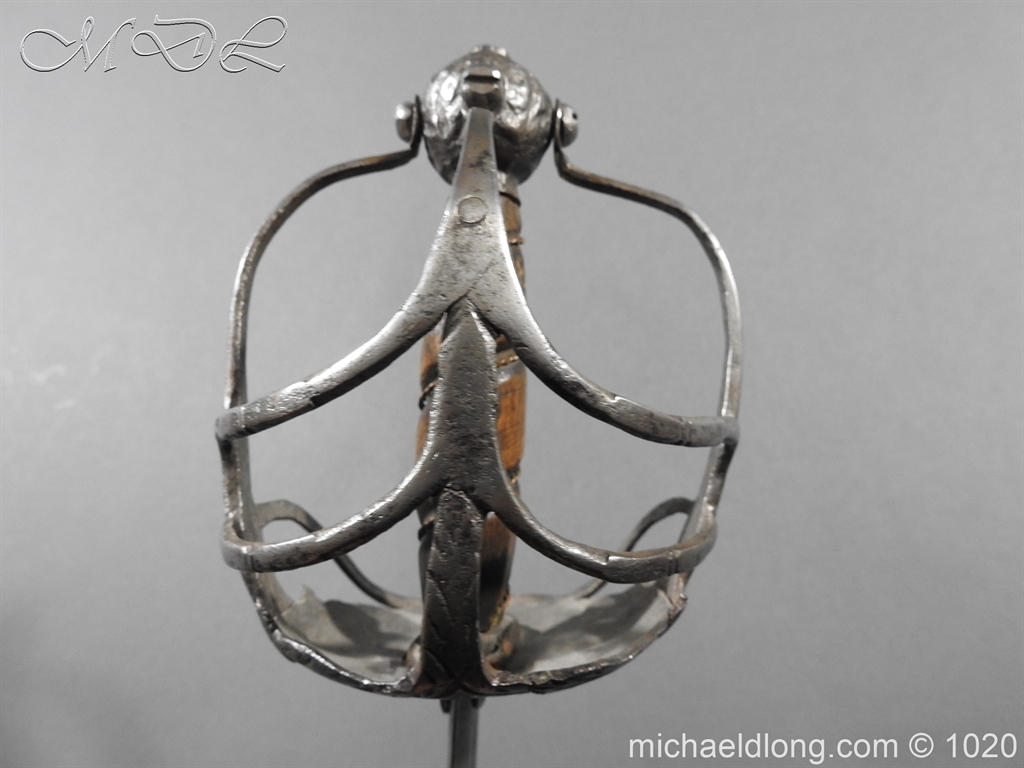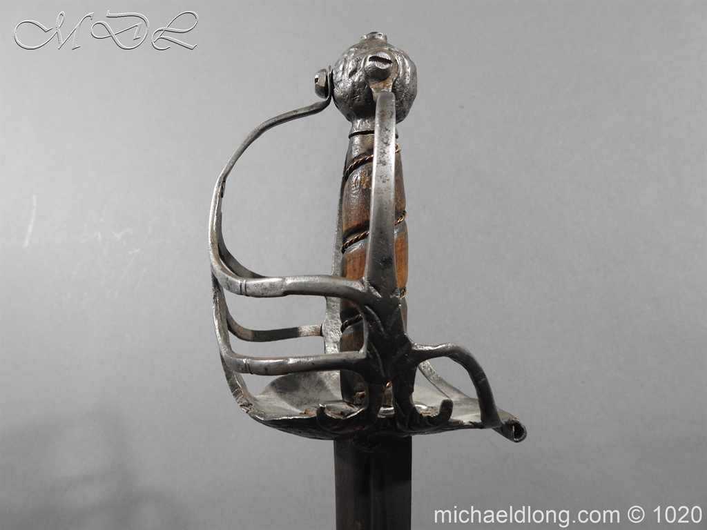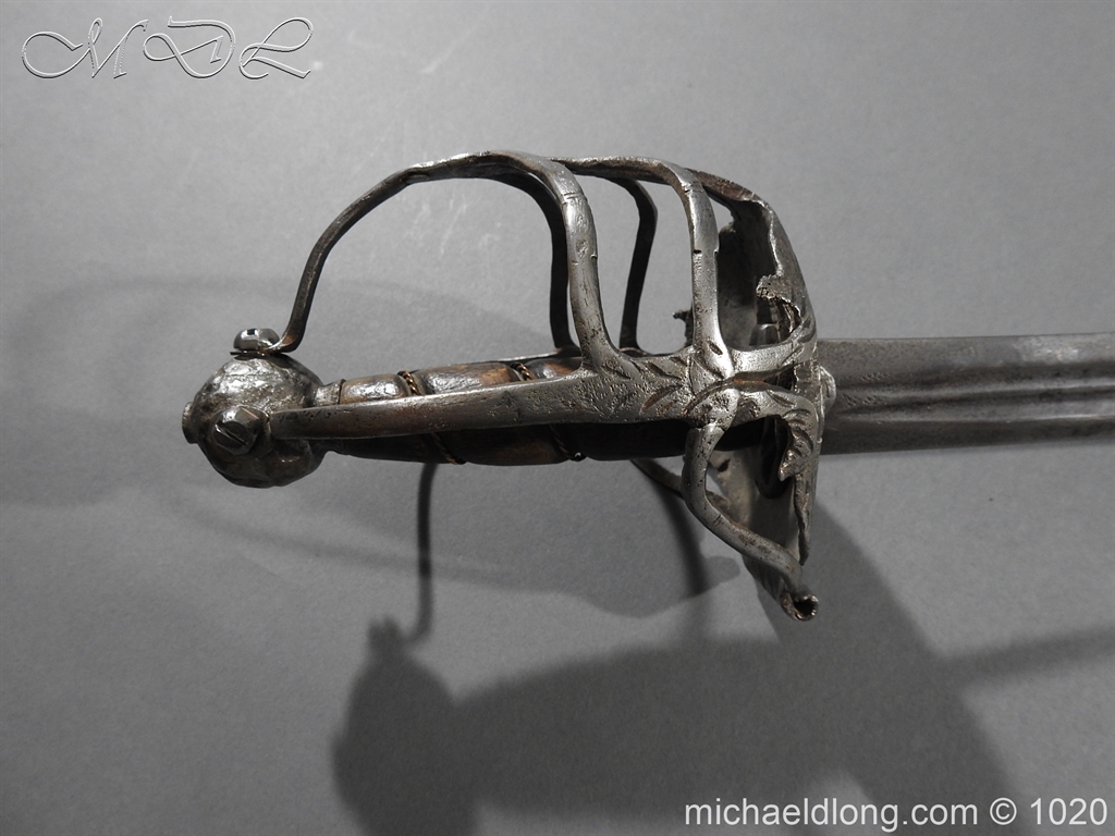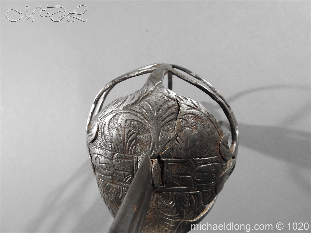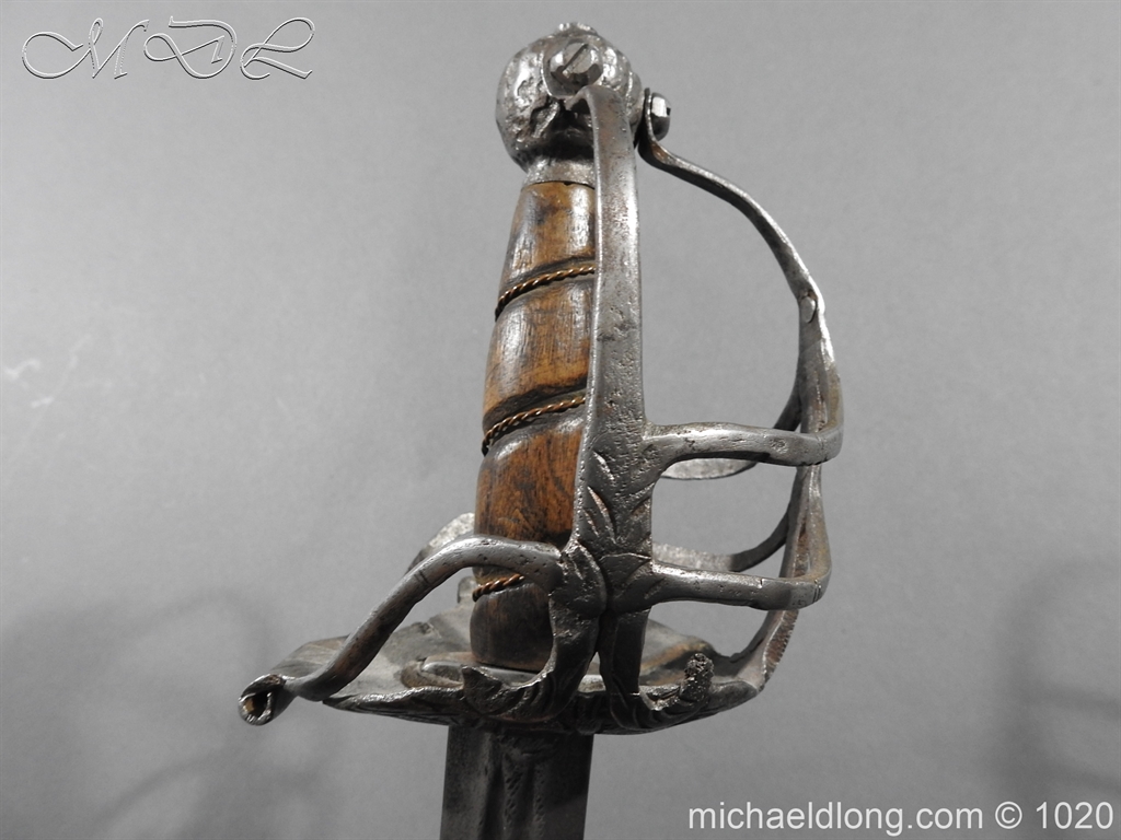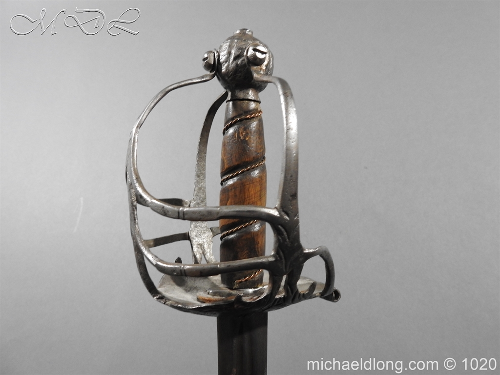 English Mortuary Sword c1650, with double edged 35 inches blade and double fullers, both fuller signed on both sides near the hilt MEFECIT although faint plus Passsau wolf again to both sides. Typical iron basket, the front face engraved and chiselled with male faces and floral decoration, the basket formed from three bars and two side-bars, spirally fluted wood grip with twisted wire, the basket bars attached to the carved bulbous pommel by three screws. Please note small age crack in basket please see images overall length 41 inches