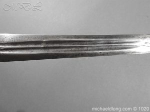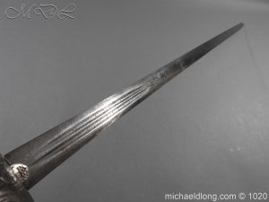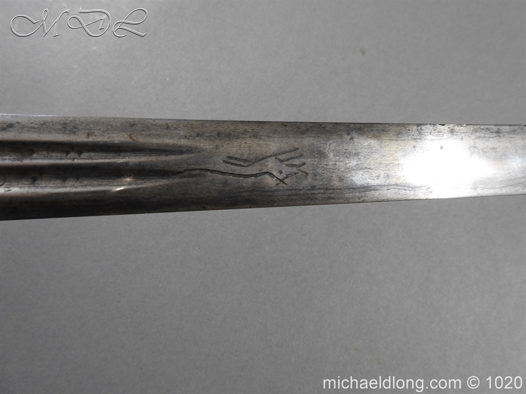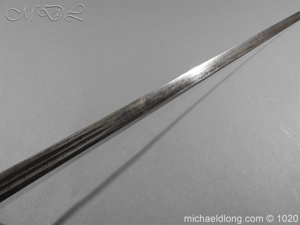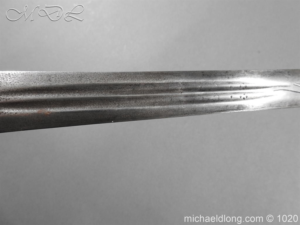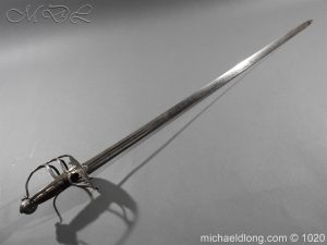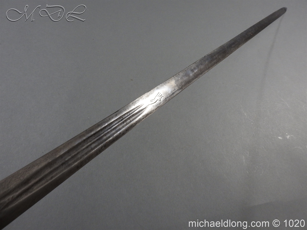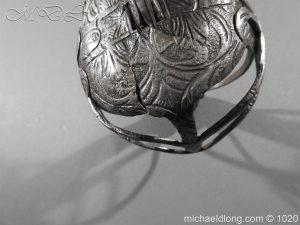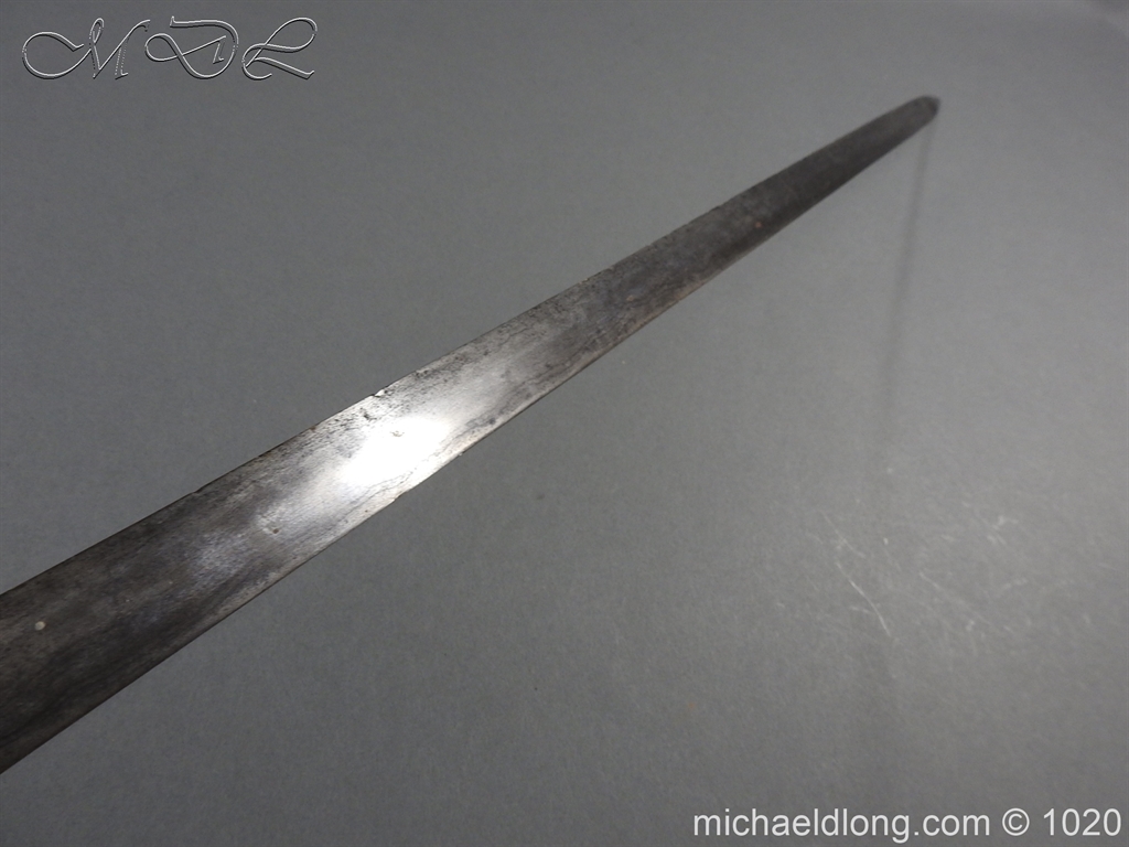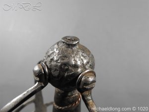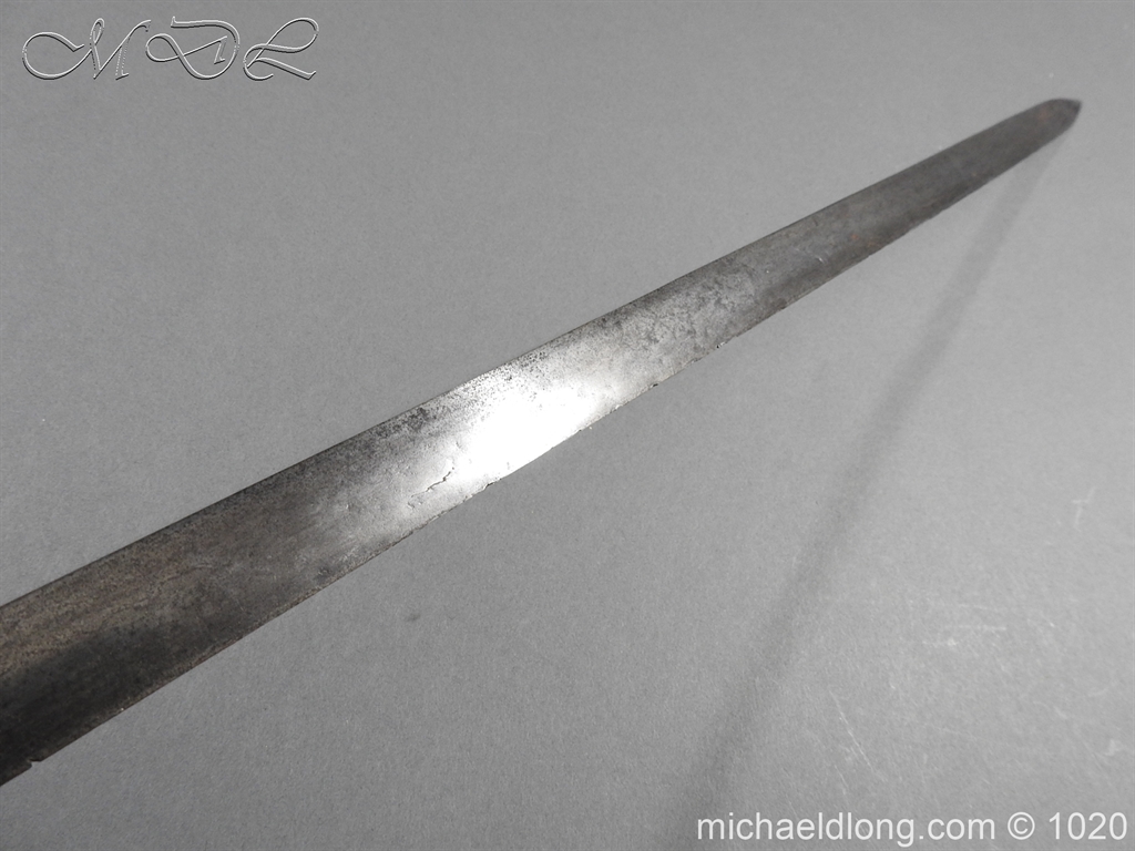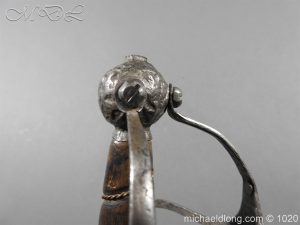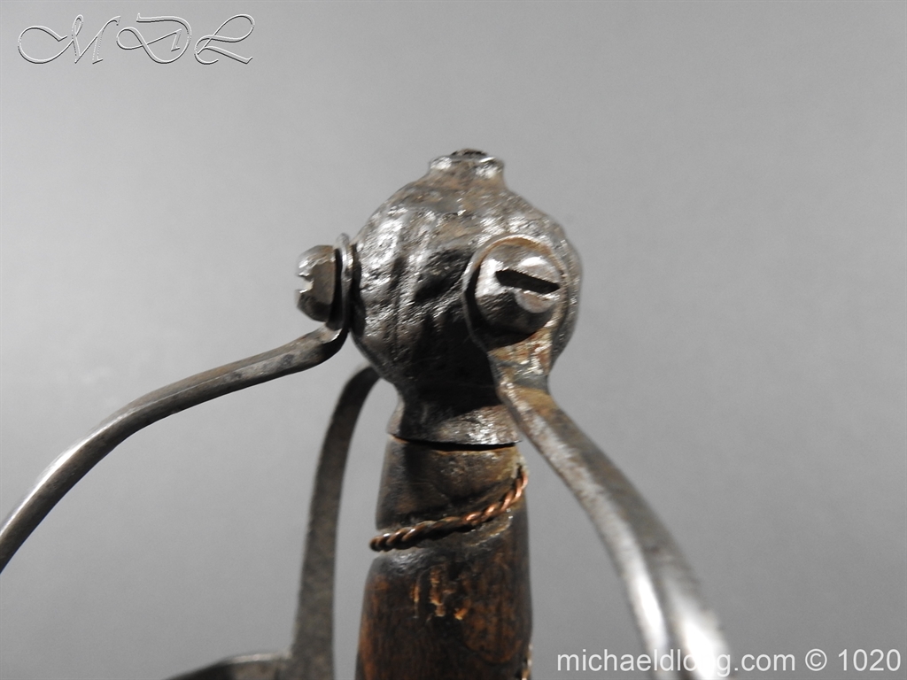 English Mortuary Sword c1650, with double edged 35 inches blade and double fullers, both fuller signed on both sides near the hilt MEFECIT although faint plus Passsau wolf again to both sides. Typical iron basket, the front face engraved and chiselled with male faces and floral decoration, the basket formed from three bars and two side-bars, spirally fluted wood grip with twisted wire, the basket bars attached to the carved bulbous pommel by three screws. Please note small age crack in basket please see images overall length 41 inches