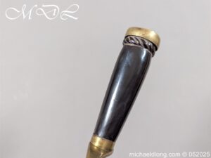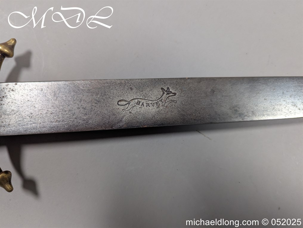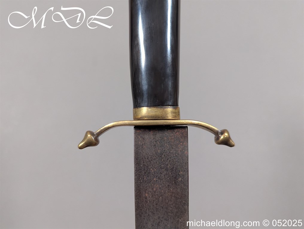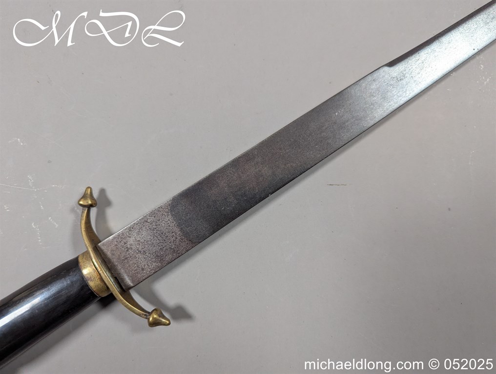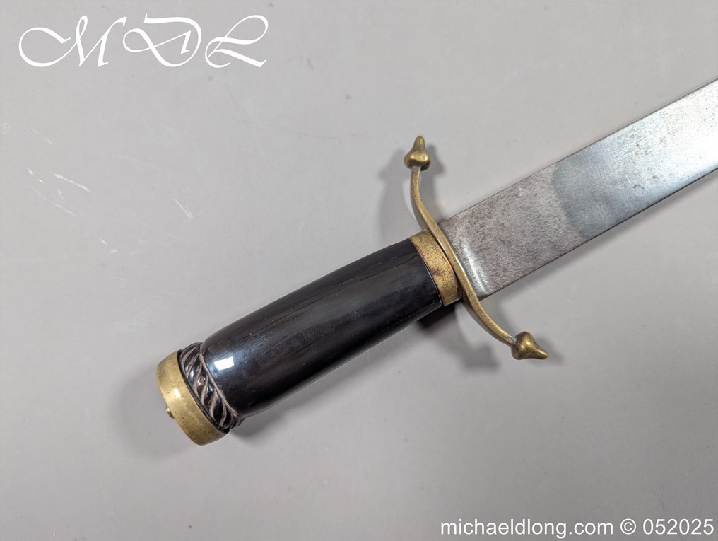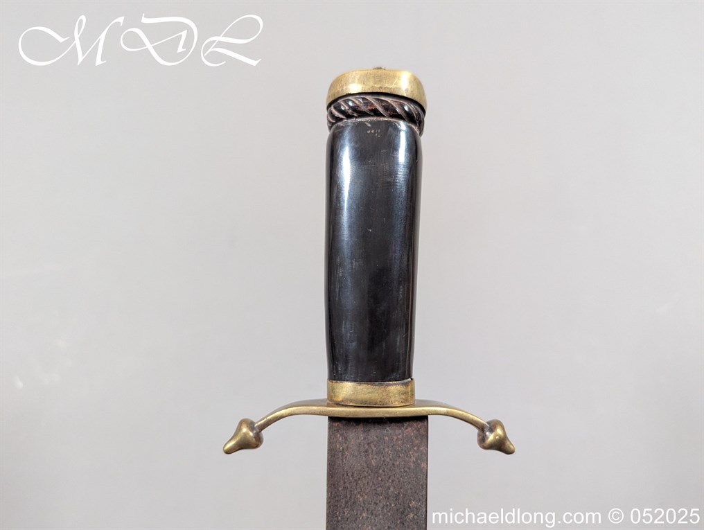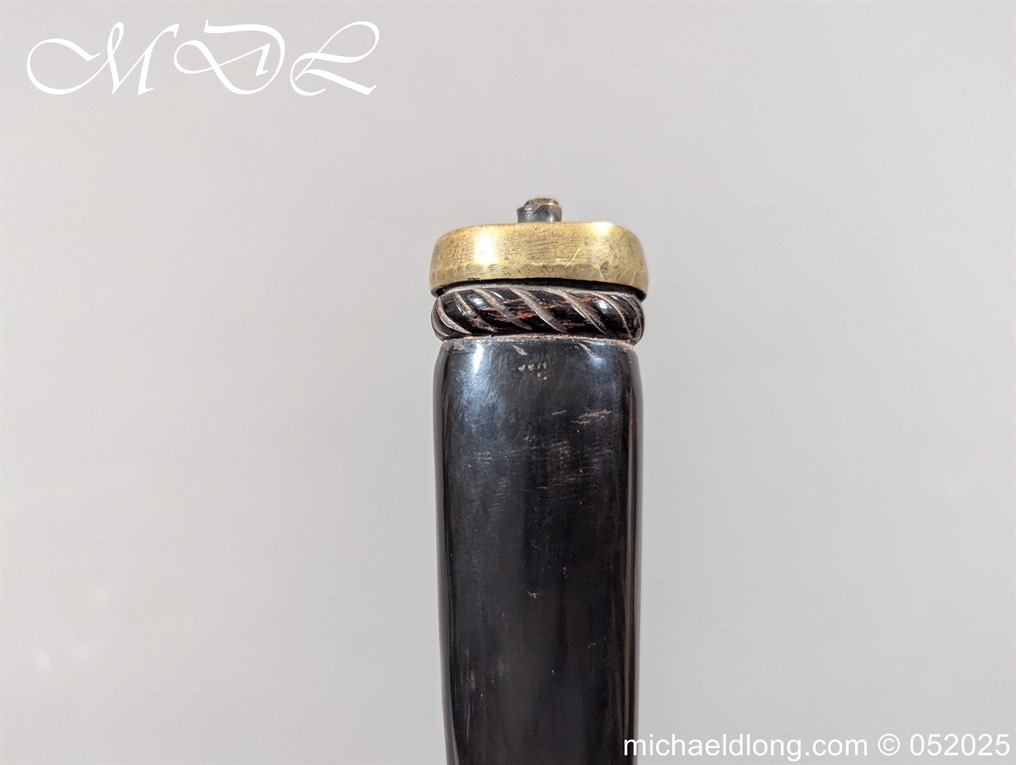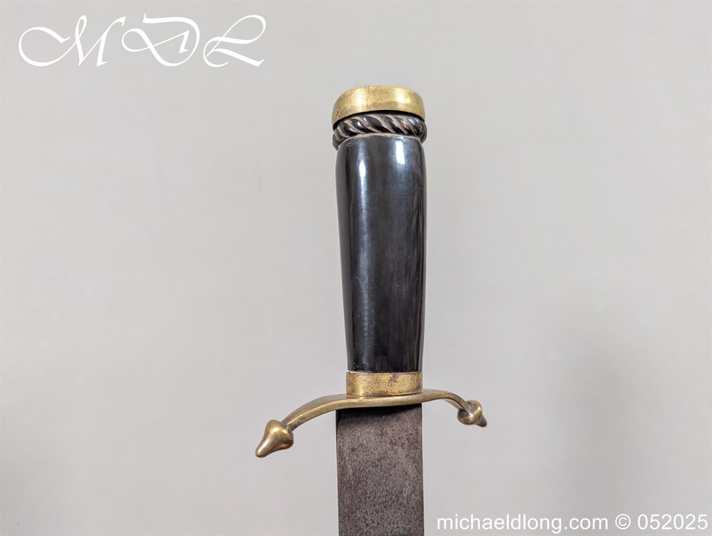 English Officers 18th Century Sidearm possibly naval with horn grip with worked rope design to top. The pommel raised tang and cross section with red leather insert, please note this has been replaced and down turned cross guard with acorn finials. The blade marker marked Havey which is repeated on the spine, single edged becoming double for the last 8 inches to the point. Overall length 21 inches – 53cm the blade 16.5 inches – 42cm