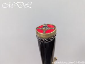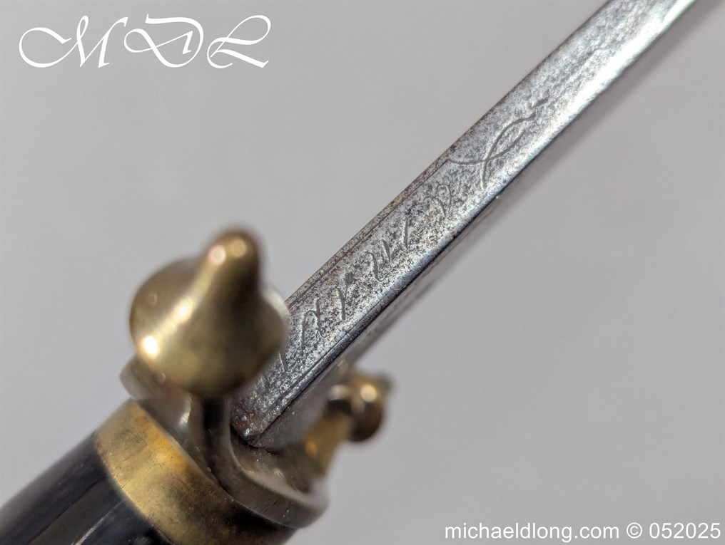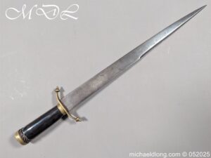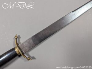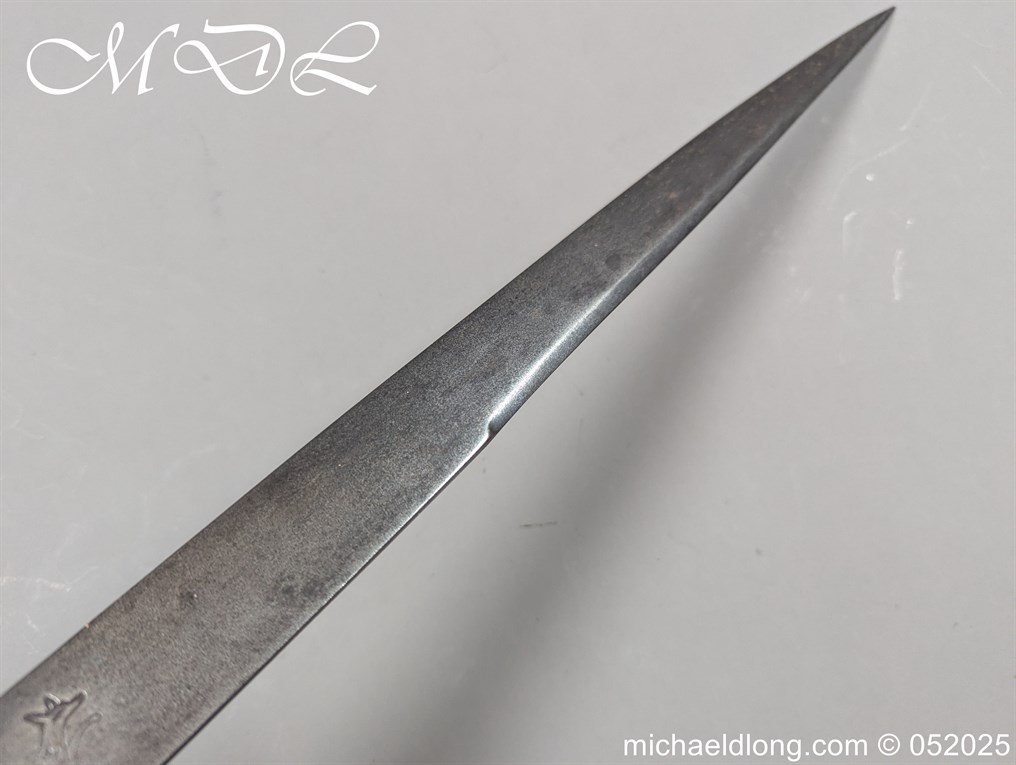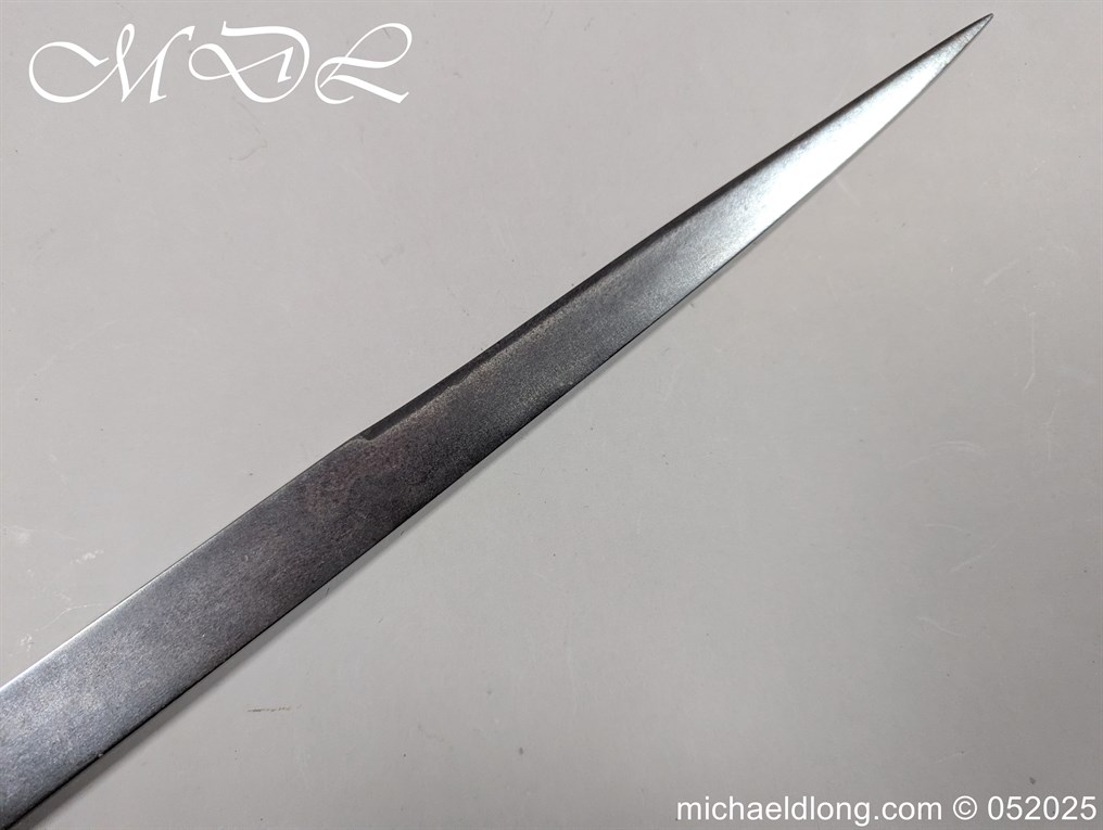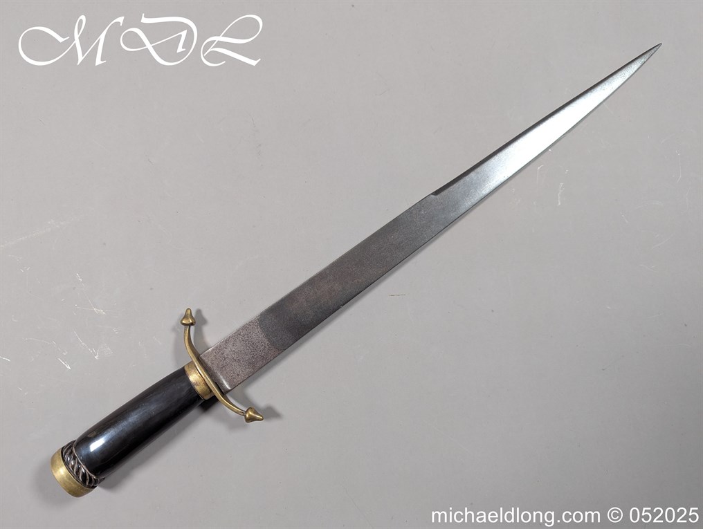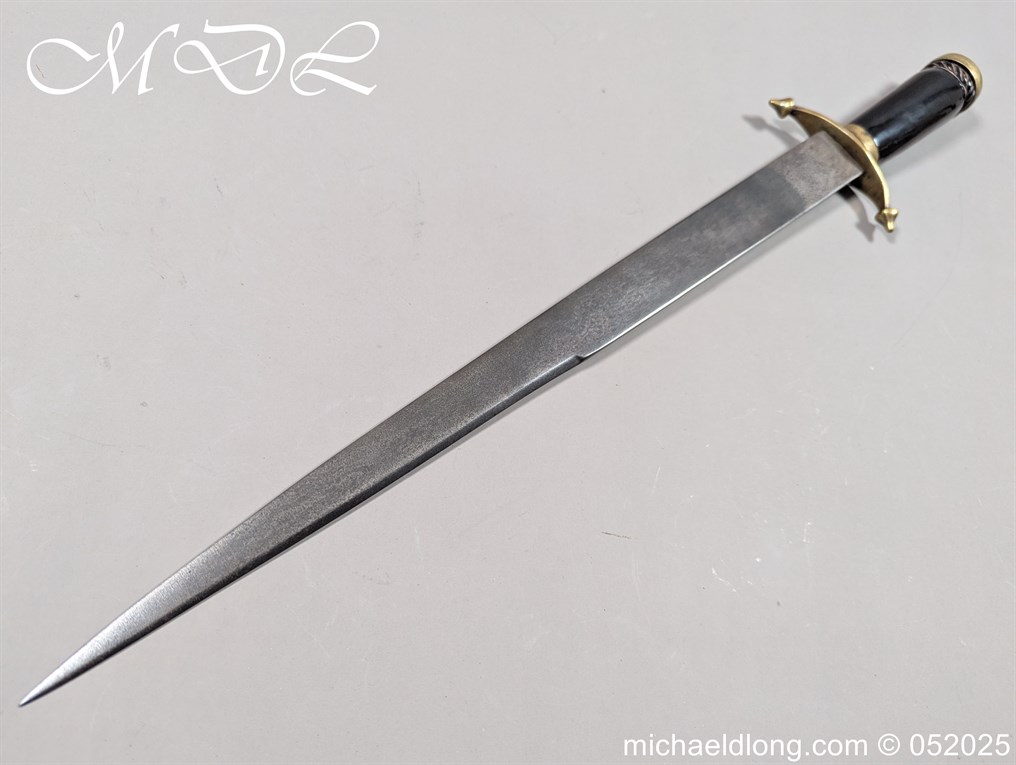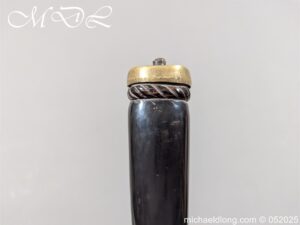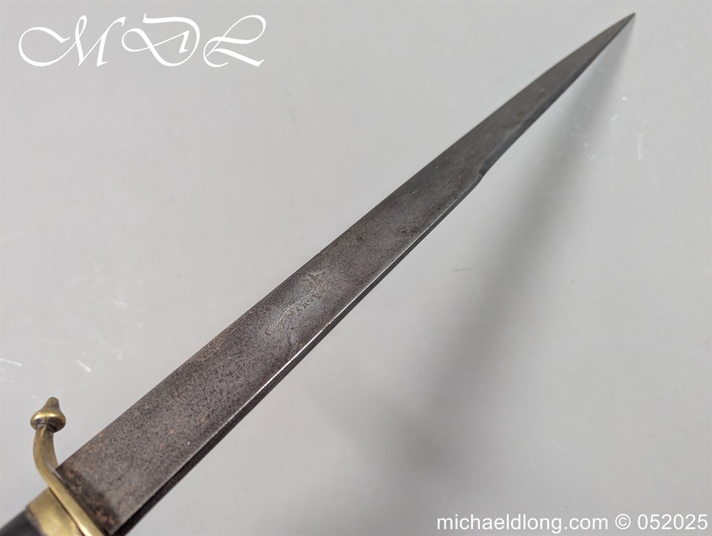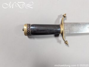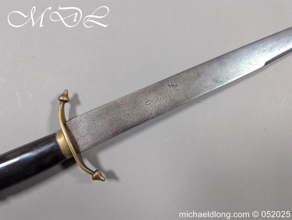 English Officers 18th Century Sidearm possibly naval with horn grip with worked rope design to top. The pommel raised tang and cross section with red leather insert, please note this has been replaced and down turned cross guard with acorn finials. The blade marker marked Havey which is repeated on the spine, single edged becoming double for the last 8 inches to the point. Overall length 21 inches – 53cm the blade 16.5 inches – 42cm