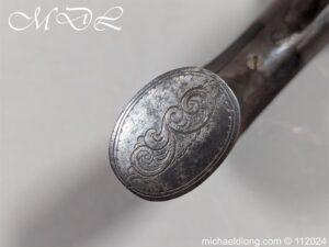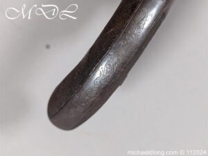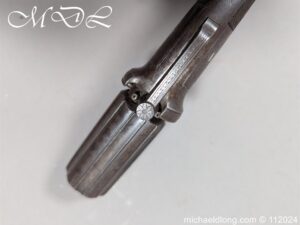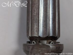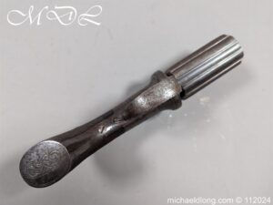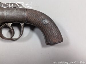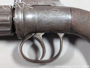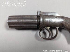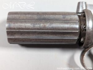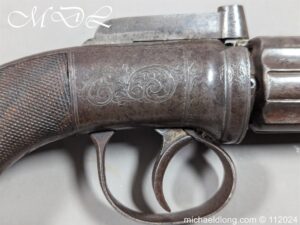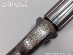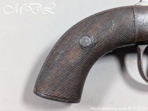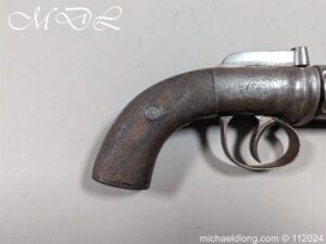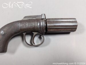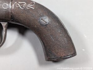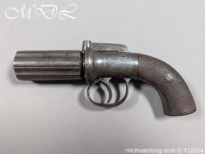 English Percussion Pepper Box Pistol in good working order, six rotating barrels with proof marks. The frame, trigger guard and but cap nicely engraved with floral decoration and the name Bourne to one side of the frame. Complete with finely chequered wooden grip, over all length 20cm the barrel 7cm – good clean working example. Please Note UK shipping free the rest of the world at cost.