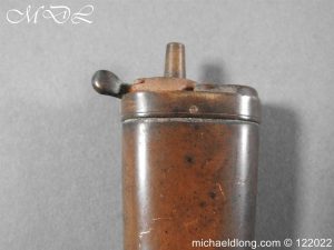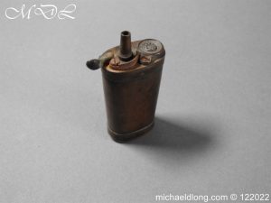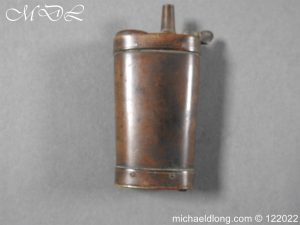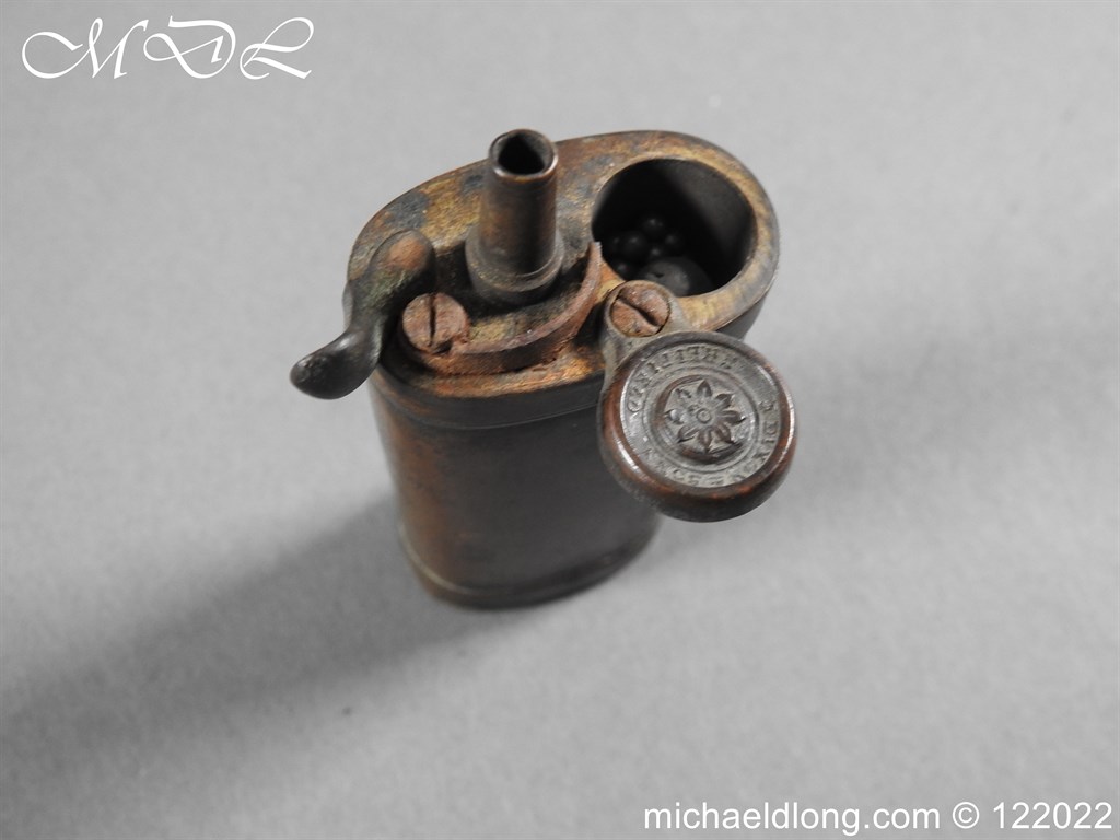 English Pistol Powder Flask by J Dixon and Sons untouched with copper body and brass base and top. Fitted with nozzle not spring not working and the sliding lid marked J Dixon & Sons Sheffield with floral design to centre, Overall height 3inch width of base 1.25inch the the top 1.5 inch