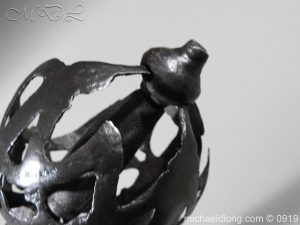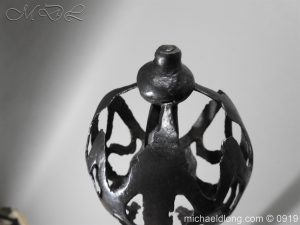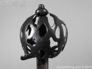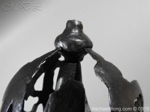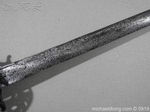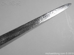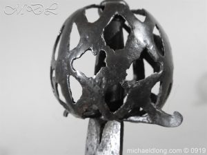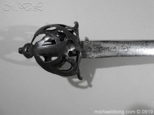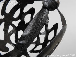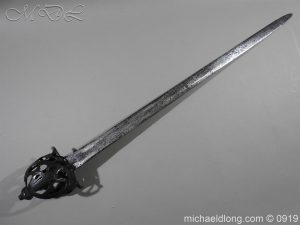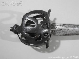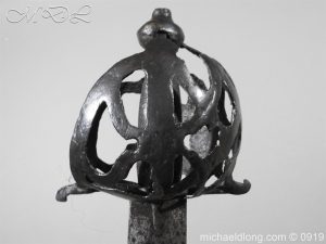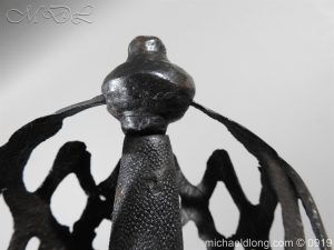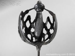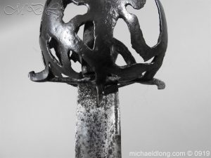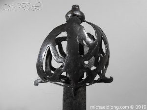 A very rare English basket hilted broadsword c 1600 Ribbon basket with small curved quillons, fish skin grip which we assume has been replaced during it’s long life. The blade double edged struck with bladesmith’s mark and 2 small langets overall length 100cm blade 84cm