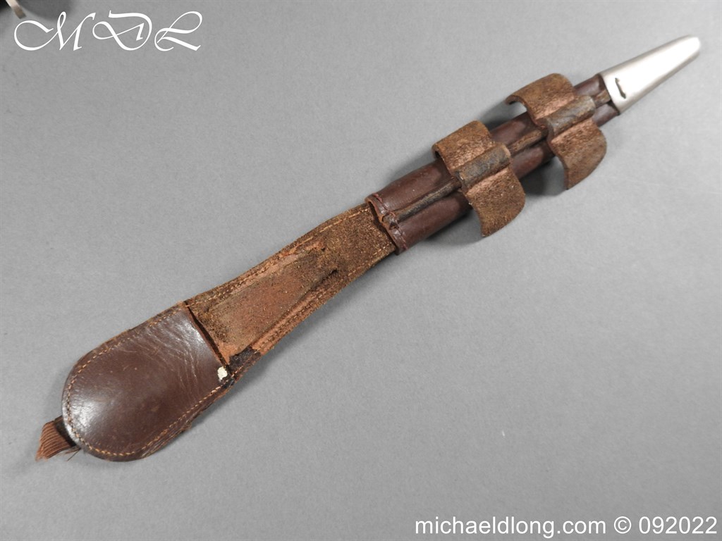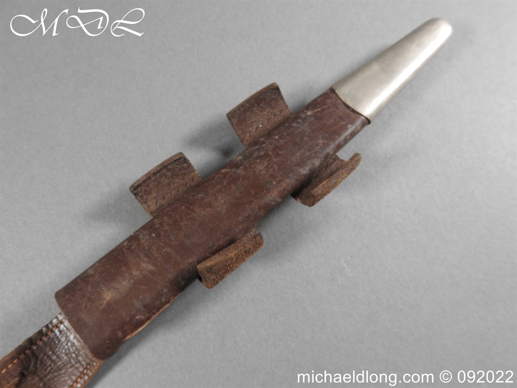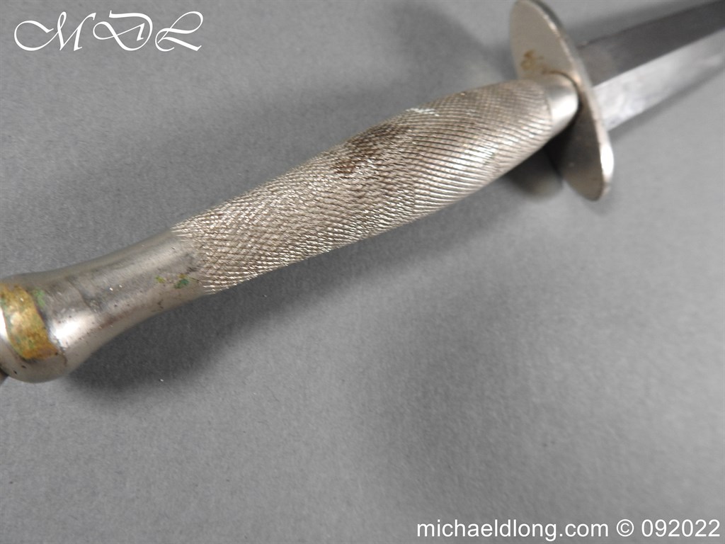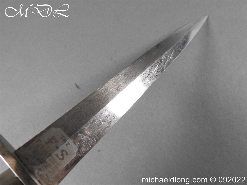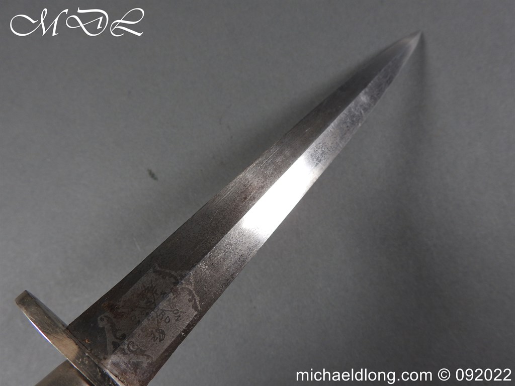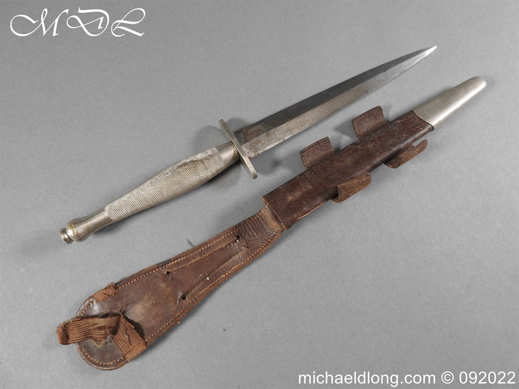 In good order bright blade full length 6 7/8 inches etched with Wilkinson Sword London the reverse The F S Fighting Knife. Nickel grip with good chequering slightly dull with age and contained within original leather scabbard with steel fitting note securing strap broken