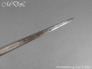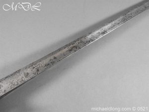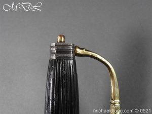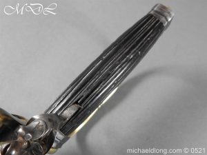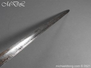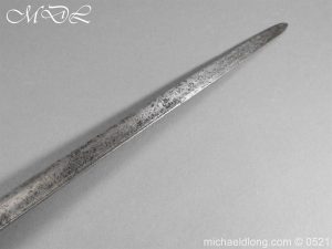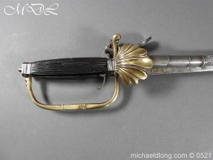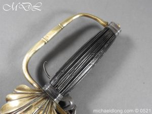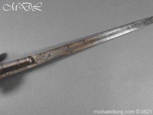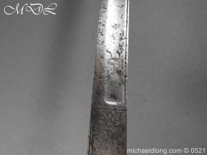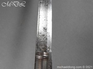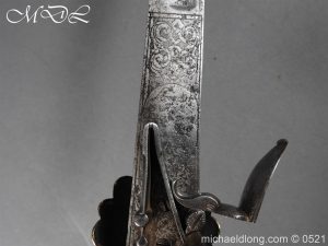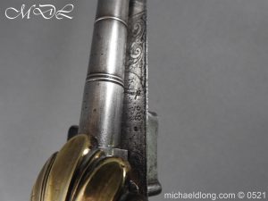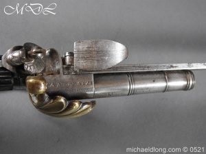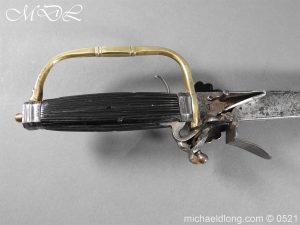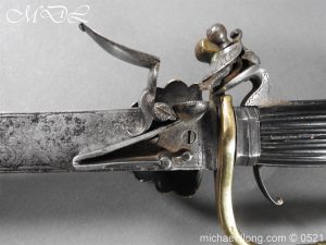 Flintlock Sword Pistol maker marked Van De Baize the hilt similar to British Spadroon with fluted ebony grip with to slots for the trigger and hammer steel mounts and a raised tang button in brass. The D guard in brass with matching shell shaped guard covering the breech of the pistol top of which is engraved VAN DE BAIZE. Canon style large bore barrel 3.5 inches in length attached to one side of the engraved blade the reverse with flintlock mechanism with engraved fish and shell style top jaw which may have a naval influence. The overall length is 28.5 inches the blade 23 inches