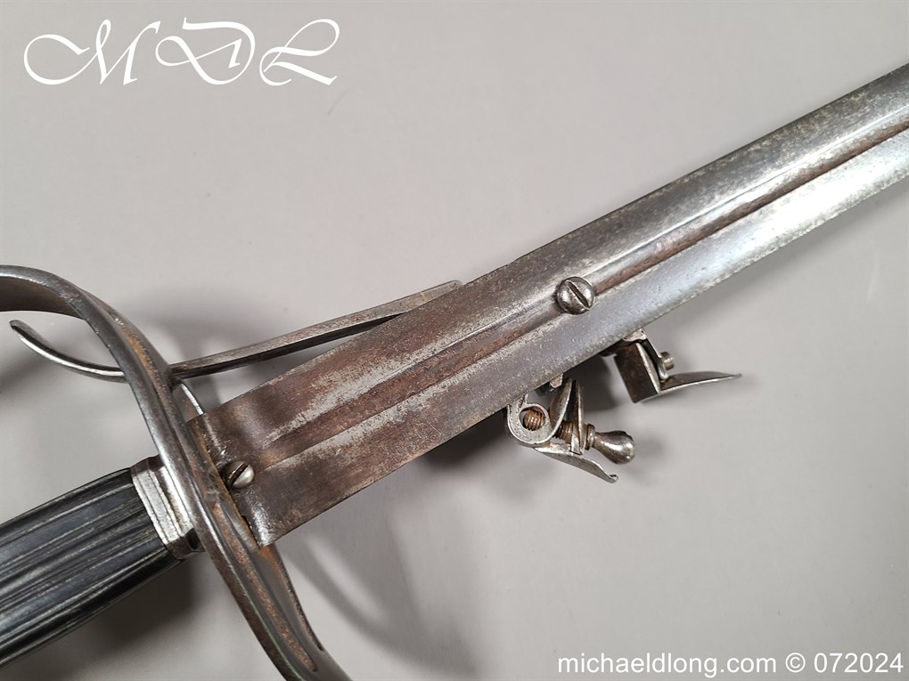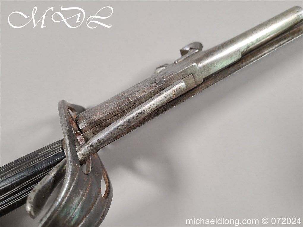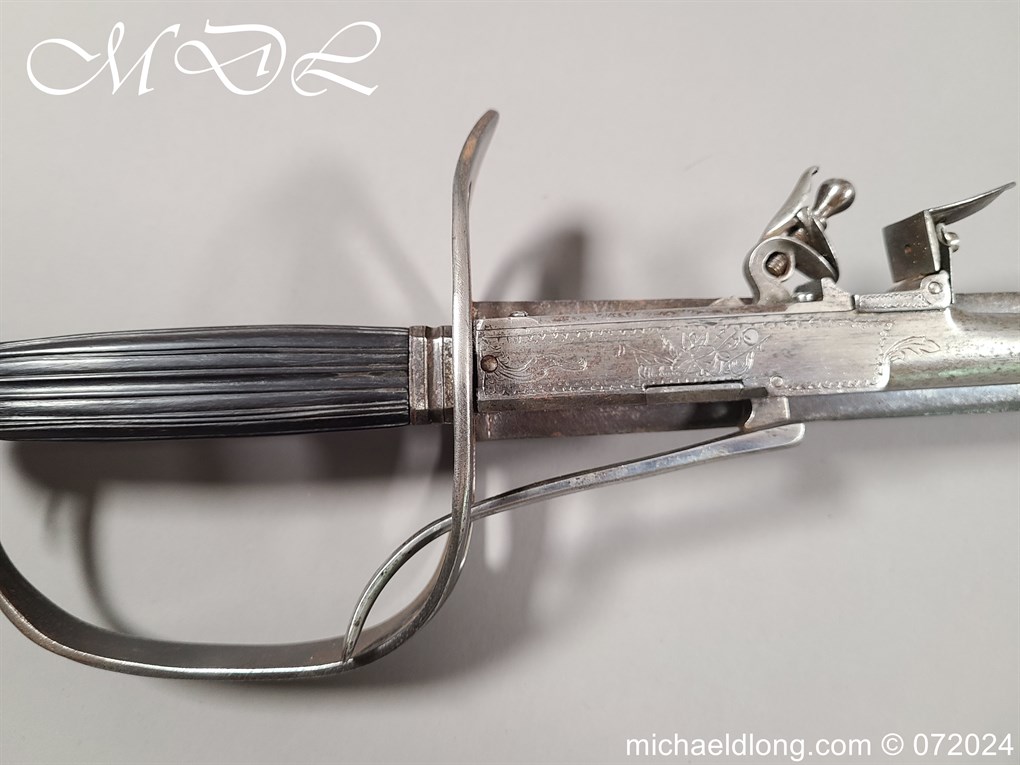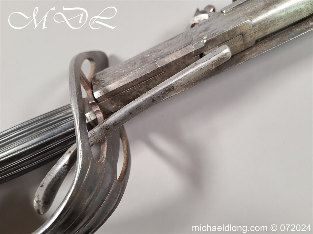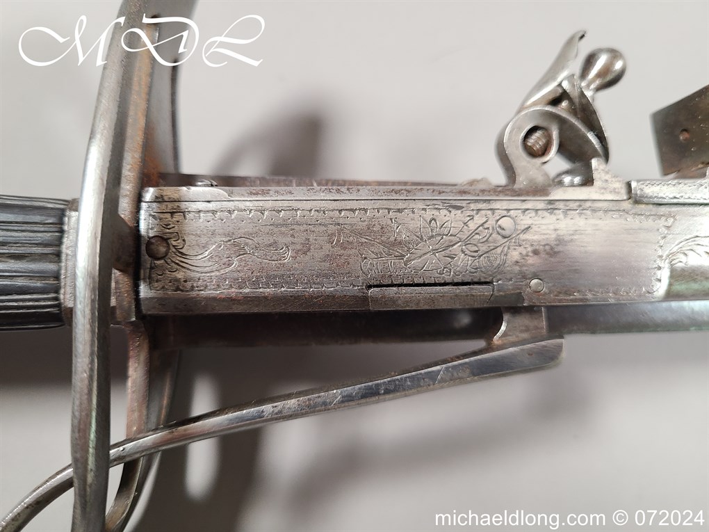 Flintlock 19th Century Sword Pistol, the sword is a ebony gripped slot hilt infantry sword c 1780 to which a flintlock pistol has been mounted. The lock plate is engraved with trophies of arms and floral decoration,the barrel and chamber measurement is 12cm. The tigger is a curved extended bar which fits nicely through one of the slots in the hilt which has slightly been enlarged. Overall length 98cm, for other examples of combination sword and dagger pistols please see Firearms Curiosa by Lewis Winant