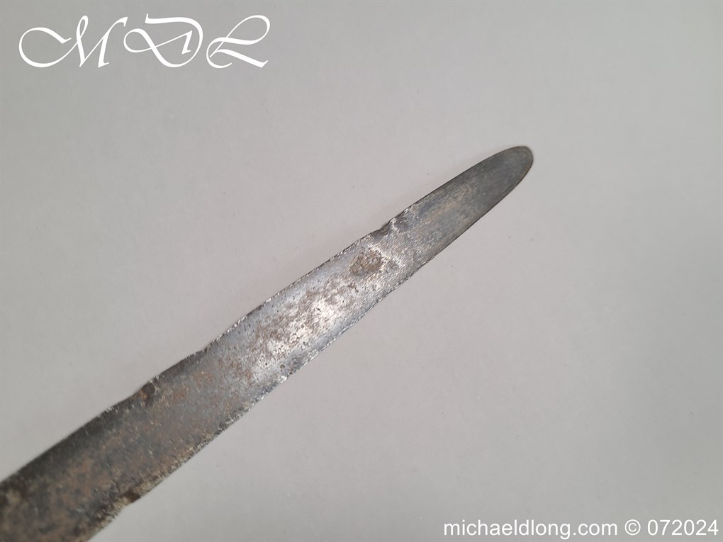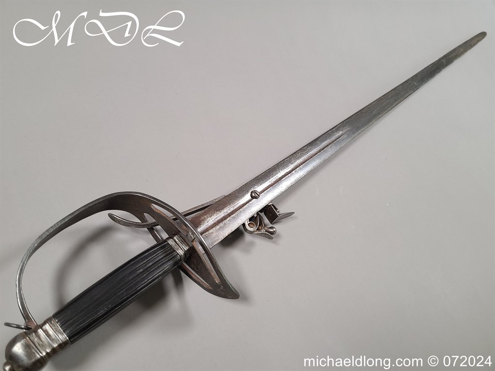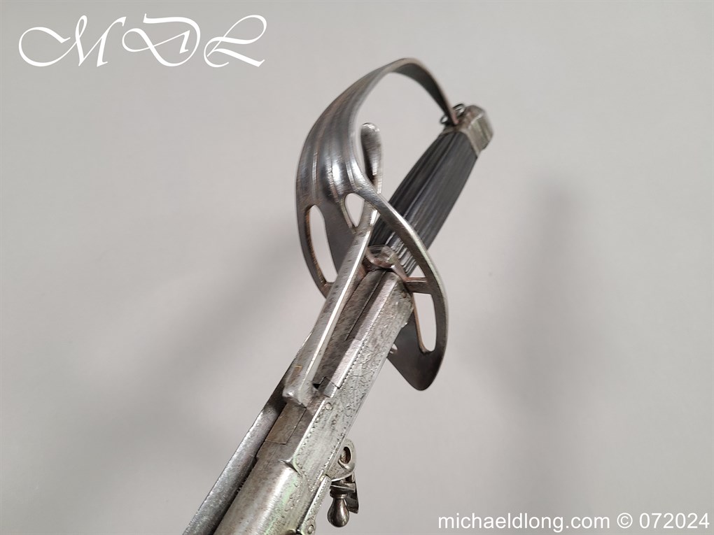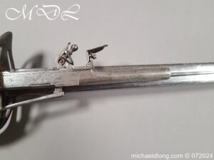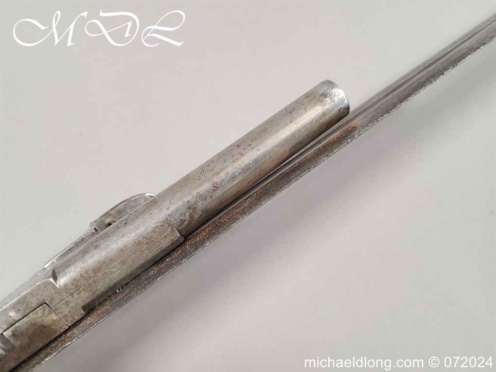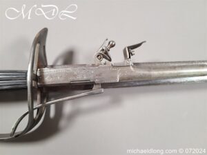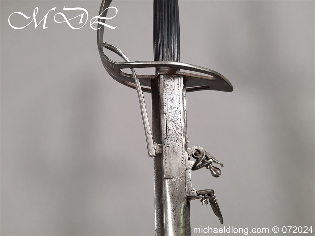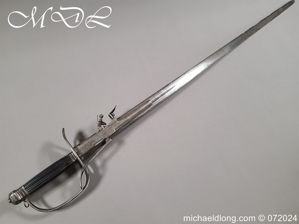 Flintlock 19th Century Sword Pistol, the sword is a ebony gripped slot hilt infantry sword c 1780 to which a flintlock pistol has been mounted. The lock plate is engraved with trophies of arms and floral decoration,the barrel and chamber measurement is 12cm. The tigger is a curved extended bar which fits nicely through one of the slots in the hilt which has slightly been enlarged. Overall length 98cm, for other examples of combination sword and dagger pistols please see Firearms Curiosa by Lewis Winant