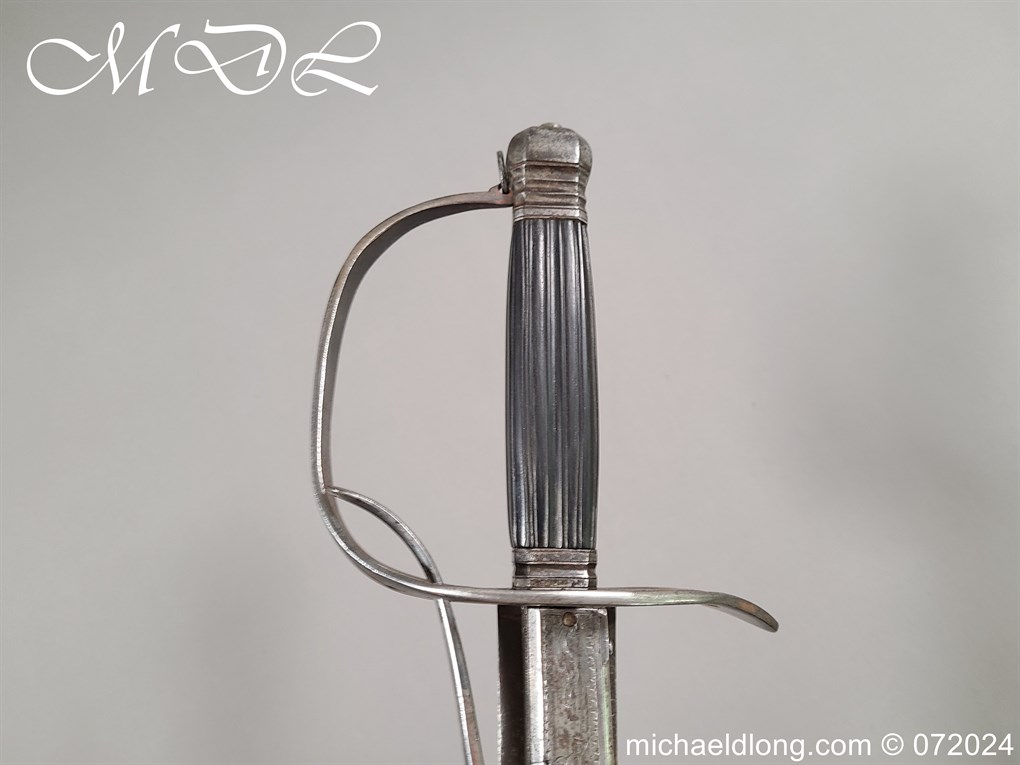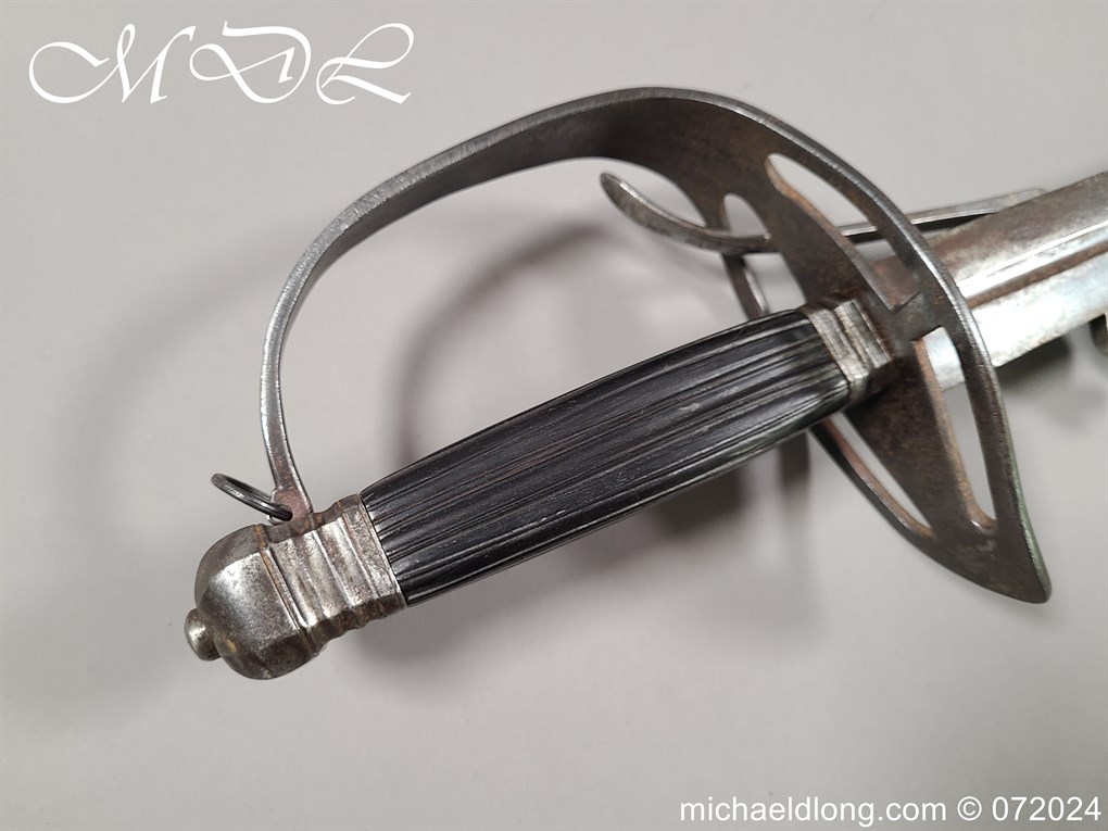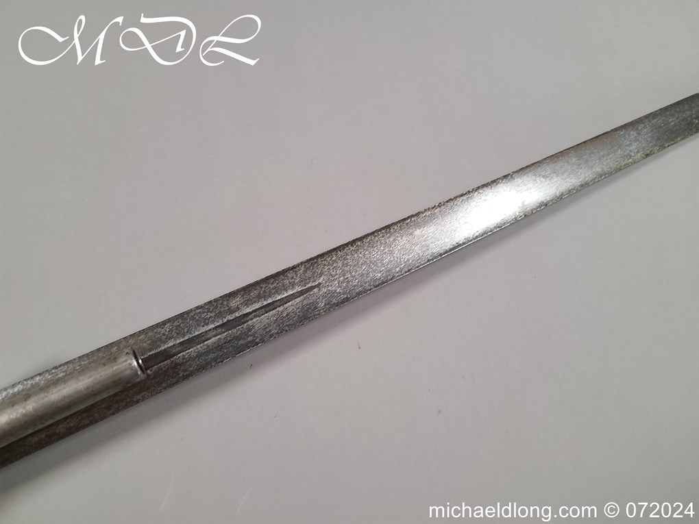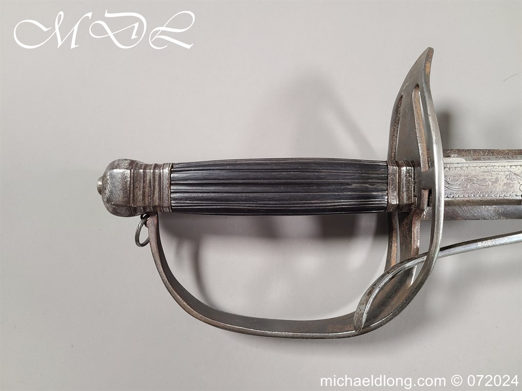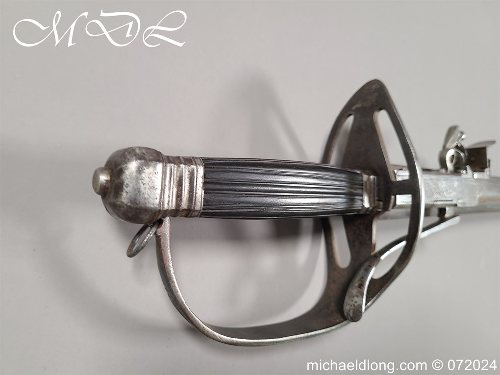 Flintlock 19th Century Sword Pistol, the sword is a ebony gripped slot hilt infantry sword c 1780 to which a flintlock pistol has been mounted. The lock plate is engraved with trophies of arms and floral decoration,the barrel and chamber measurement is 12cm. The tigger is a curved extended bar which fits nicely through one of the slots in the hilt which has slightly been enlarged. Overall length 98cm, for other examples of combination sword and dagger pistols please see Firearms Curiosa by Lewis Winant