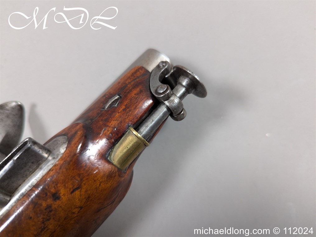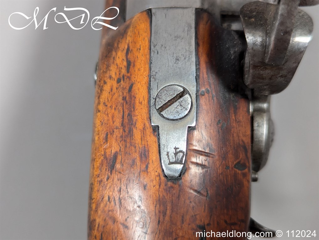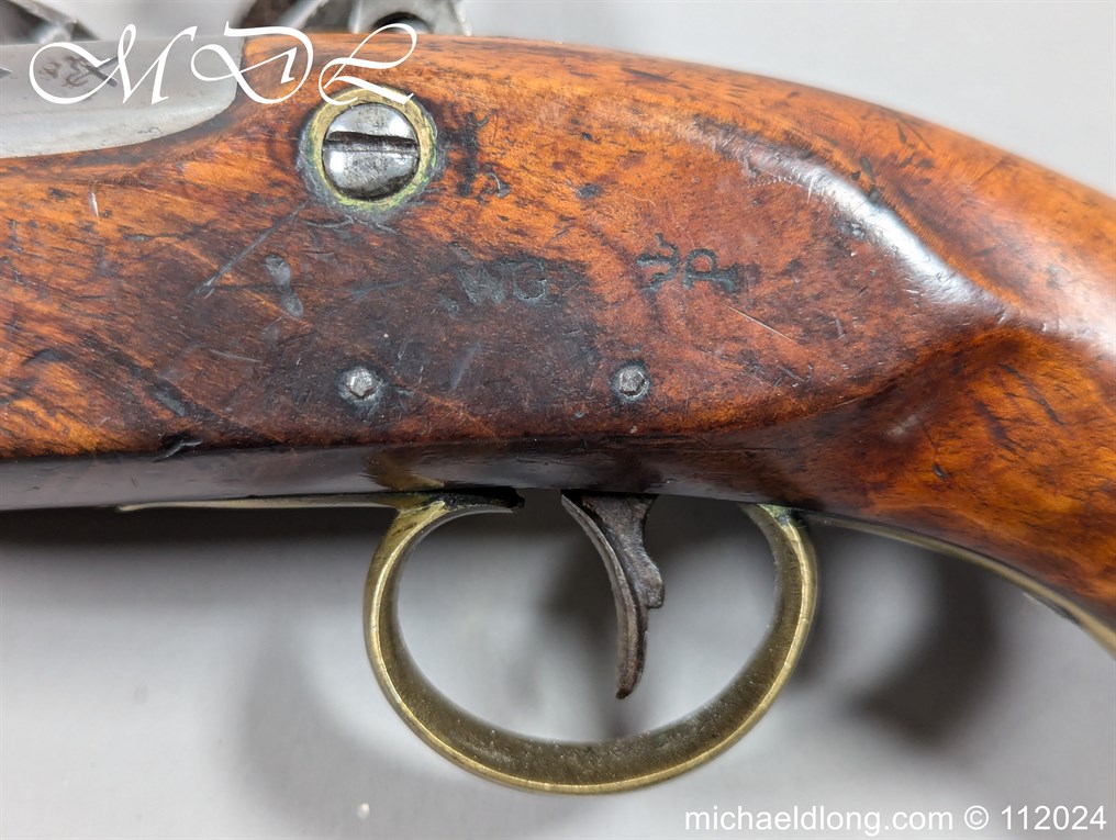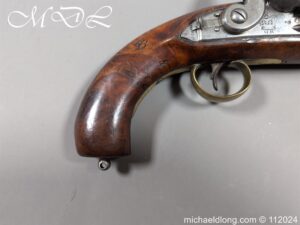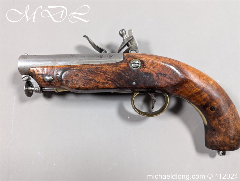 Flintlock Customs and Coast Guards Pistol 1831 Pattern. With plain sighted barrelled the tang stamped with ordnance proofs and inspection marks, the lock with crowned GR and TOWER across the tail, sliding safety catch, ring-necked cock, stock stamped with Board of Ordnance marks on one side of the butt, regulation brass mounts including oval butt-plate and stirrup ramrod. Please Note UK shipping free the rest of the world at cost.