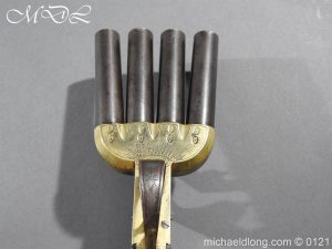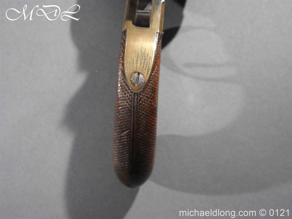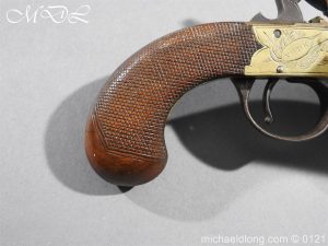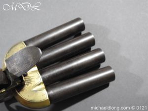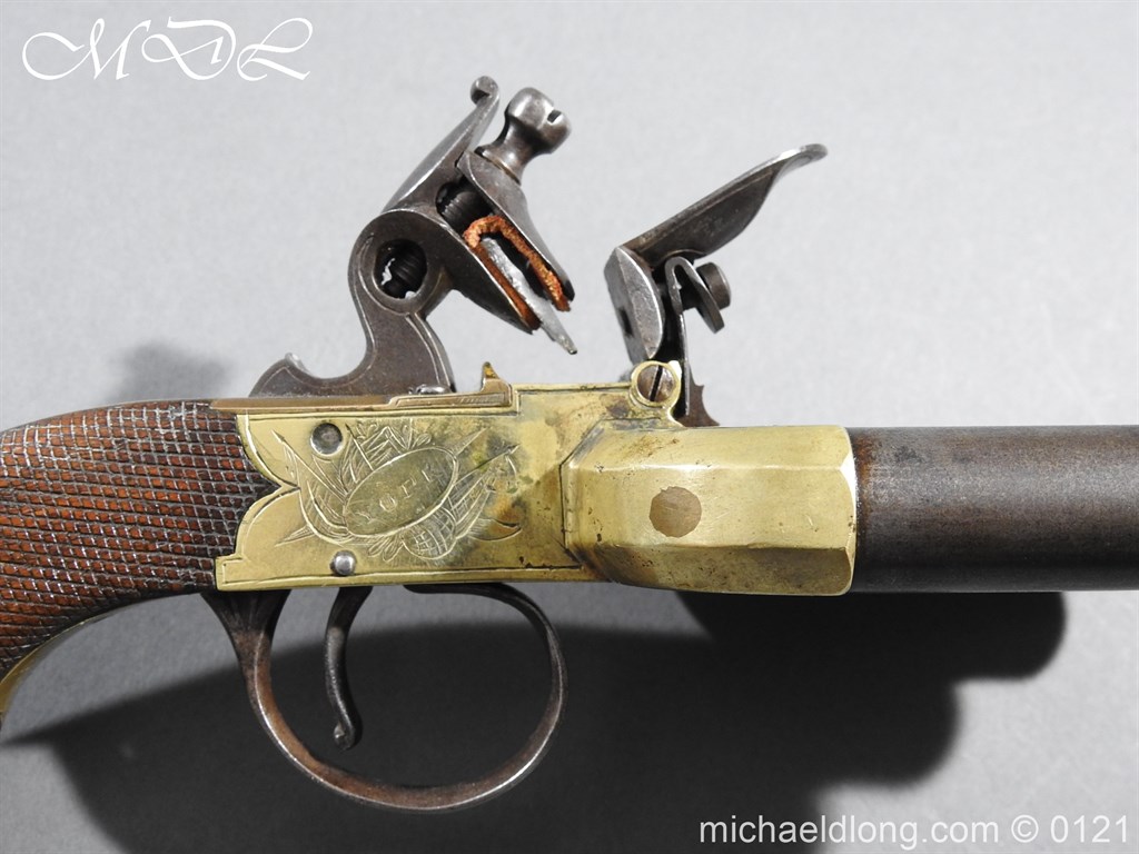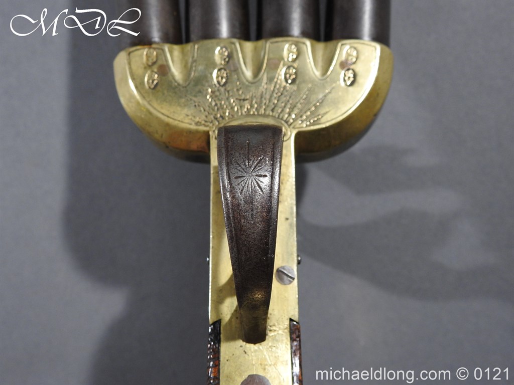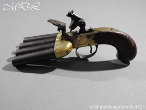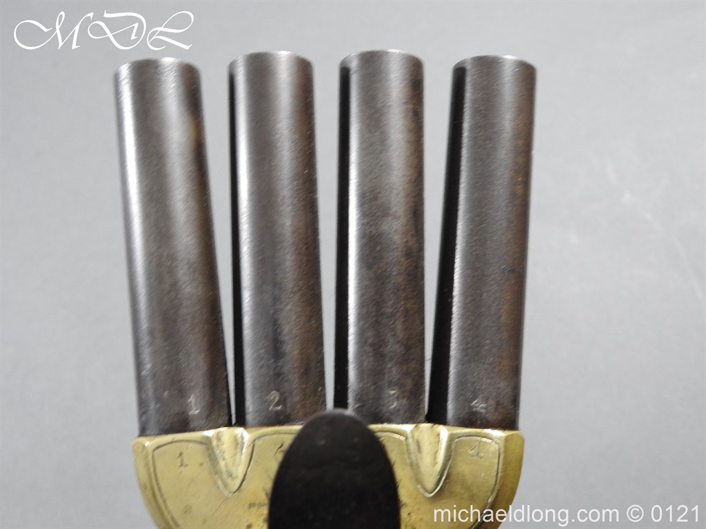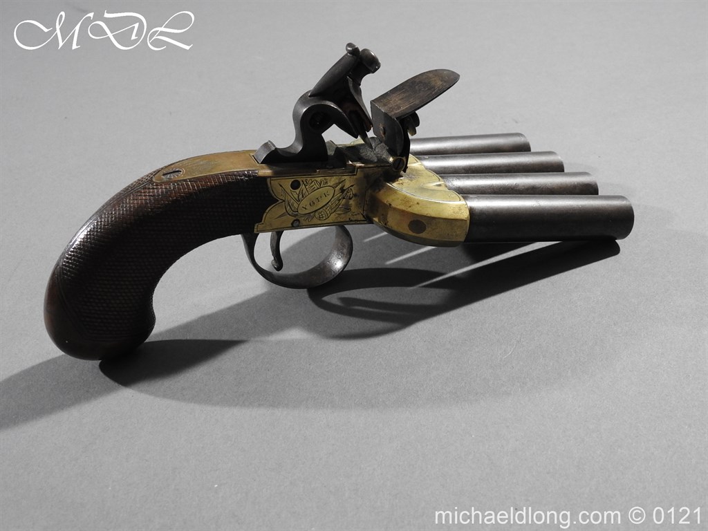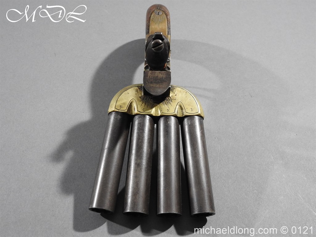 Extremely rare four barrel flintlock pistol known as a ducks foot due to it’s shape. Made by Forth of York who operated between 1800 and 1813 it has a brass box lock frame with makers details and ganitures engraved to each side complete with chequered one piece grip. London proof marks to each of the four beeches and four 3 inch turn off barrels numbered 1 to 4 as is the top of the beech. Action in good working order and all steelwork has a good grey – brown patina overall length 8.5 inches