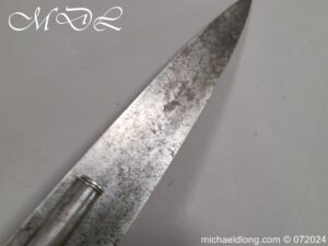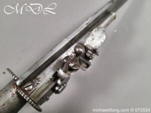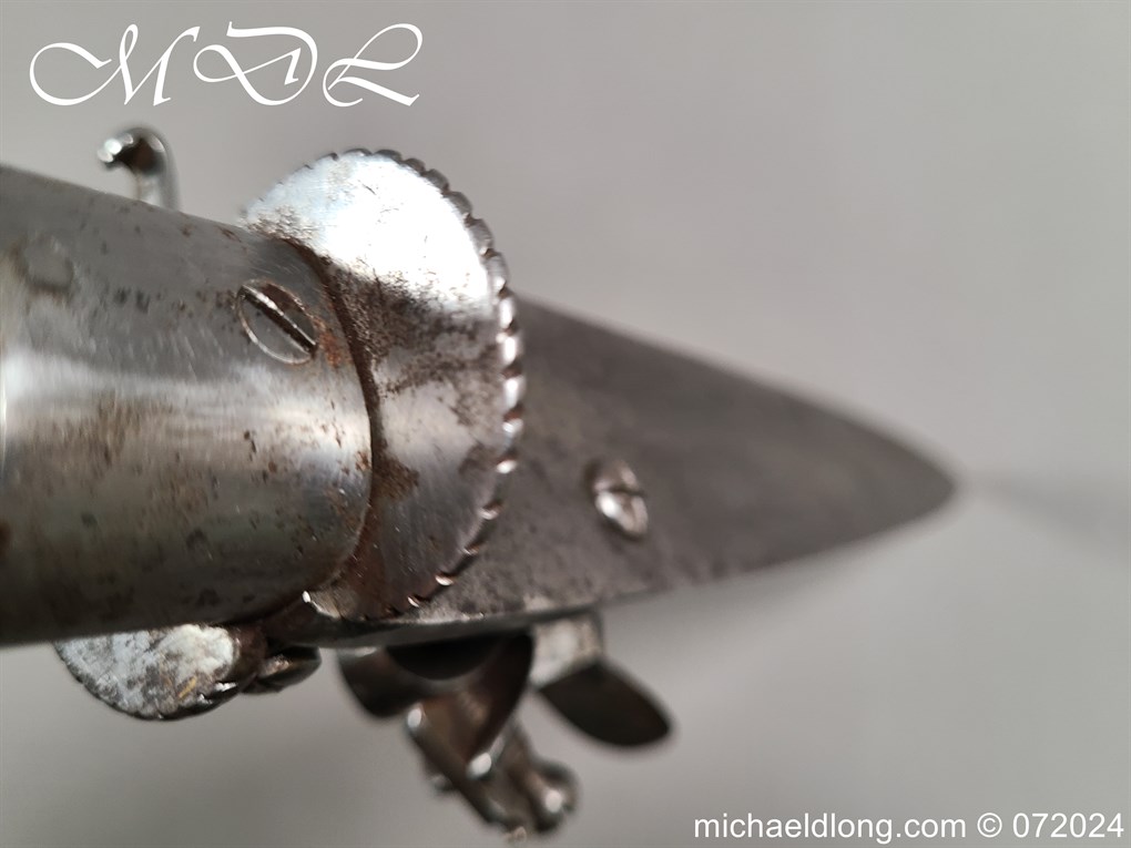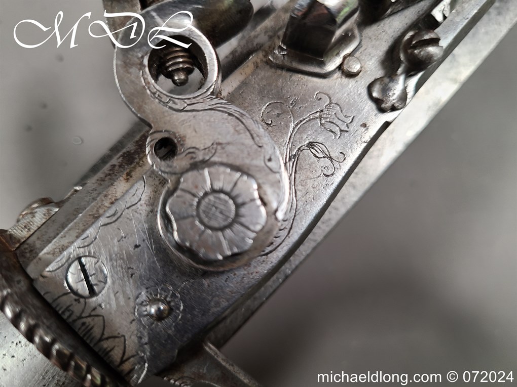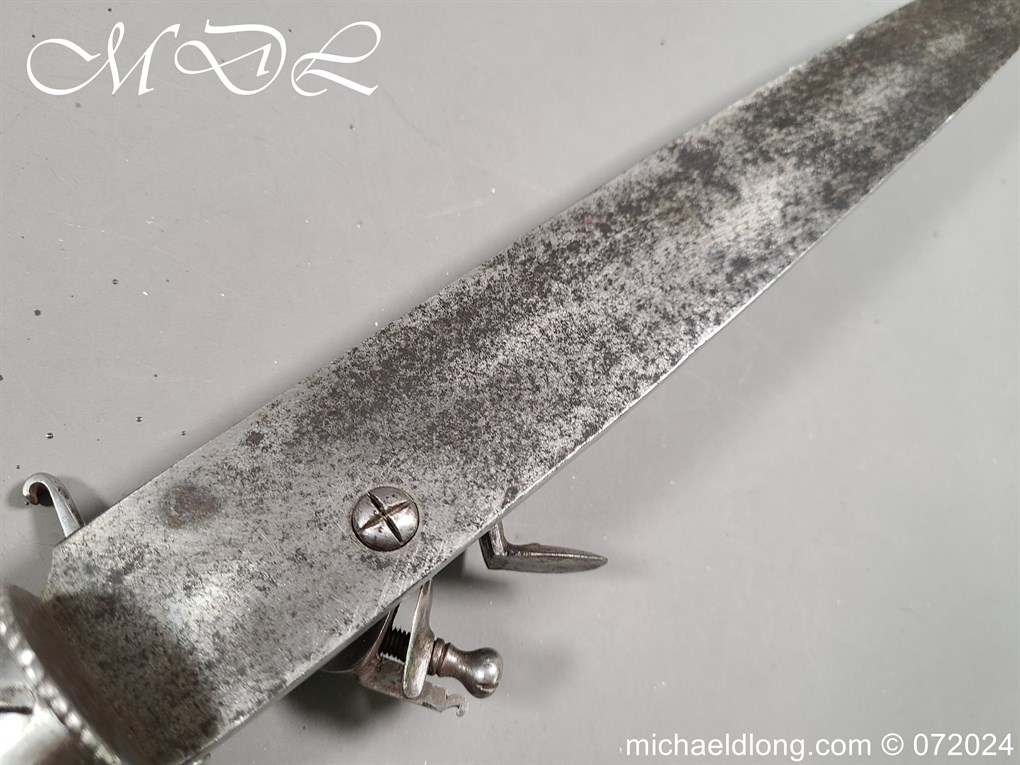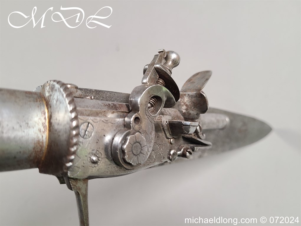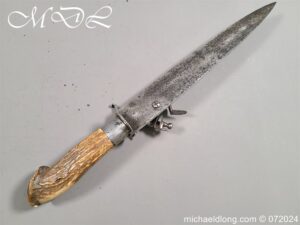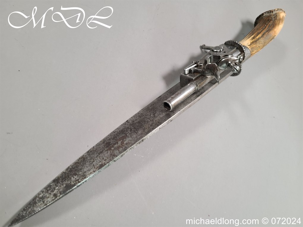 Flintlock Hunting Dagger 19th century large wide blade with flintlock mechanism and barrel mounted to one side which is engraved with floral decoration and the hammer is secured by a flower head. The grip made of stag horn which has been worn smooth to one side and has small slightly offset split guards and complete with engraved butt cap. Overall length 46cm the blade 32cm and at the widest point 4 cm