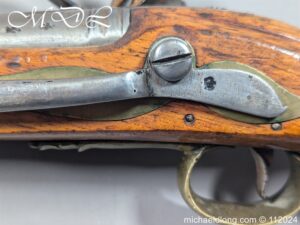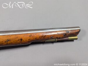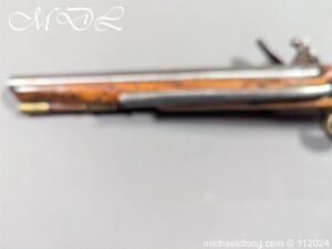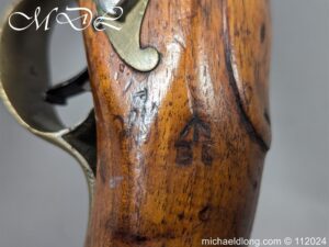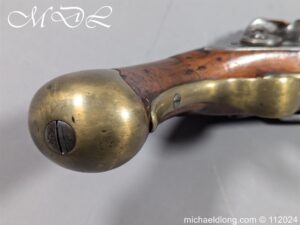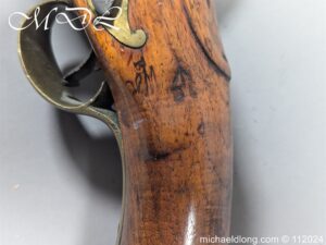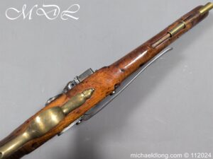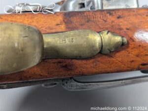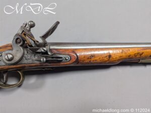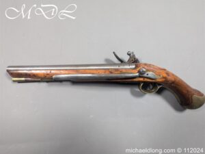 Flintlock Long Sea Service Pistol the barrel with numerous ordnance marks at the breech, plain tang with a crown inspection mark. The lock with GR crowned and TOWER across the tail and with ordnance mark underneath the pan, ring-neck cock, full-stocked in walnut with apron around the barrel tang and belt hook with inspection marks. Regulation brass mounts including butt cap, trigger guard and ramrod pipes please see images. Note very small crack near muzzle please see image. Please Note UK shipping free the rest of the world at cost.