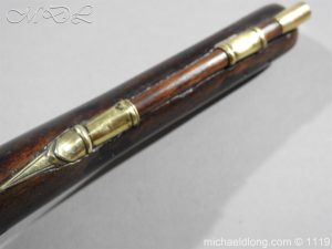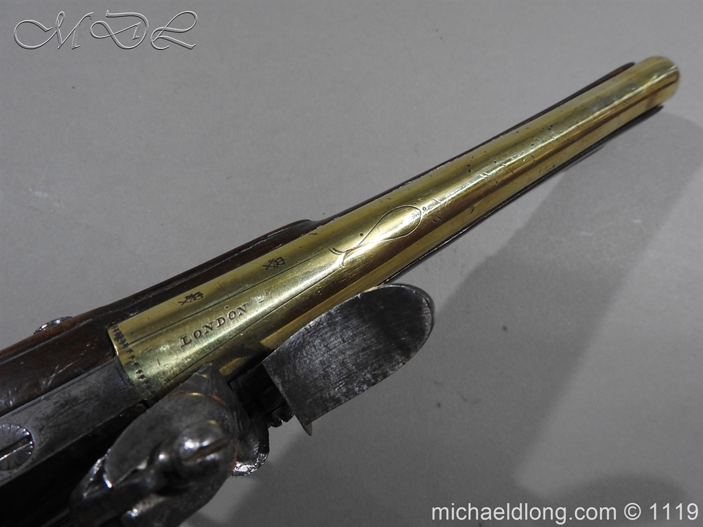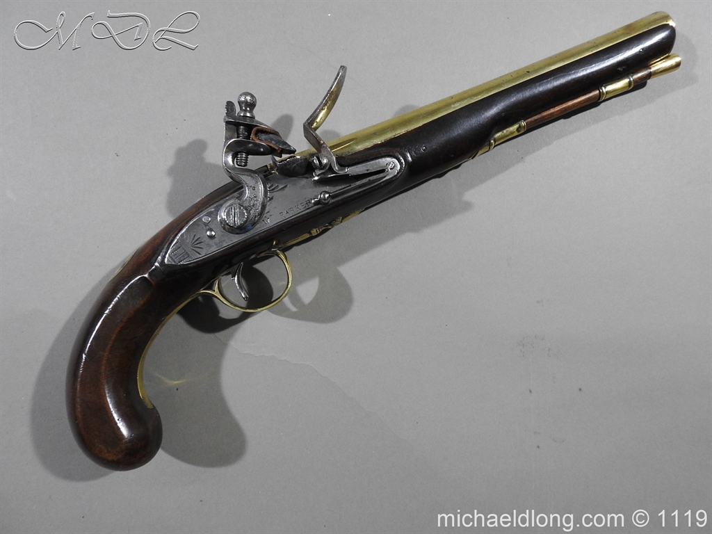 Flintlock Pistol by W Parker with polished steel side plate maker marked W Parker lock in full working order. Brass barrel marked London and with proof stamps matching brass ornate fittings and complete with wood ram rod with brass tip overall length 37cm barrel 24cm – Sorry UK Shipping only