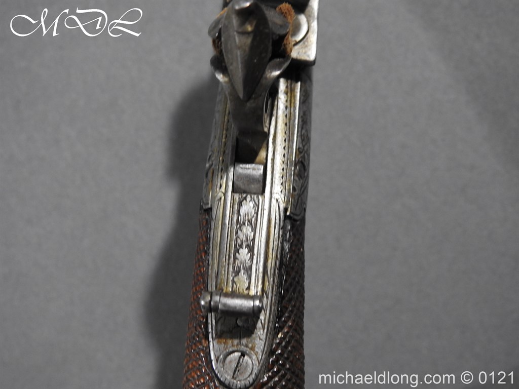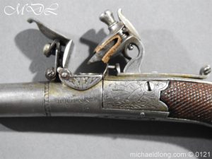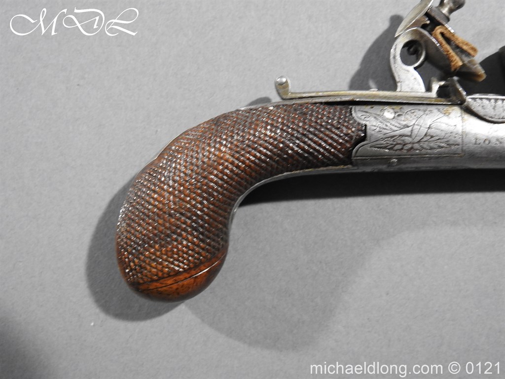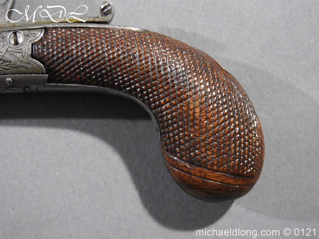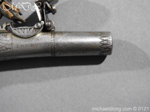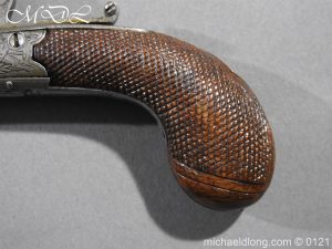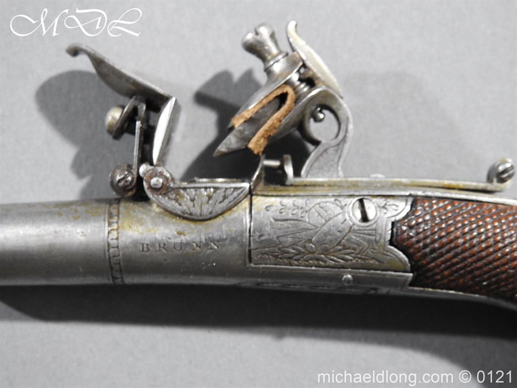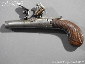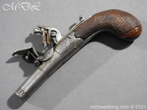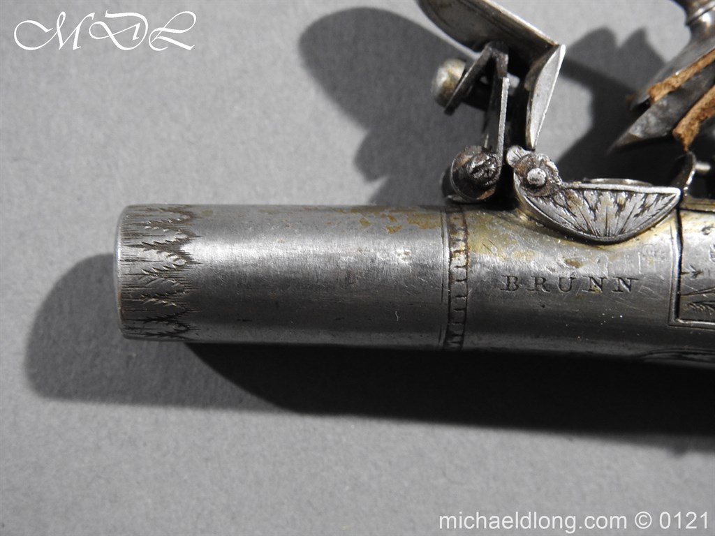 Small Flintlock Pocket Pistol by Brunn of London. With turn-off barrel decorated with a band of foliage at the muzzle, engraved rounded action, struck with London proofs at the breech engraved London to one side and Brunn to the other the action engraved within panels depicting stands of arms with sliding safety catch that also locks the pan, chequered walnut butt with escutcheon engraved with initials. Action in good working order overall length 5 inches barrel 1.25 inches