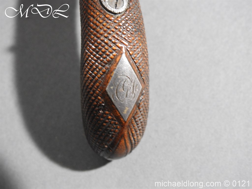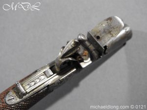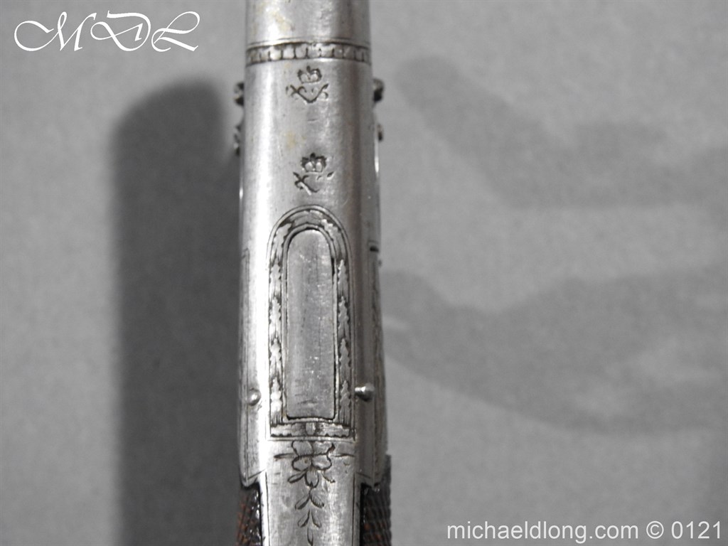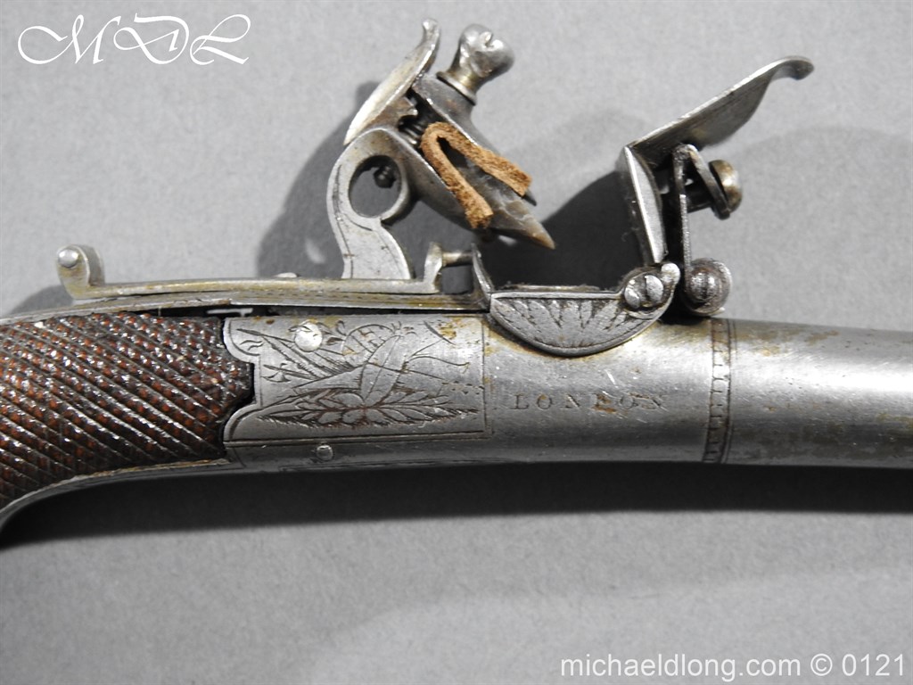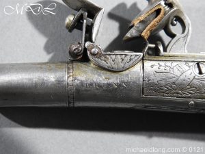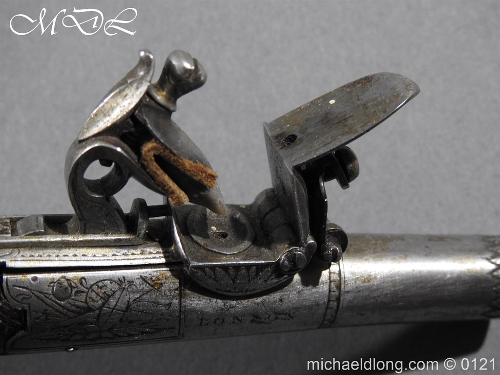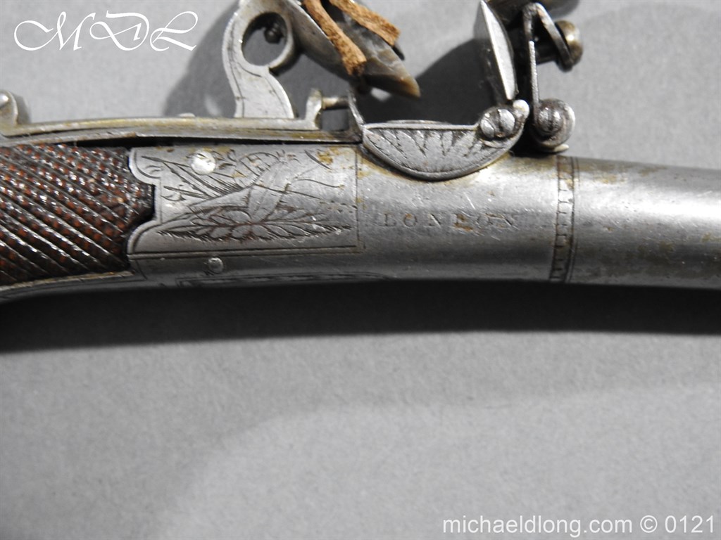 Small Flintlock Pocket Pistol by Brunn of London. With turn-off barrel decorated with a band of foliage at the muzzle, engraved rounded action, struck with London proofs at the breech engraved London to one side and Brunn to the other the action engraved within panels depicting stands of arms with sliding safety catch that also locks the pan, chequered walnut butt with escutcheon engraved with initials. Action in good working order overall length 5 inches barrel 1.25 inches