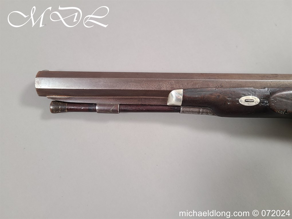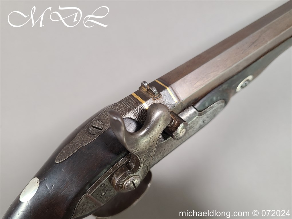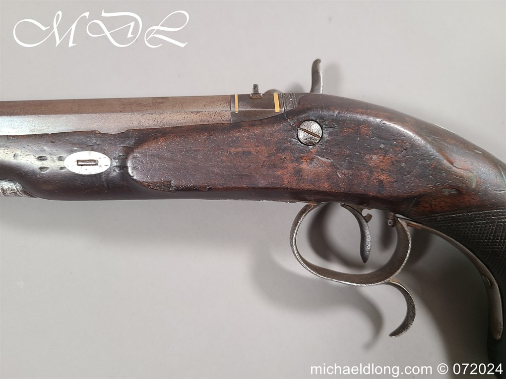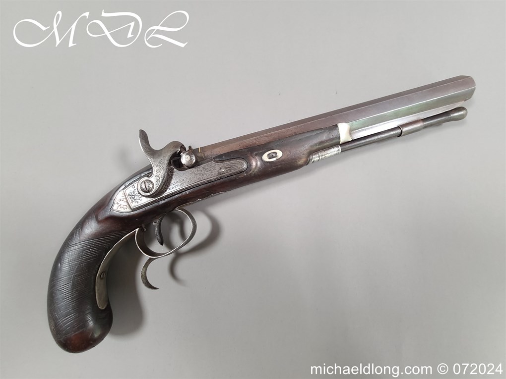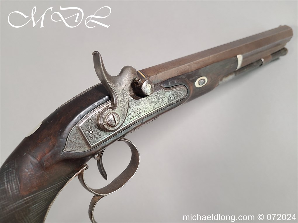 Forsyth Patent Percussion Pistol, browned barrel with white metal mount. Lock plate and trigger guard nicely engraved, chequered stock with age wear complete with original ramrod and mechanism in full working order, overall length 37.5cm the barrel 26cm