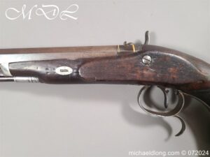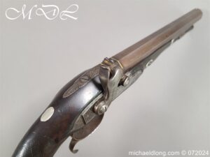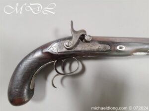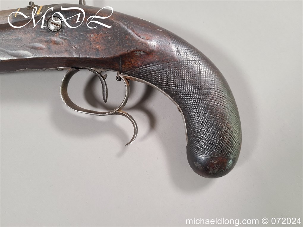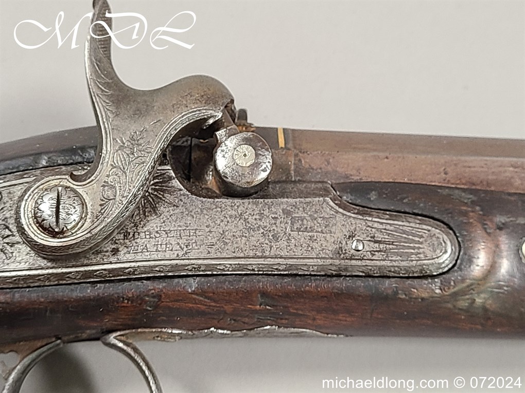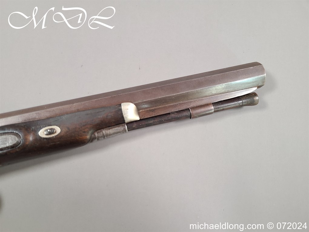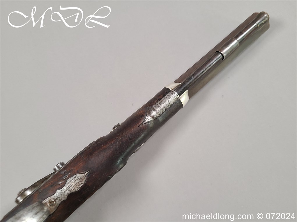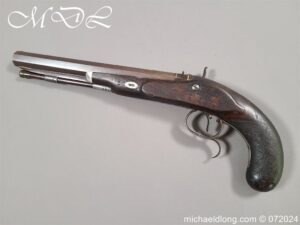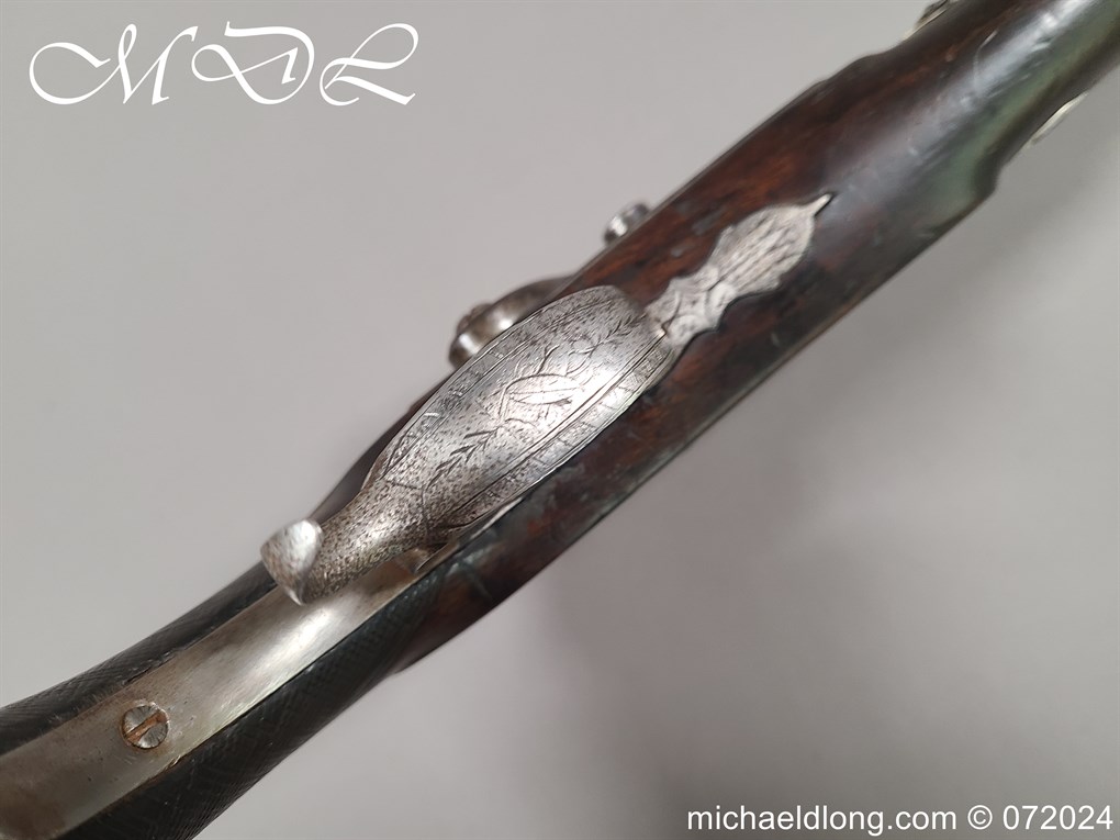 Forsyth Patent Percussion Pistol, browned barrel with white metal mount. Lock plate and trigger guard nicely engraved, chequered stock with age wear complete with original ramrod and mechanism in full working order, overall length 37.5cm the barrel 26cm