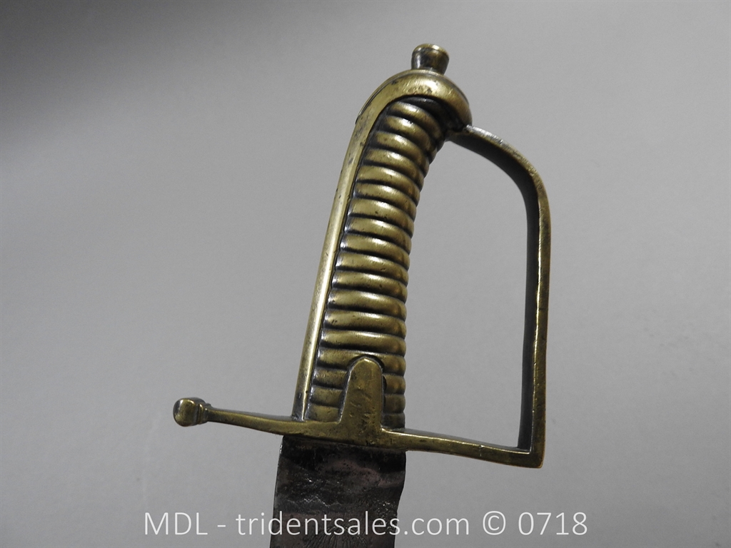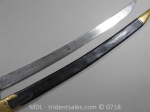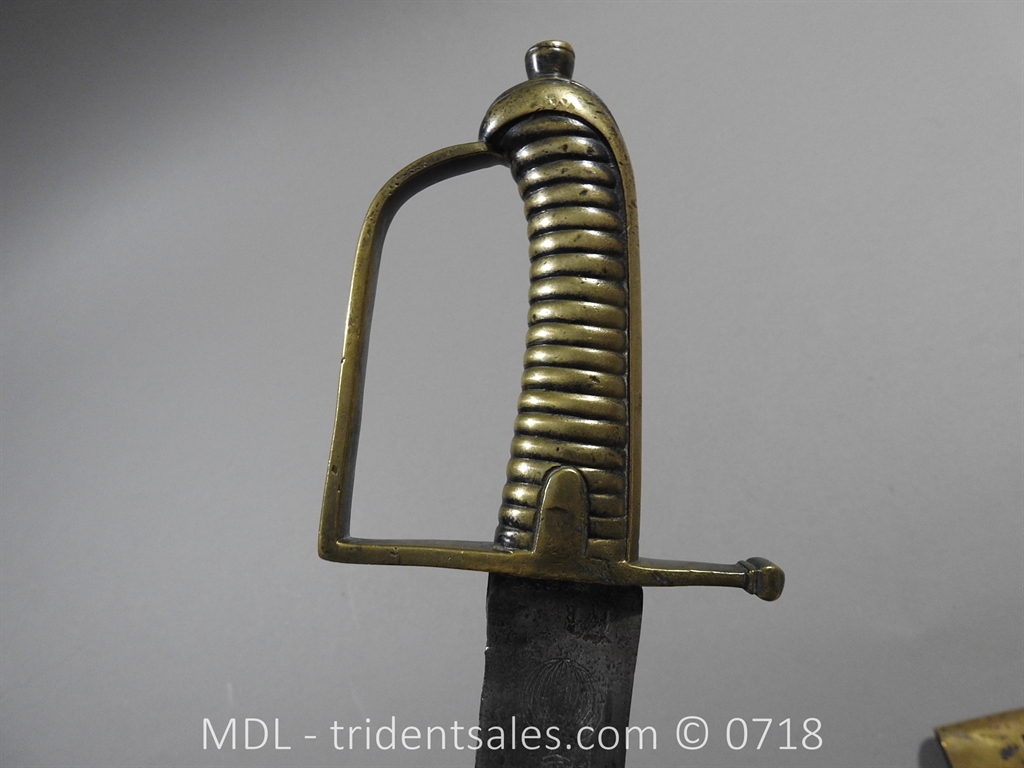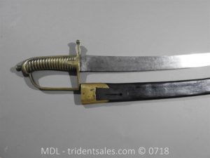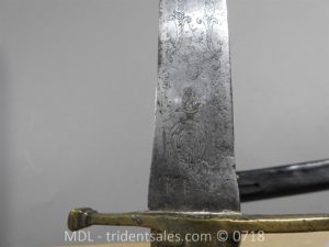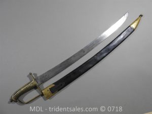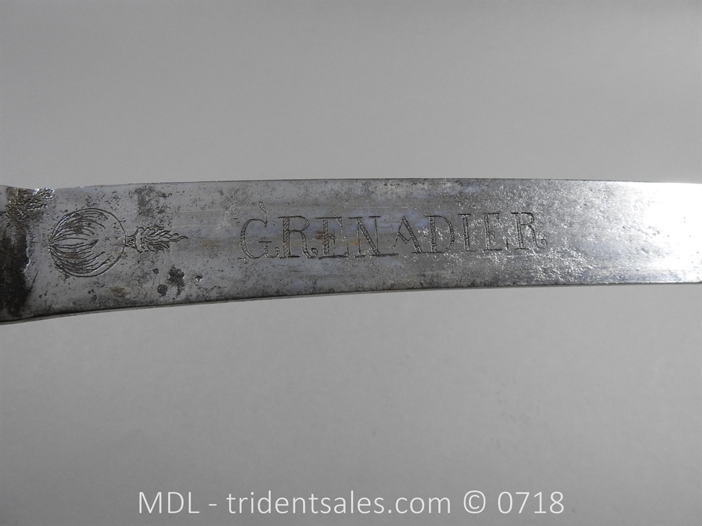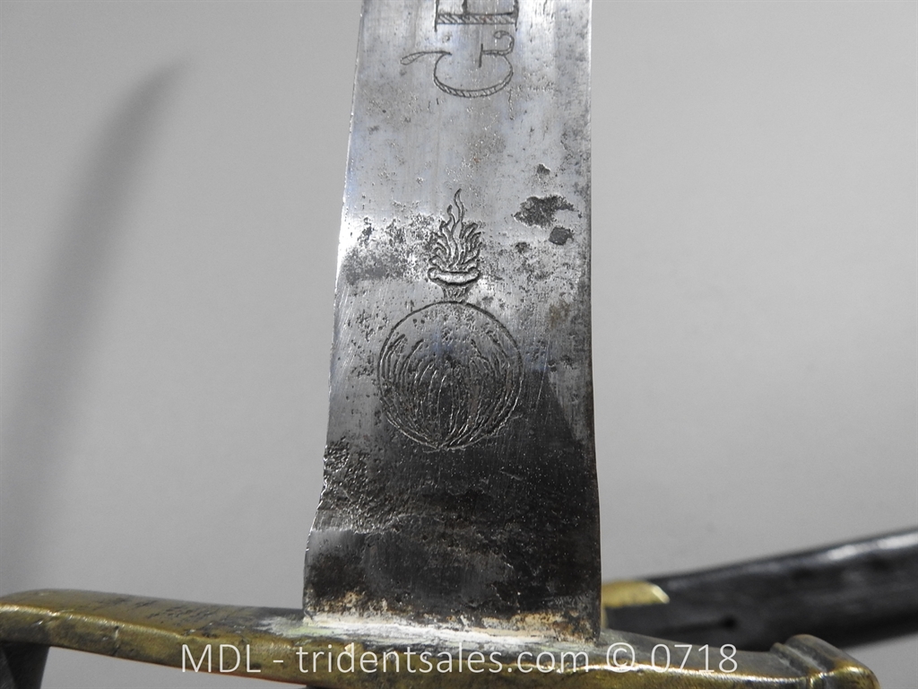 Brass one piece ribbed grip, crossguard and pommel. Steel single edged blade, with flaming grenade and scrolled crest of Louis XV plus R.B. on one side and flaming grenade and ‘Grenadier’ on the other side. The back edge of the blade marked Mture Rle D’alsace ( Became Klingenthal after 1768) In its brass mounted black leather scabbard, locket with securing strap rather than a stud and chape has a ‘ball’ tip. Length 722mm Blade 585mm.