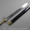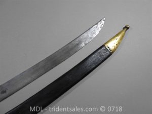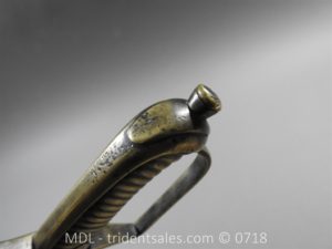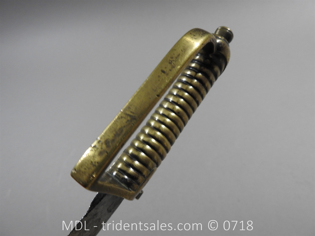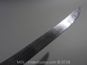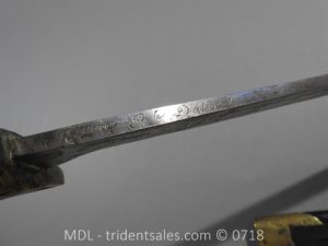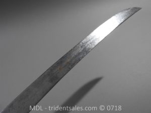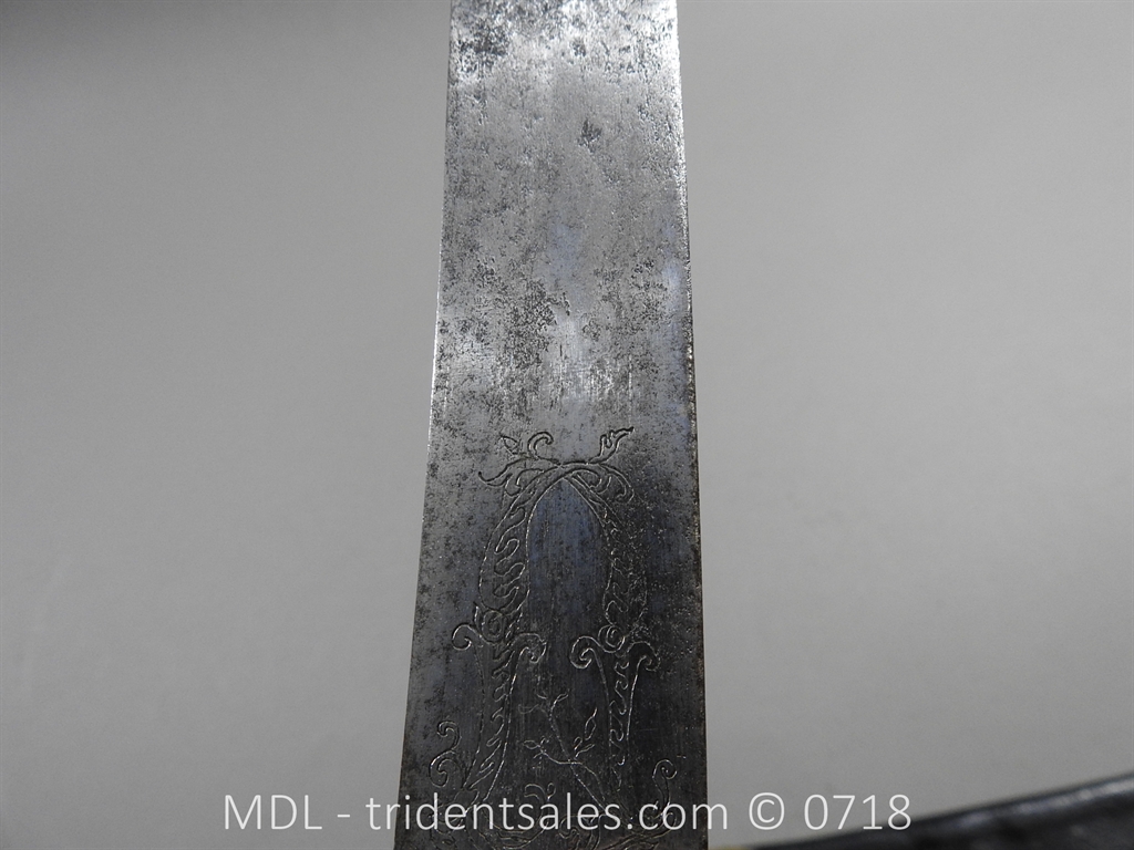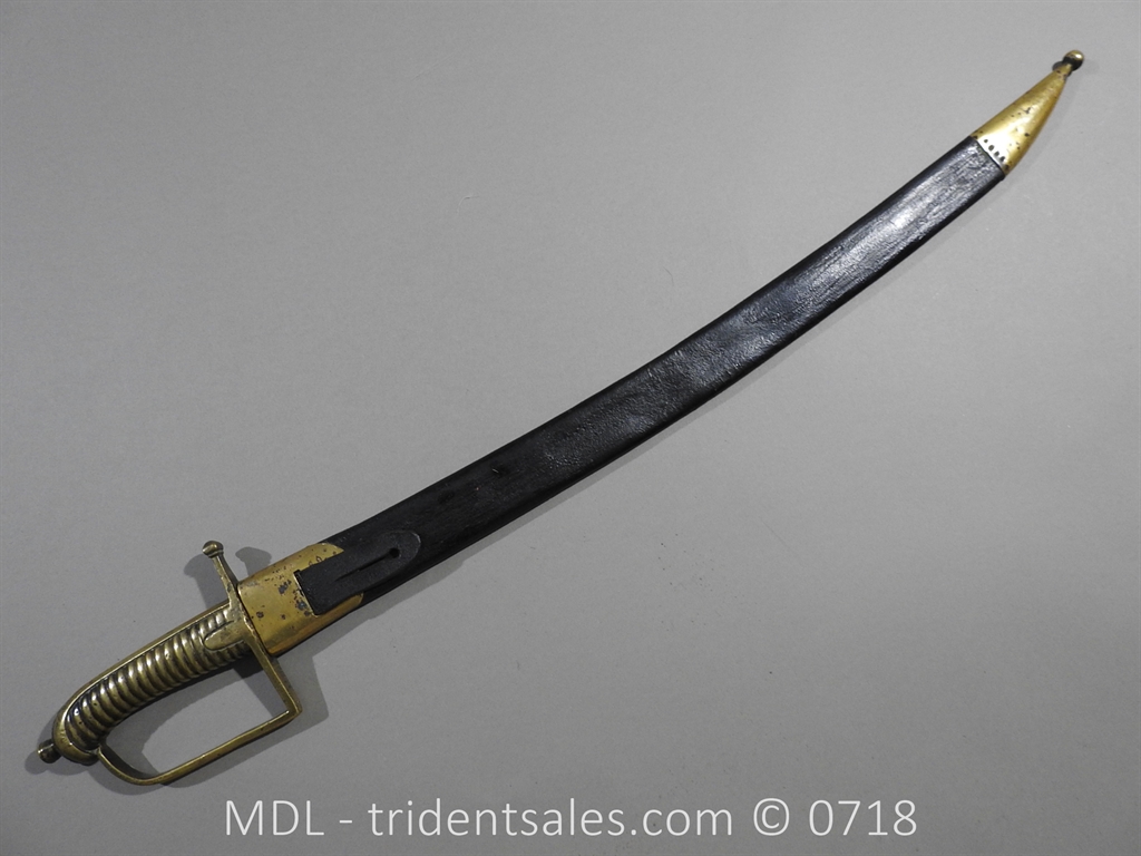 Brass one piece ribbed grip, crossguard and pommel. Steel single edged blade, with flaming grenade and scrolled crest of Louis XV plus R.B. on one side and flaming grenade and ‘Grenadier’ on the other side. The back edge of the blade marked Mture Rle D’alsace ( Became Klingenthal after 1768) In its brass mounted black leather scabbard, locket with securing strap rather than a stud and chape has a ‘ball’ tip. Length 722mm Blade 585mm.