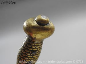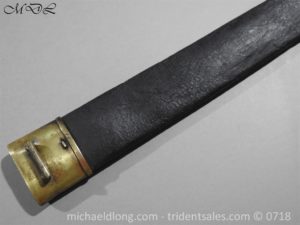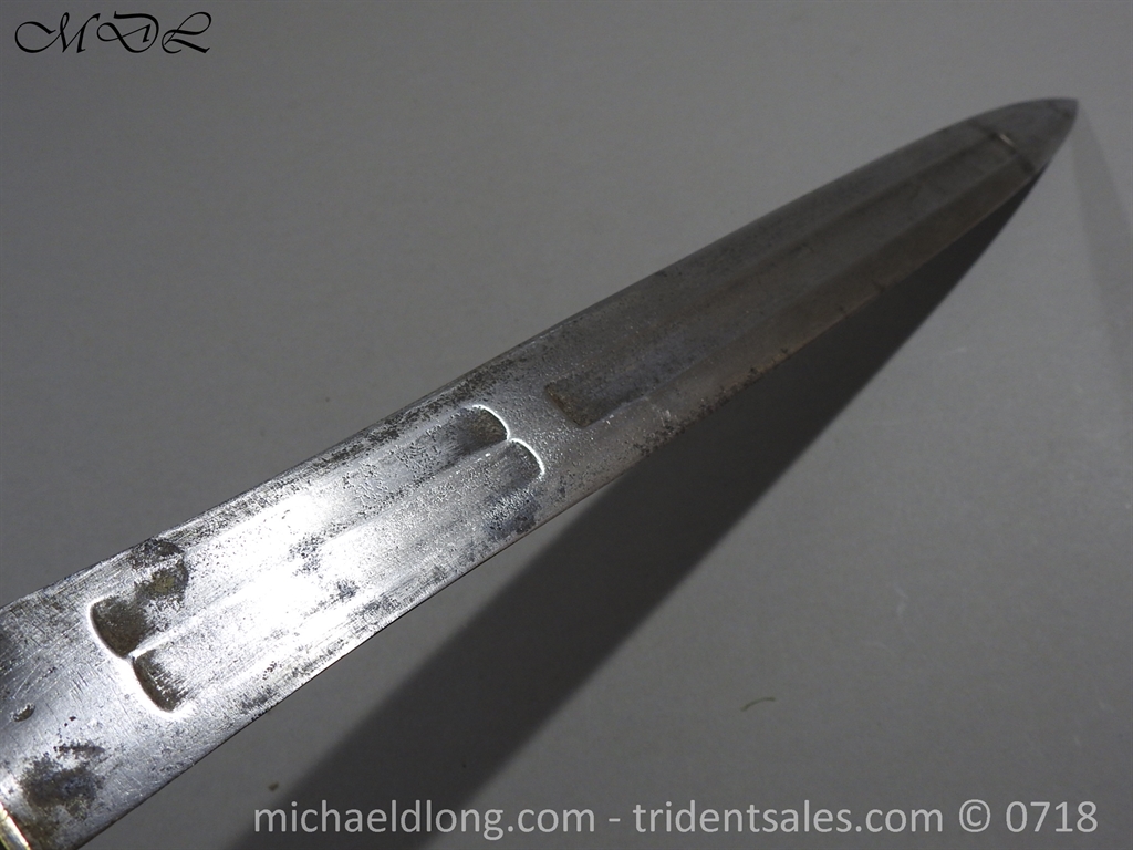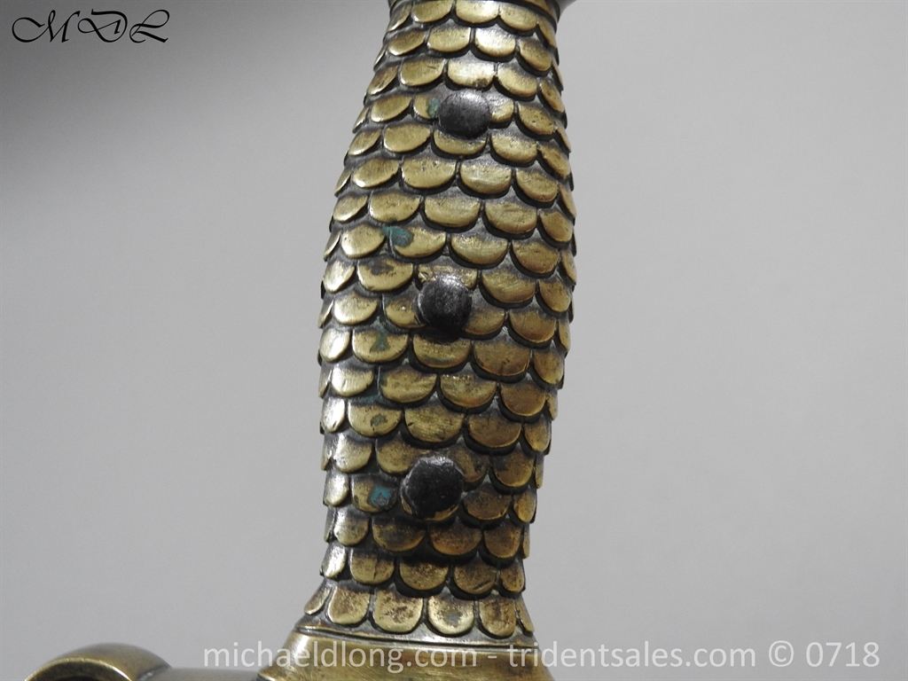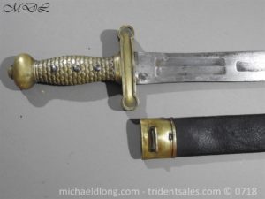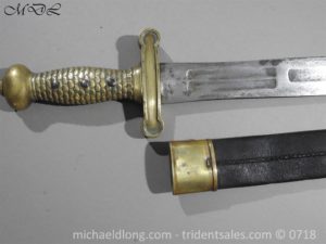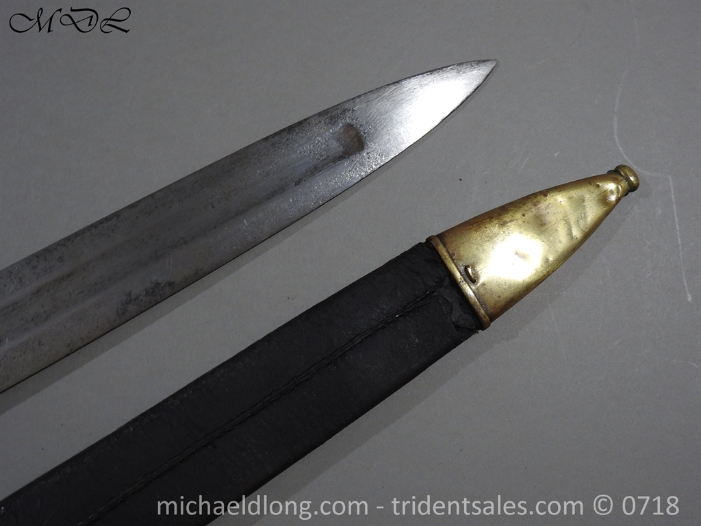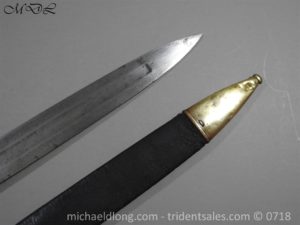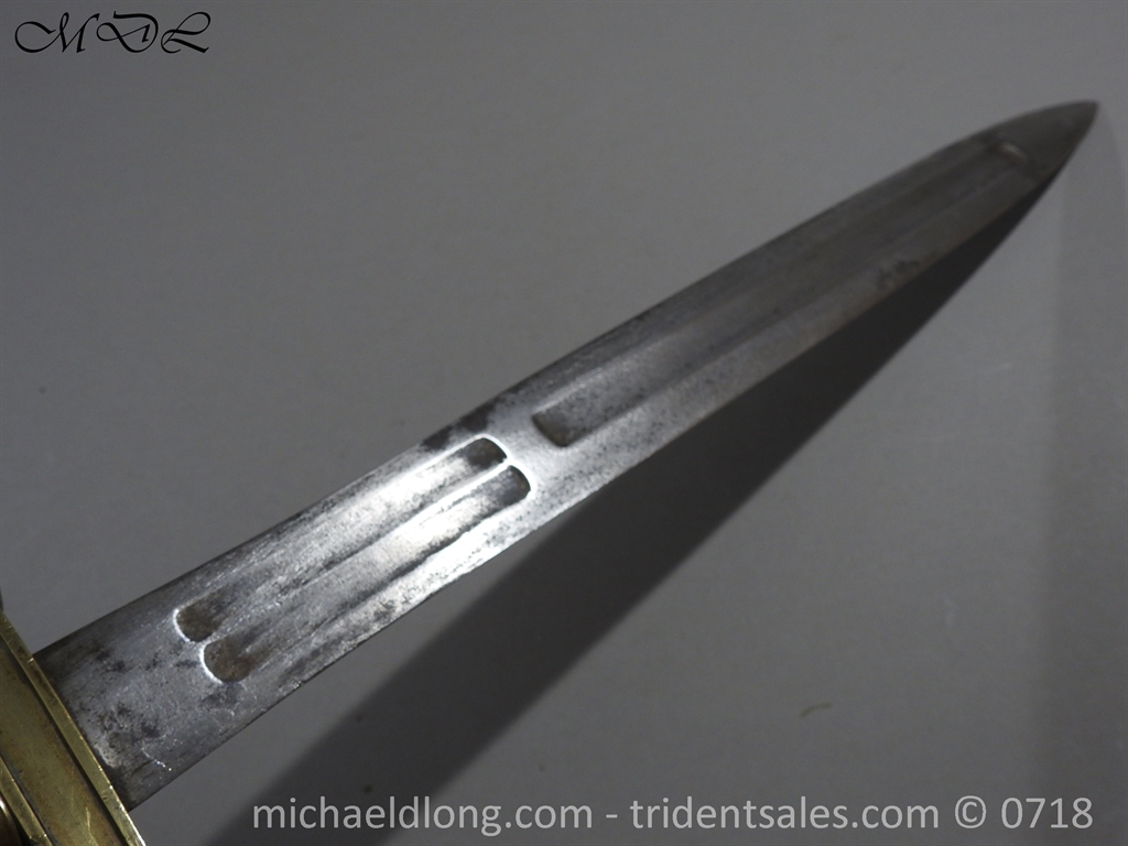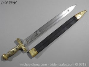Brass one piece grip, crossguard and plain pommel. Grip with stepped scale pattern secured to tang with 3 steel rivets. Underside of guard marked with crown over 8 and other encircled government inspection marks. Distinctive steel Gladius blade with twin and single fullers on each side of the blade. Encircled inspection stamps on the ricasso. In its brass mounted black leather scabbard. Length 636mm Blade 482mm.