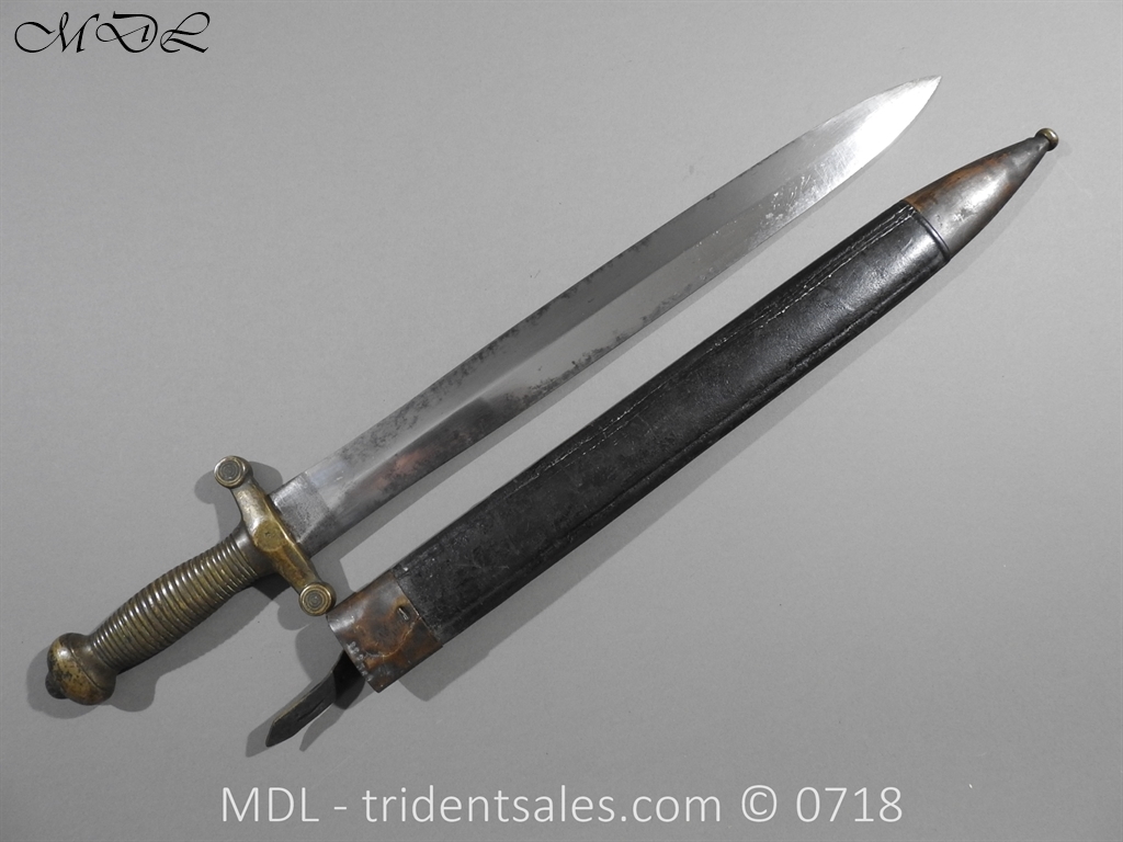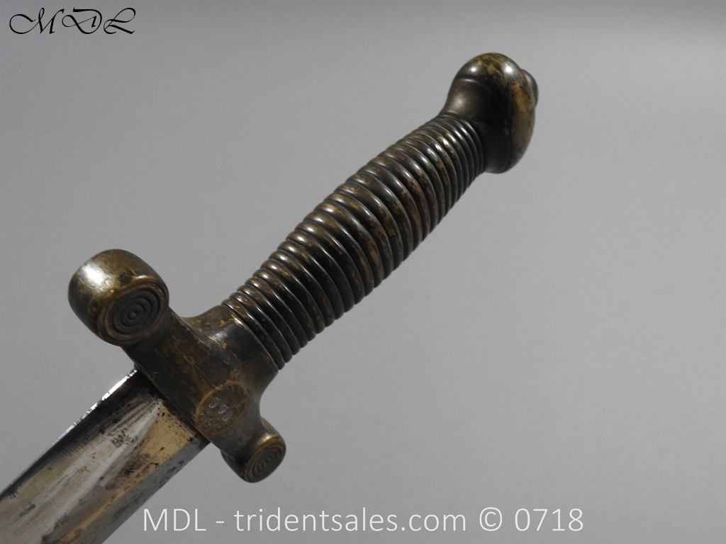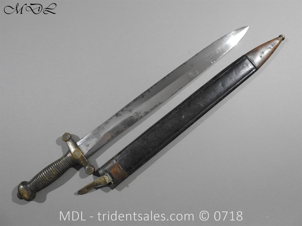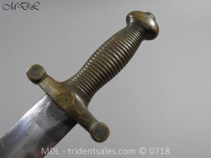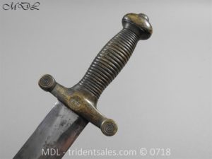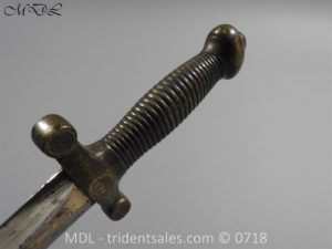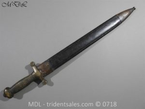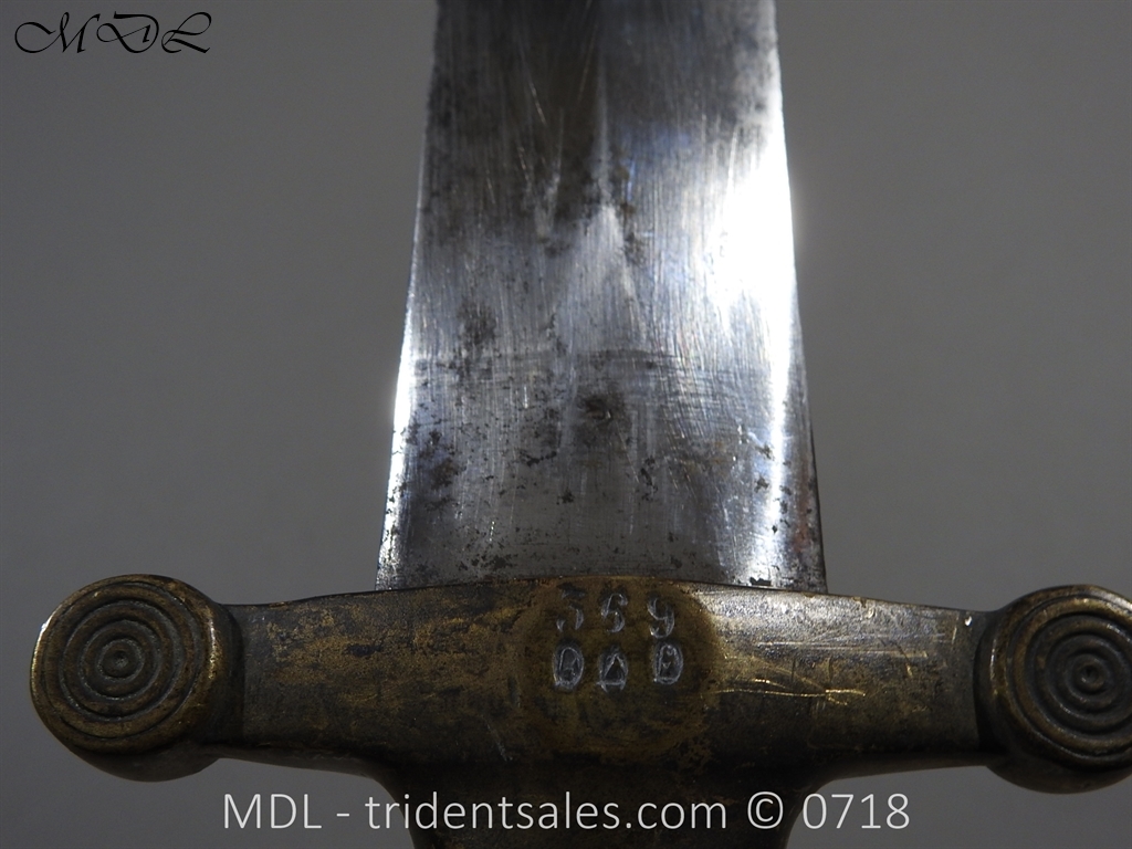 Brass on piece grip, crossguard and pommel. Crossguard marked with original small number 578 & later larger numbers 369, other side with a ‘star’ inspection stamp. Steel double edged blade marked at ricasso with Thiebaut 1832 on one side and an Inspection stamp on the other.(Thiebaut is a private manufacturer) In its brass mounted black leather scabbard, locket also stamped 578 & 369. Length 632mm Blade 481mm