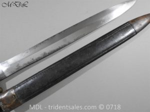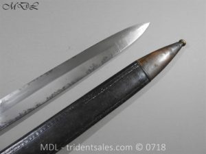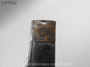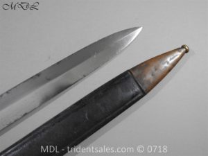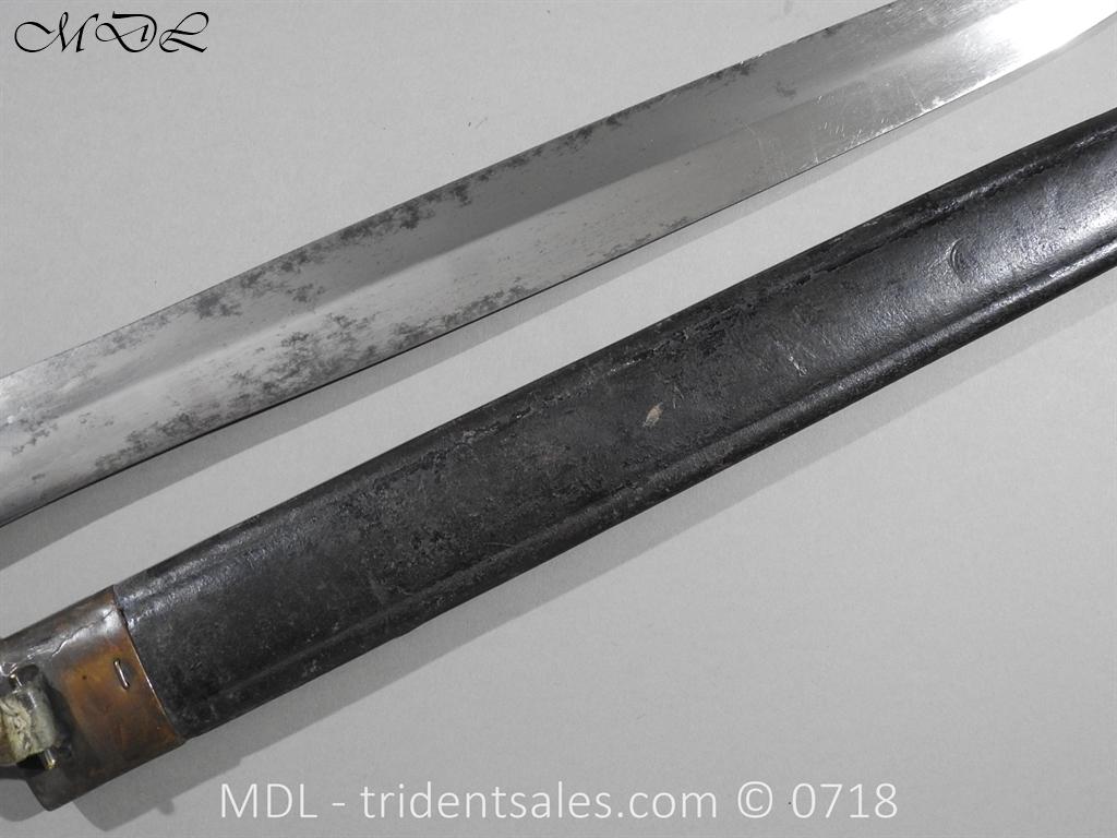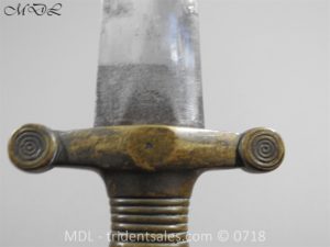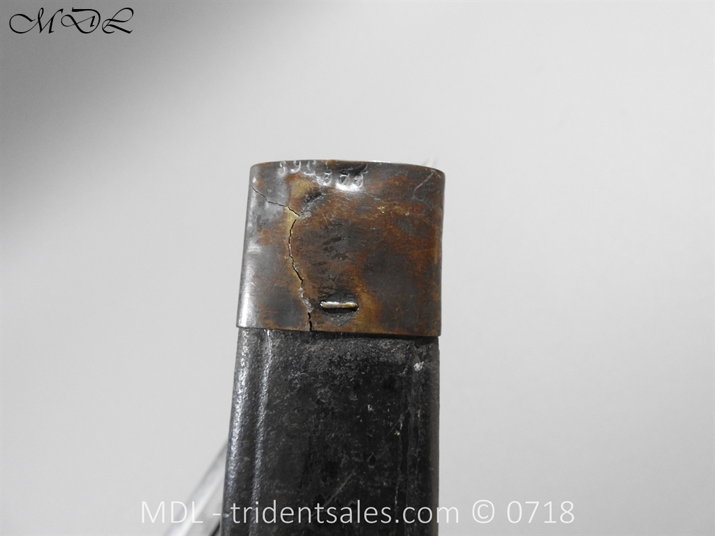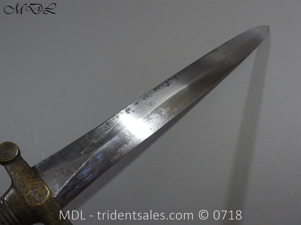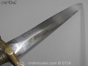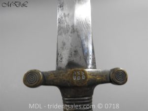 Brass on piece grip, crossguard and pommel. Crossguard marked with original small number 578 & later larger numbers 369, other side with a ‘star’ inspection stamp. Steel double edged blade marked at ricasso with Thiebaut 1832 on one side and an Inspection stamp on the other.(Thiebaut is a private manufacturer) In its brass mounted black leather scabbard, locket also stamped 578 & 369. Length 632mm Blade 481mm