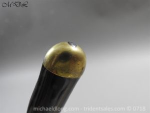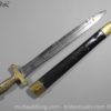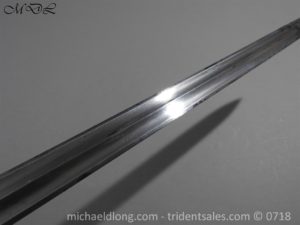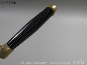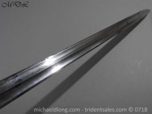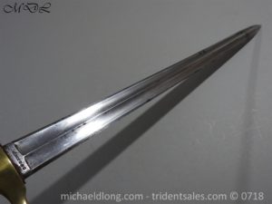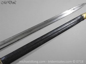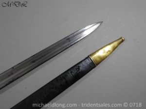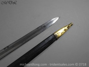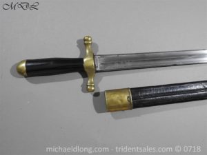 Brass crossguard and pommel with one piece black ebony grip. Steel twin edged and fullered spear pointed blade marked Coulaux A & C (Aine et Compagnie) on one riccasso and Klingenthal on the reverse in its brass mounted black leather scabbard. Length 690mm Blade 552mm.