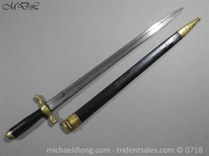 Brass crossguard and pommel with one piece black ebony grip. Steel twin edged and fullered spear pointed blade marked Coulaux A & C (Aine et Compagnie) on one riccasso and Klingenthal on the reverse in its brass mounted black leather scabbard. Length 690mm Blade 552mm.