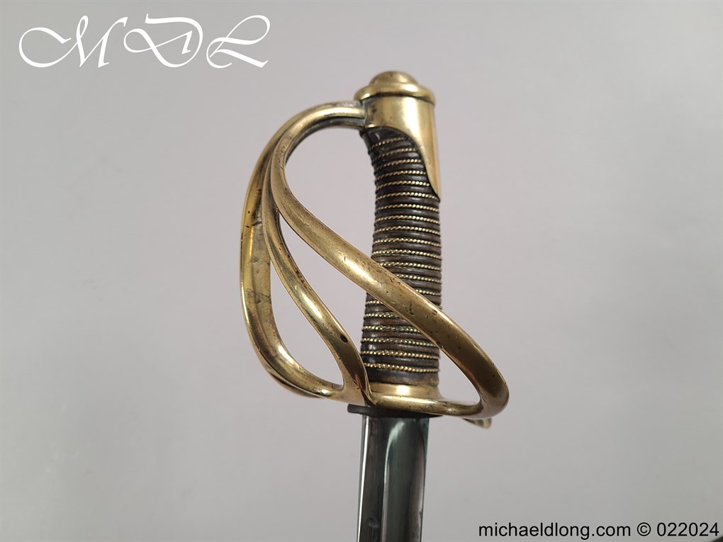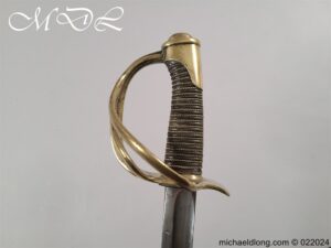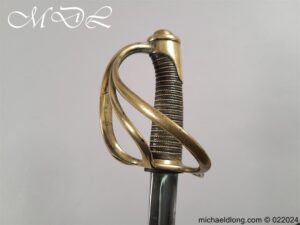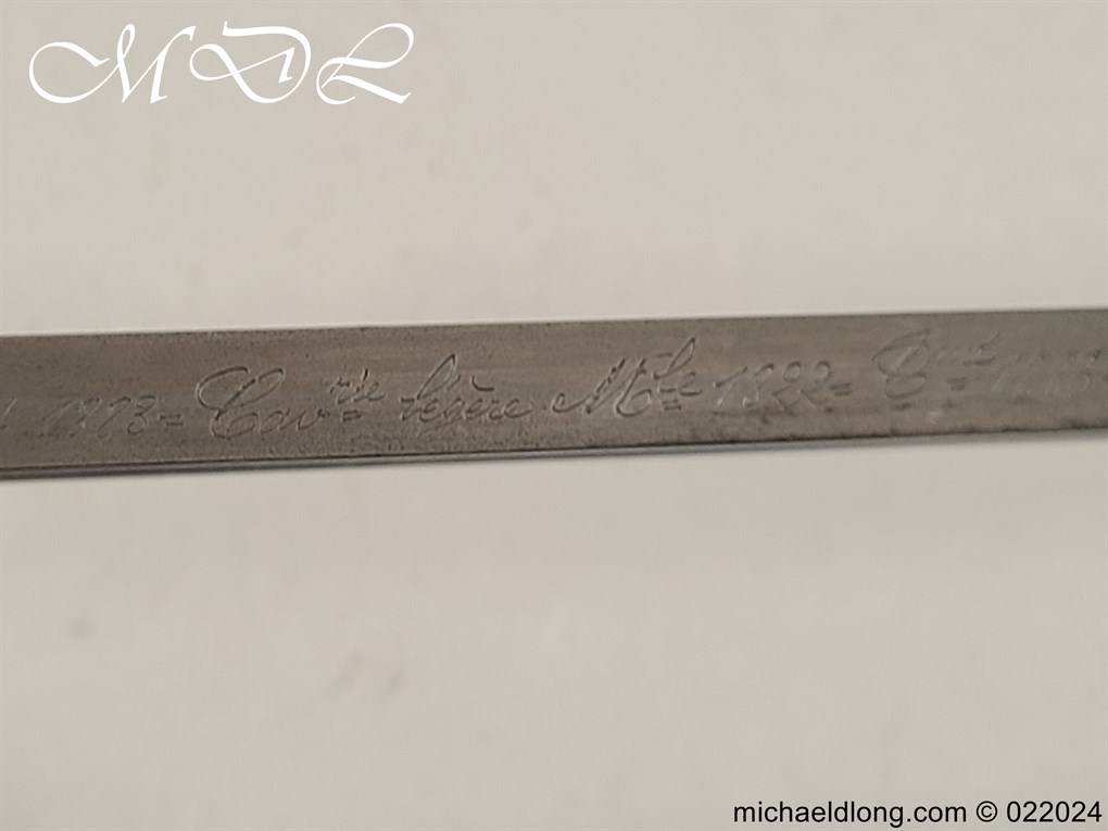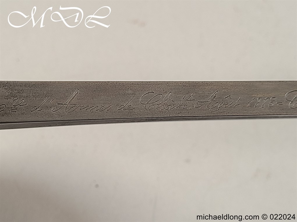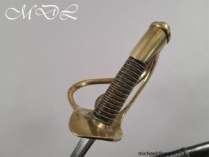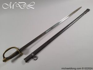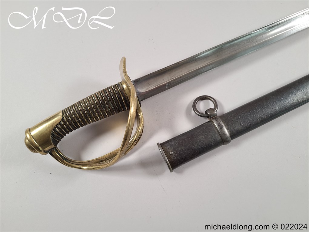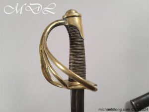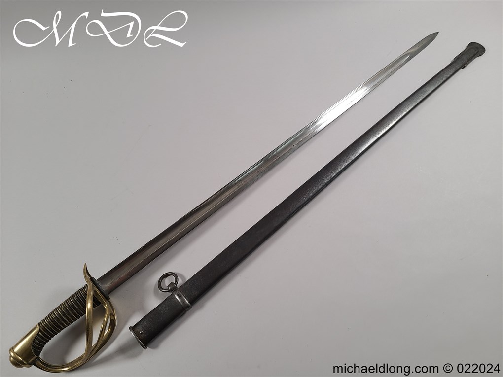 French M 1882 Sabre de Cavalerie Legere, it has a brass hilt with a two bar guard numbered 8702, the wood handle is leather bound with brass wire, it has a straight blade which is in very good condition, the spine is engraved with the manufacturer and dated 1885, complete with steel scabbard with single loose rings and matching number to the hilt 8702 . Size: Overall Length 104cm and the blade 87cm