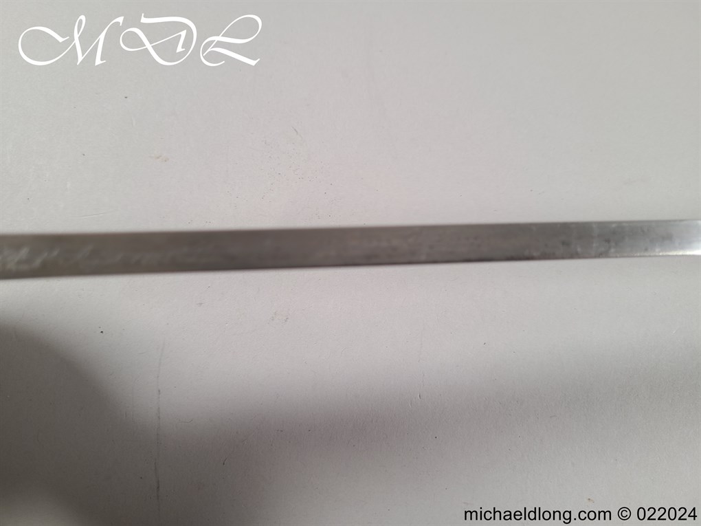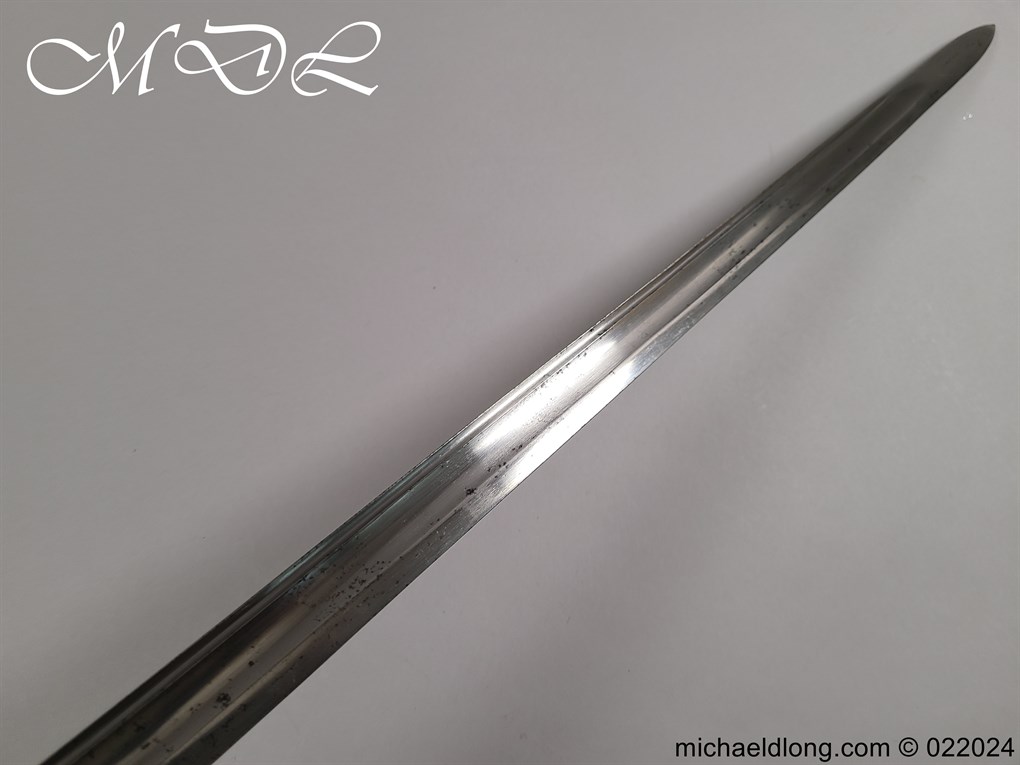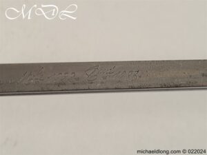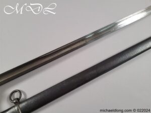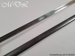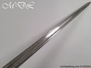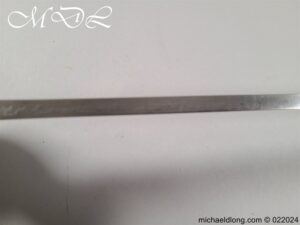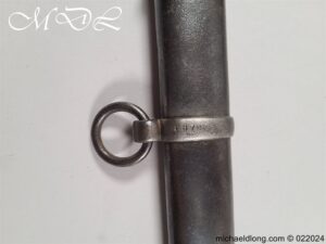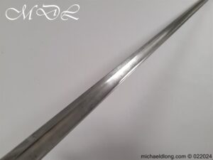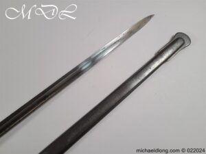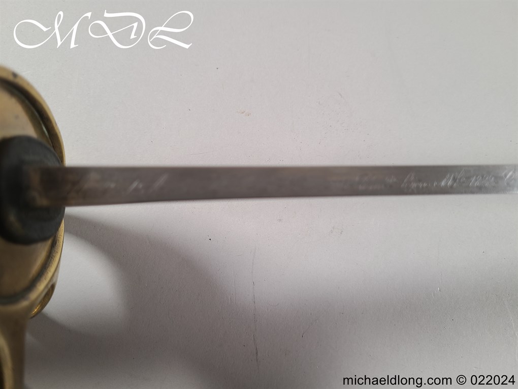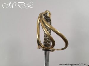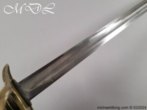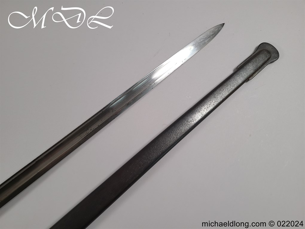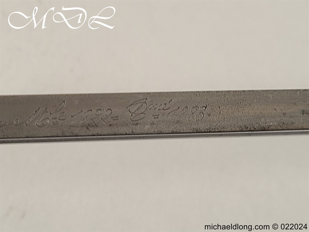 French M 1882 Sabre de Cavalerie Legere, it has a brass hilt with a two bar guard numbered 8702, the wood handle is leather bound with brass wire, it has a straight blade which is in very good condition, the spine is engraved with the manufacturer and dated 1885, complete with steel scabbard with single loose rings and matching number to the hilt 8702 . Size: Overall Length 104cm and the blade 87cm