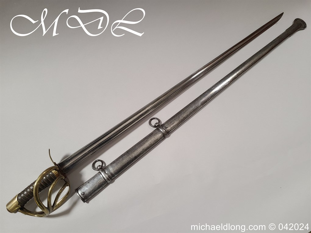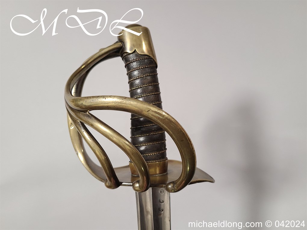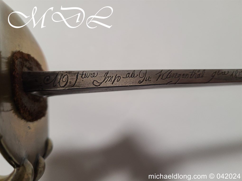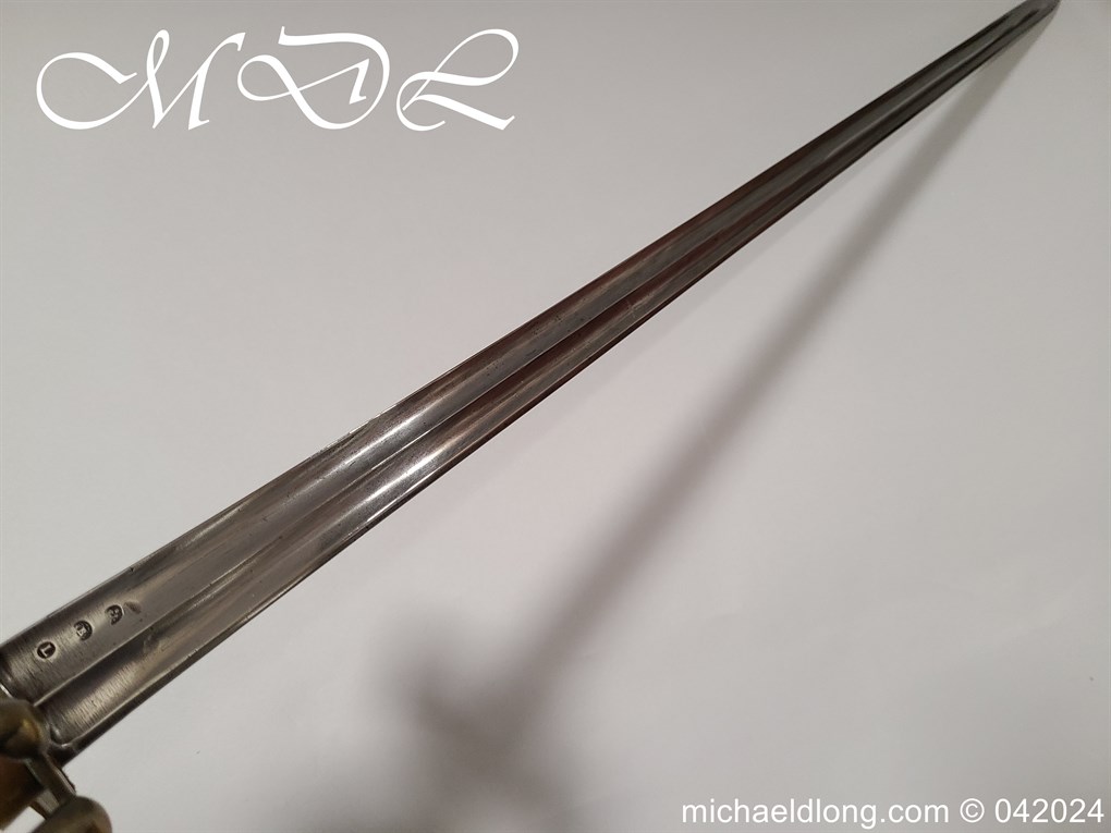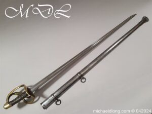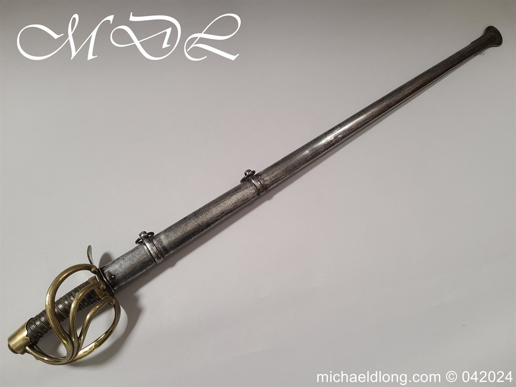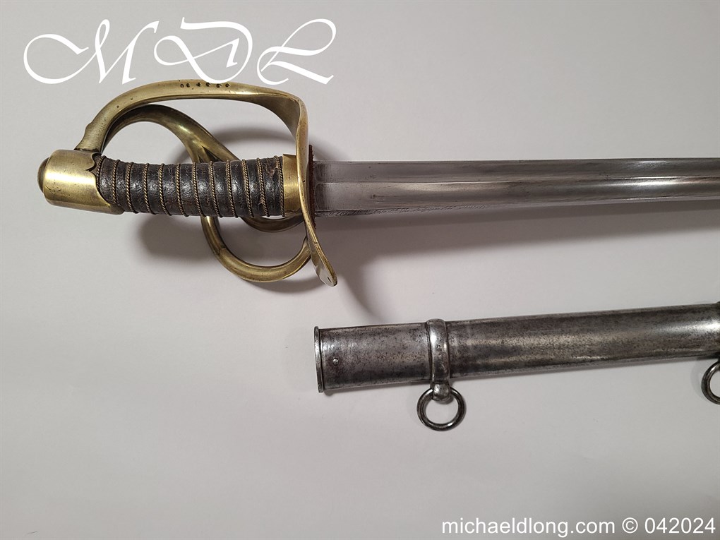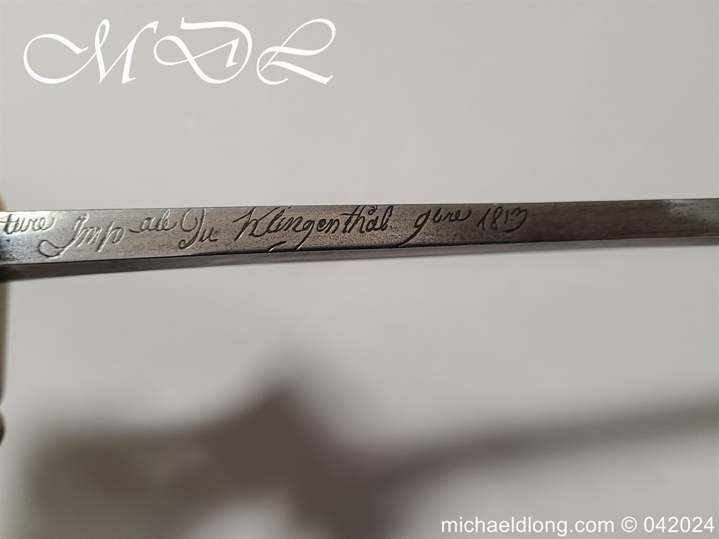 Pre Waterloo period production French Cuirassier Heavy Cavalry Sword, brass hilt with inspection stamp and numbered 90 and original leather grip secured by wire binding. The blade with original hatchet point, inspectors’ stamps and the spine marked Klingenthal and dated June 1813. The steel scabbard with inspection mark to drag and with two loose rings. Overall length 113cm the blade 98cm. Please note this a totally original sword in super condition