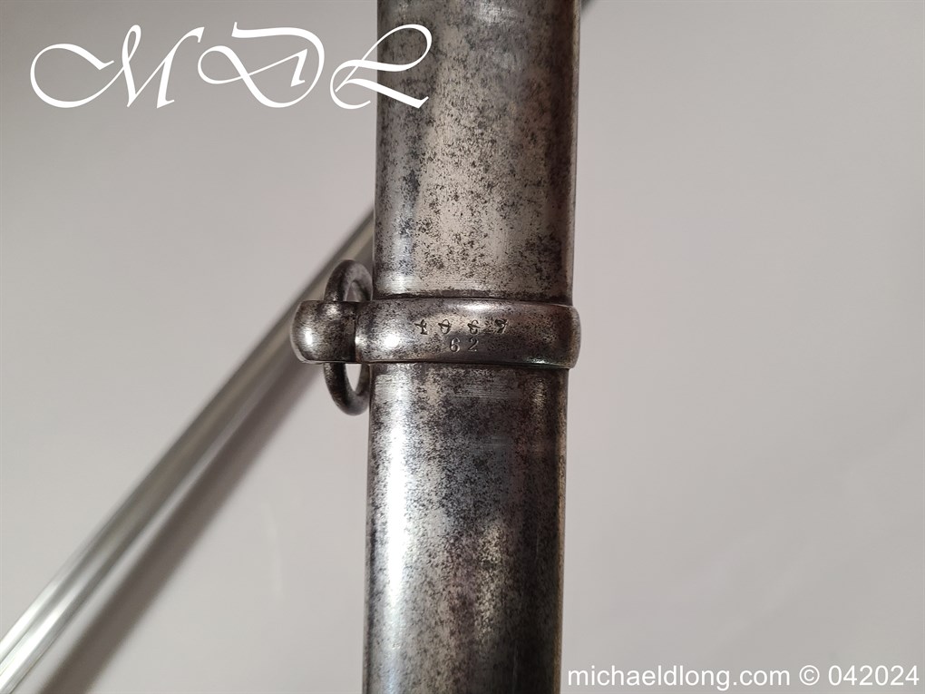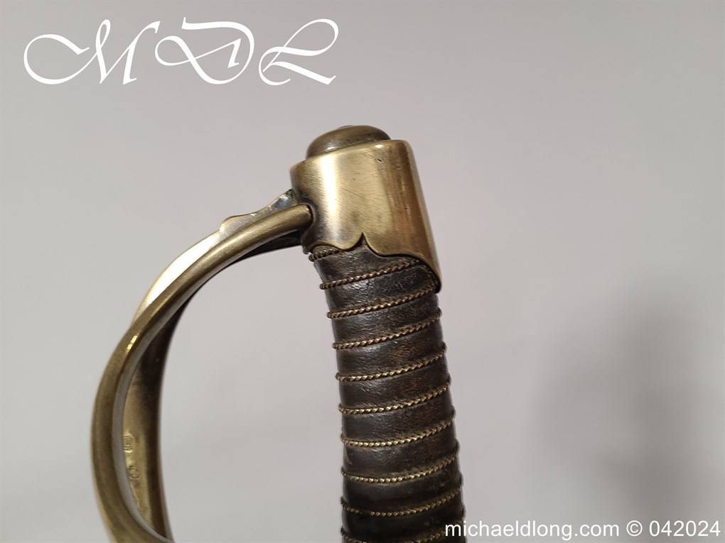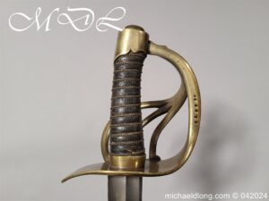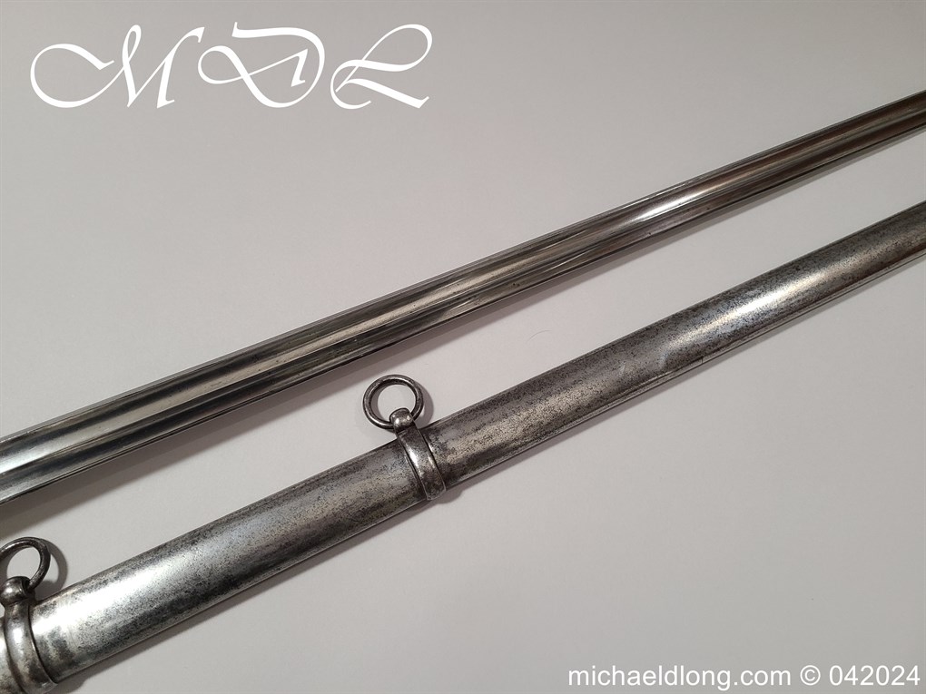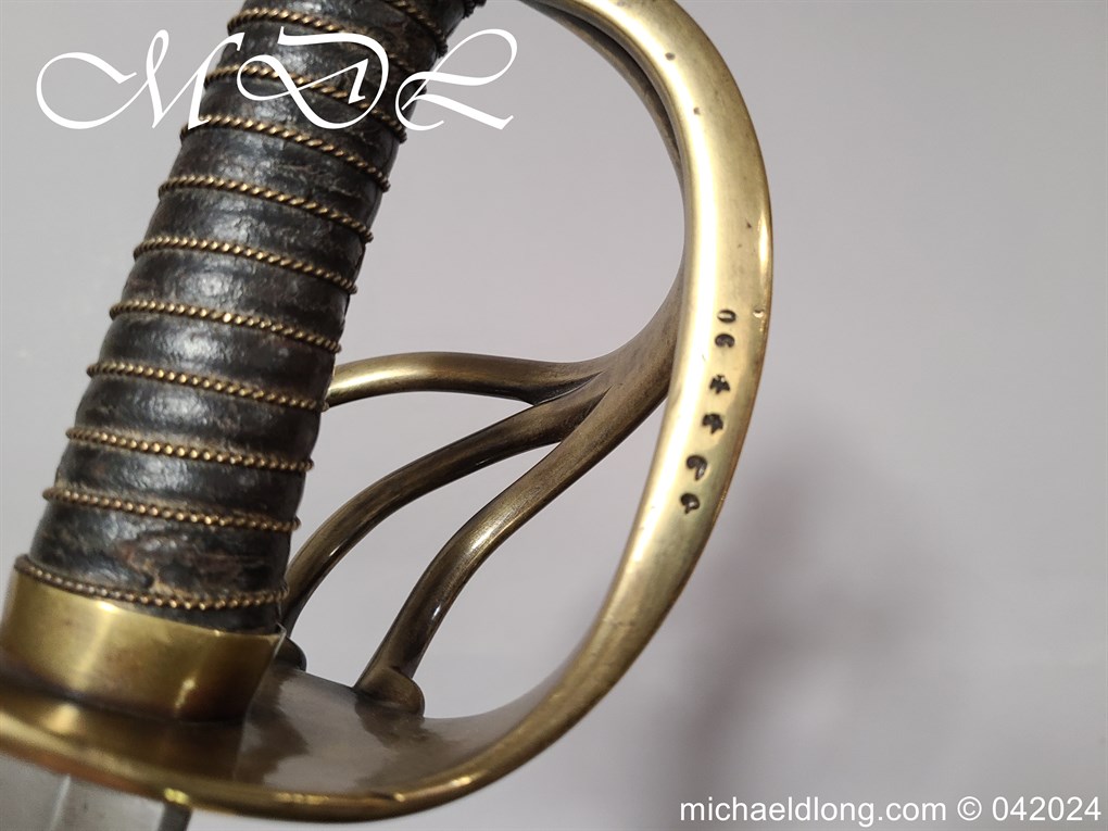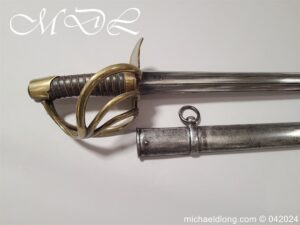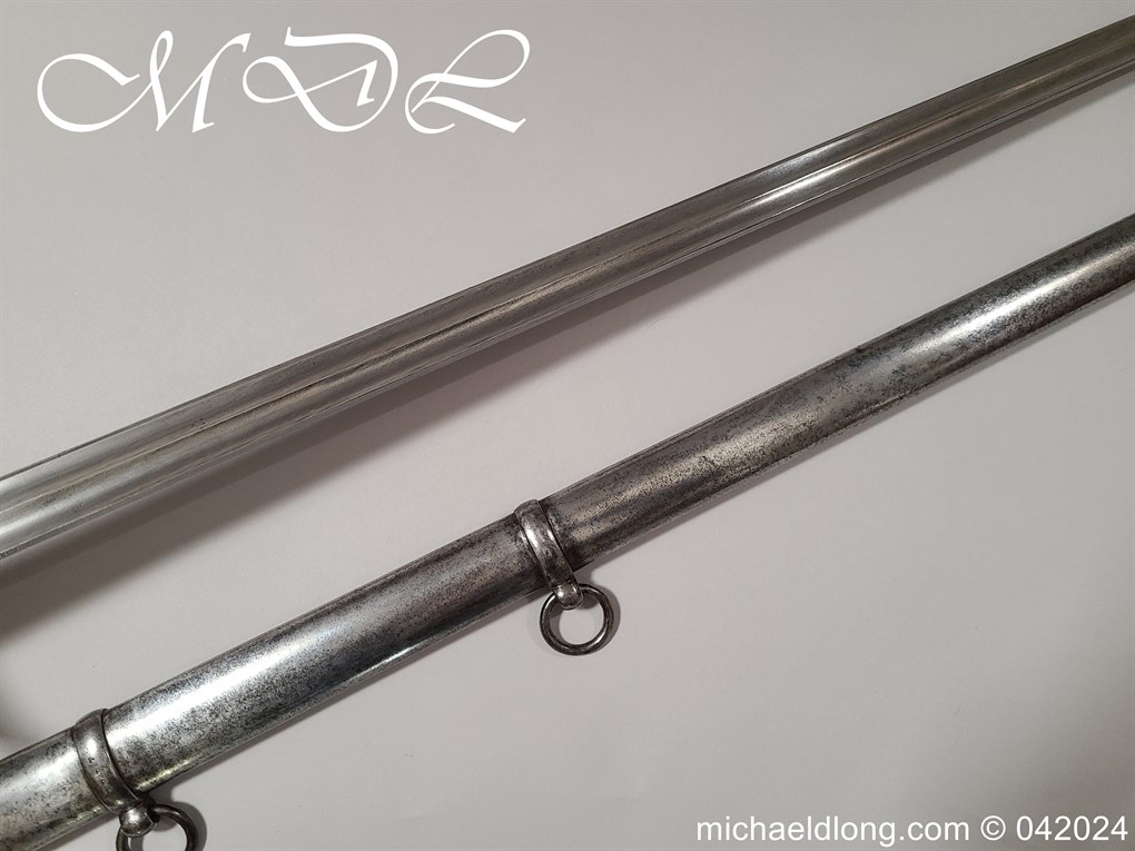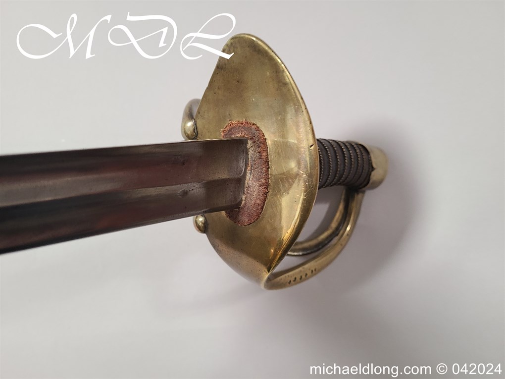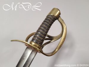 Pre Waterloo period production French Cuirassier Heavy Cavalry Sword, brass hilt with inspection stamp and numbered 90 and original leather grip secured by wire binding. The blade with original hatchet point, inspectors’ stamps and the spine marked Klingenthal and dated June 1813. The steel scabbard with inspection mark to drag and with two loose rings. Overall length 113cm the blade 98cm. Please note this a totally original sword in super condition