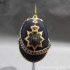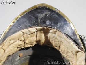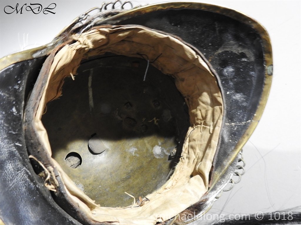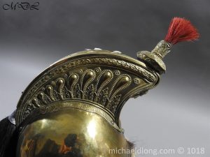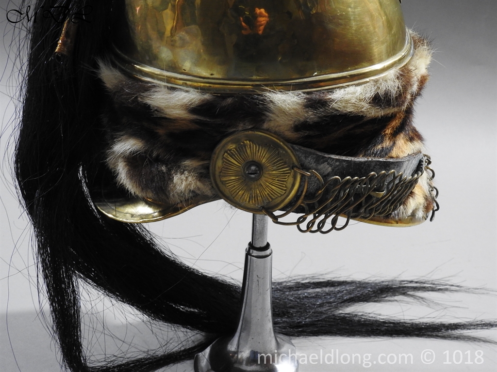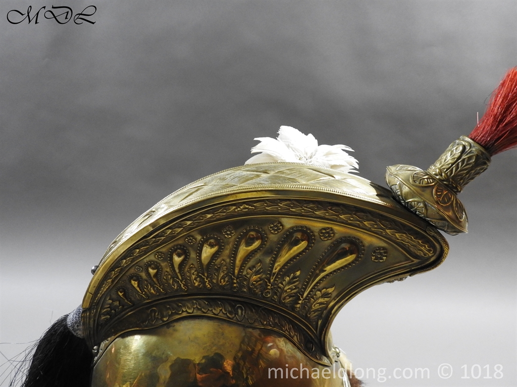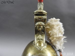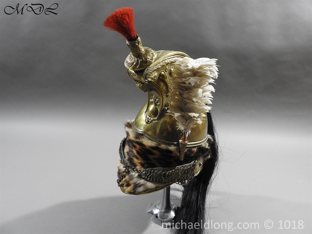 The helmet brass skull and edging to the peaks and fur turban to the body. A brass top crest which is decorated to the sides with volutes and laurel leaves, the front with a medusa head above a flaming grenade, surmounted by an ornate brass holder that contains a short red horsehair brush, a long black horsehair tail hangs from the rear of the comb and white feather side plume. It retains the original chin chains and bosses, and remains of leather and padded liner, some wear but in overall good condition