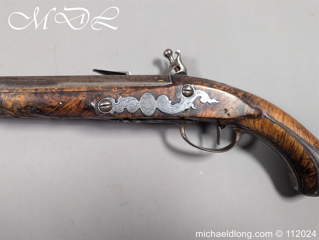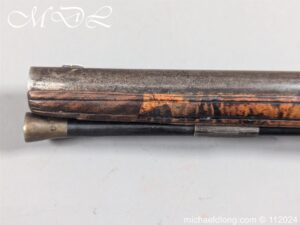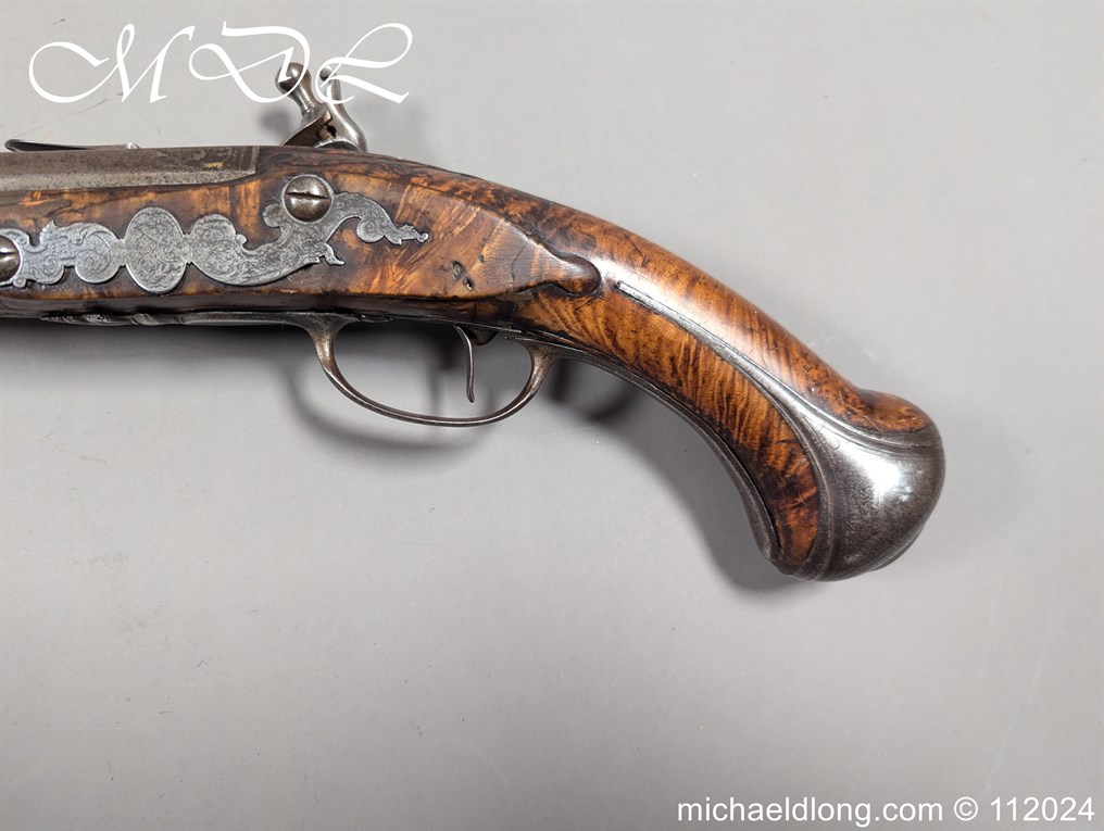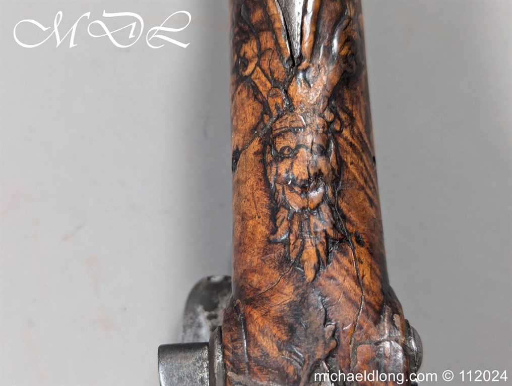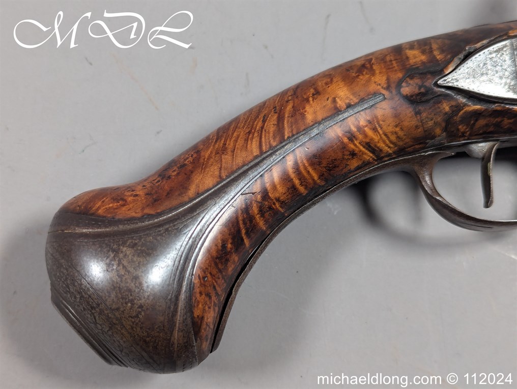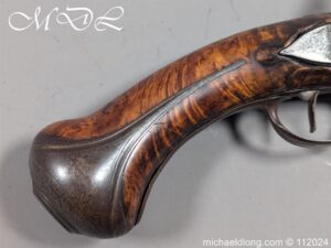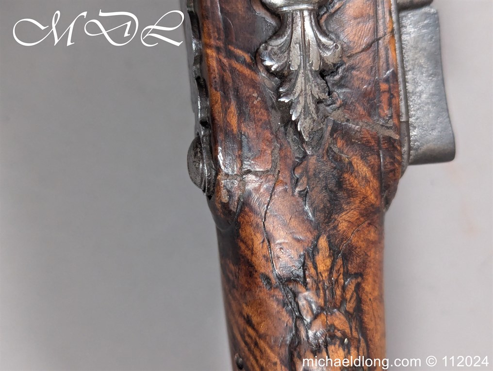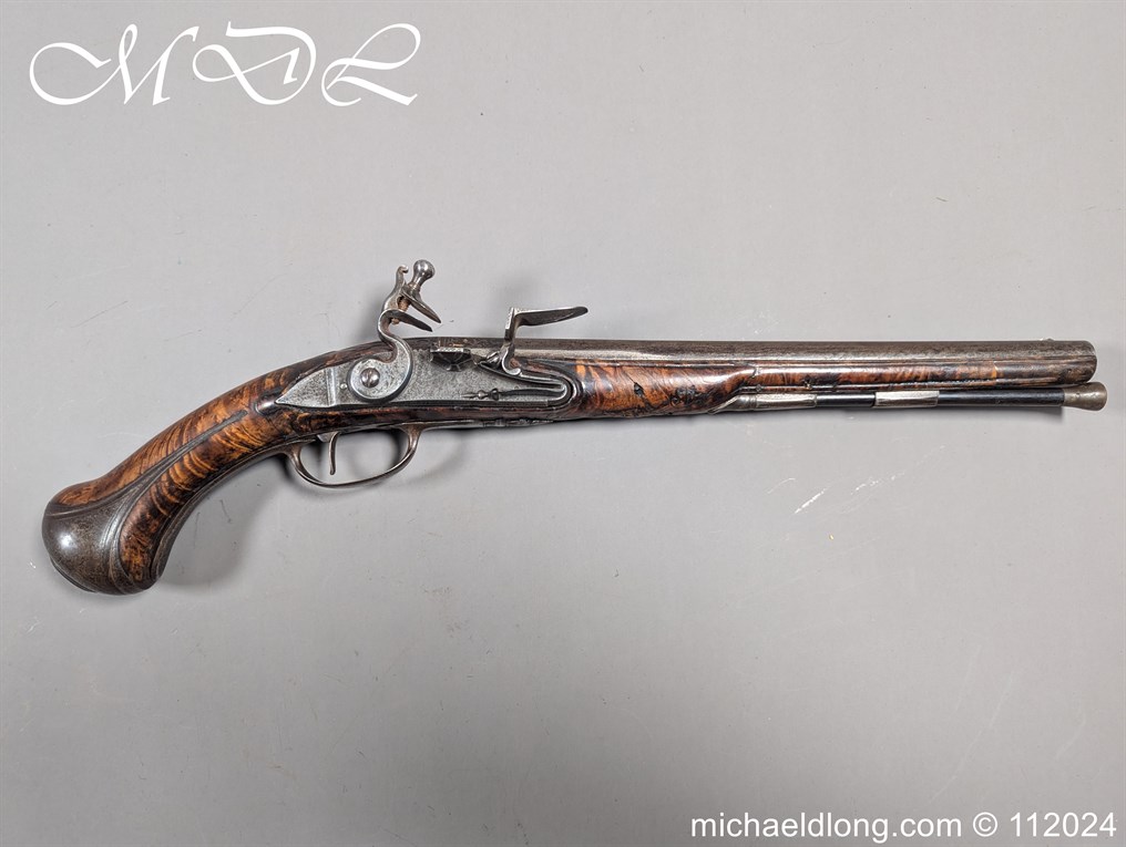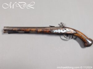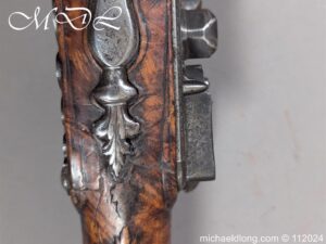 French Flintlock Pistol by Martin of Angers c 1690 Very early pistol Martin is recorded in Angers between 1680 and 1710, but his Christian name is not known. Angers was one of the principal provincial gun making centres – other significant Angers gunmakers were Boular, Bleiberg and Pierre Monlong. Although the name is very worn you can with a glass make it out. The pistol shows some age repairs to the stock and the barrel markings are also worn but visible please see images. Lock is in good working condition overall length 49cm the barrel 31cm. lease Note UK shipping free the rest of the world at cost.