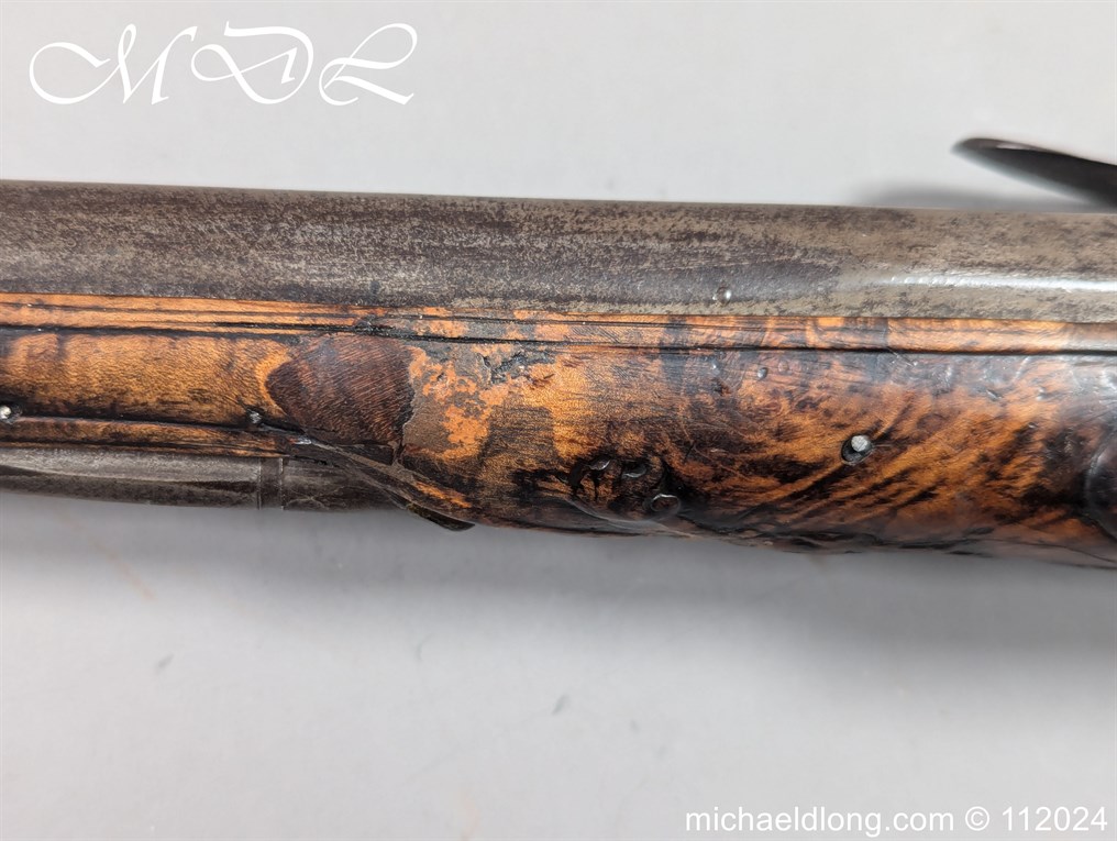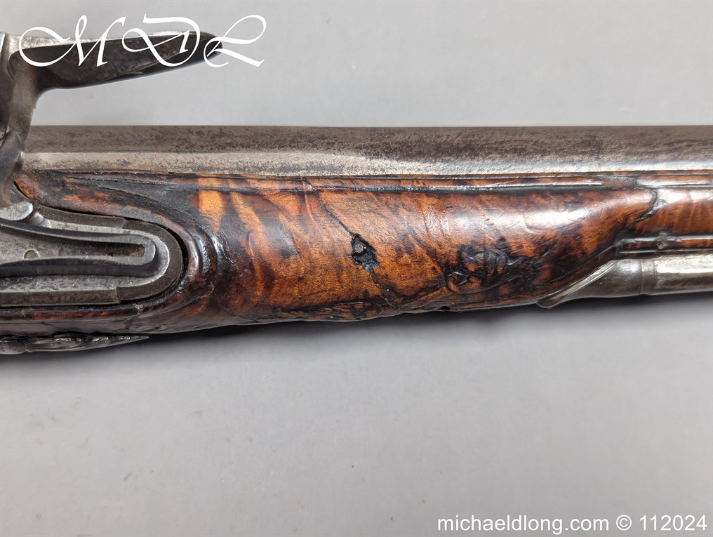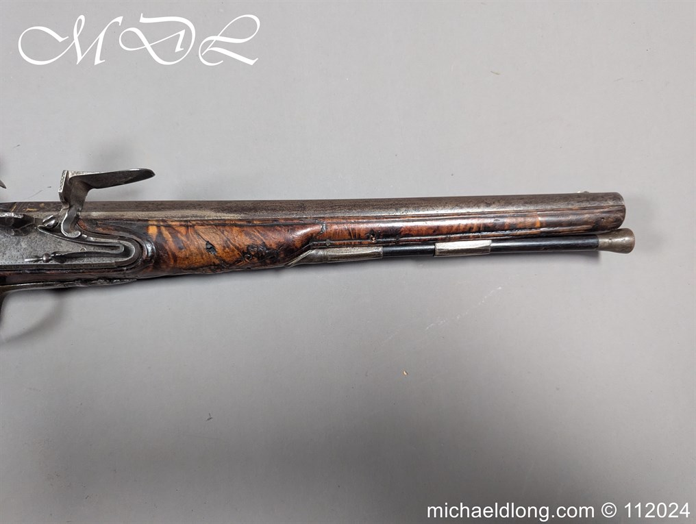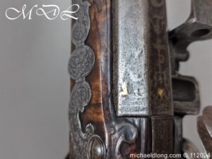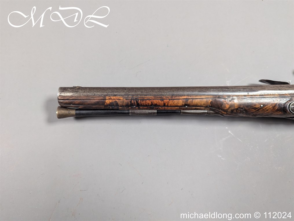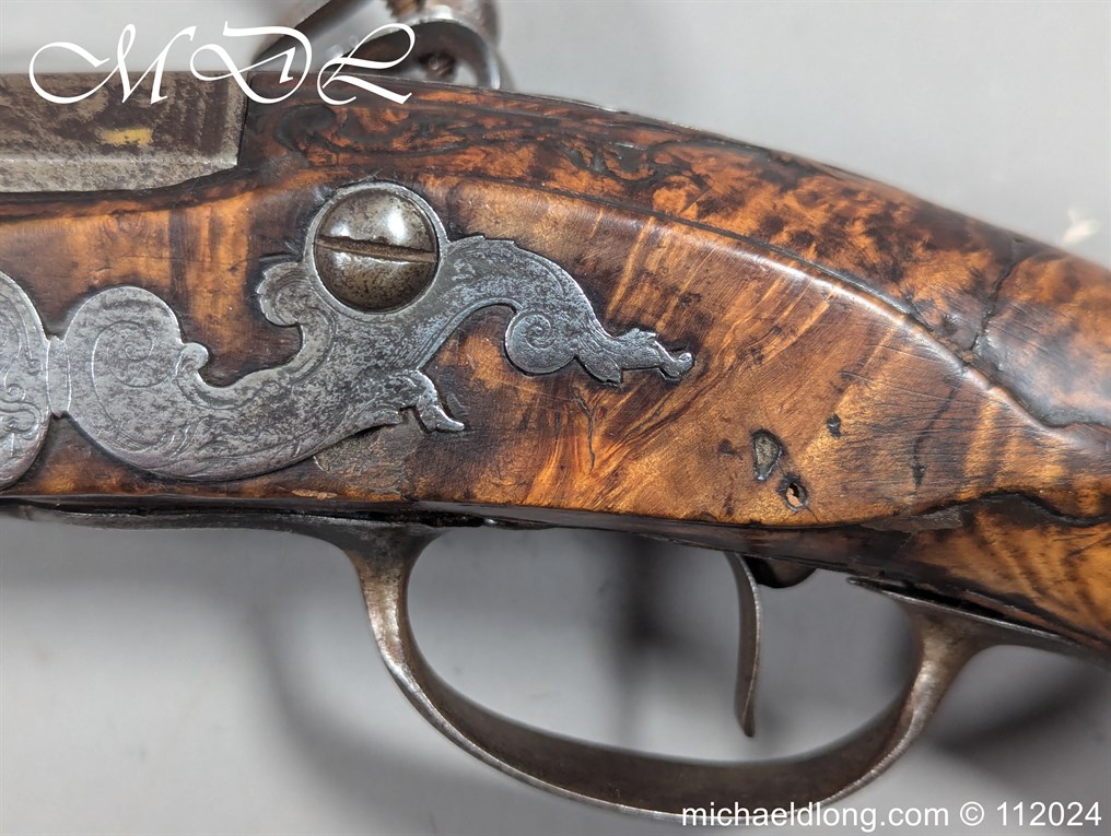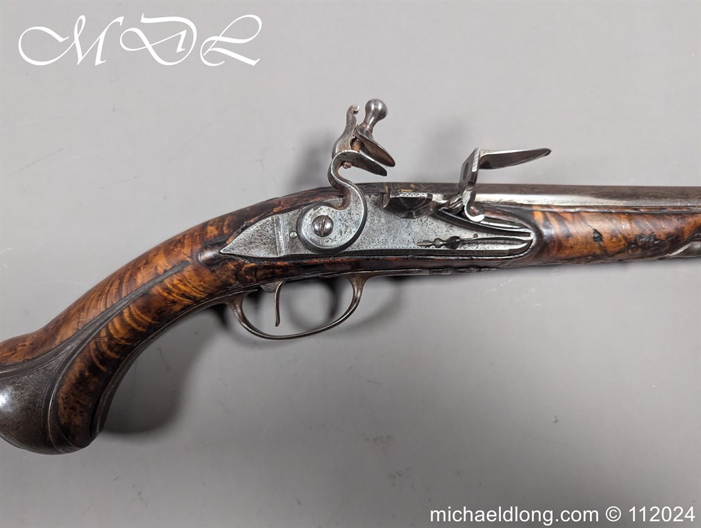 French Flintlock Pistol by Martin of Angers c 1690 Very early pistol Martin is recorded in Angers between 1680 and 1710, but his Christian name is not known. Angers was one of the principal provincial gun making centres – other significant Angers gunmakers were Boular, Bleiberg and Pierre Monlong. Although the name is very worn you can with a glass make it out. The pistol shows some age repairs to the stock and the barrel markings are also worn but visible please see images. Lock is in good working condition overall length 49cm the barrel 31cm. lease Note UK shipping free the rest of the world at cost.